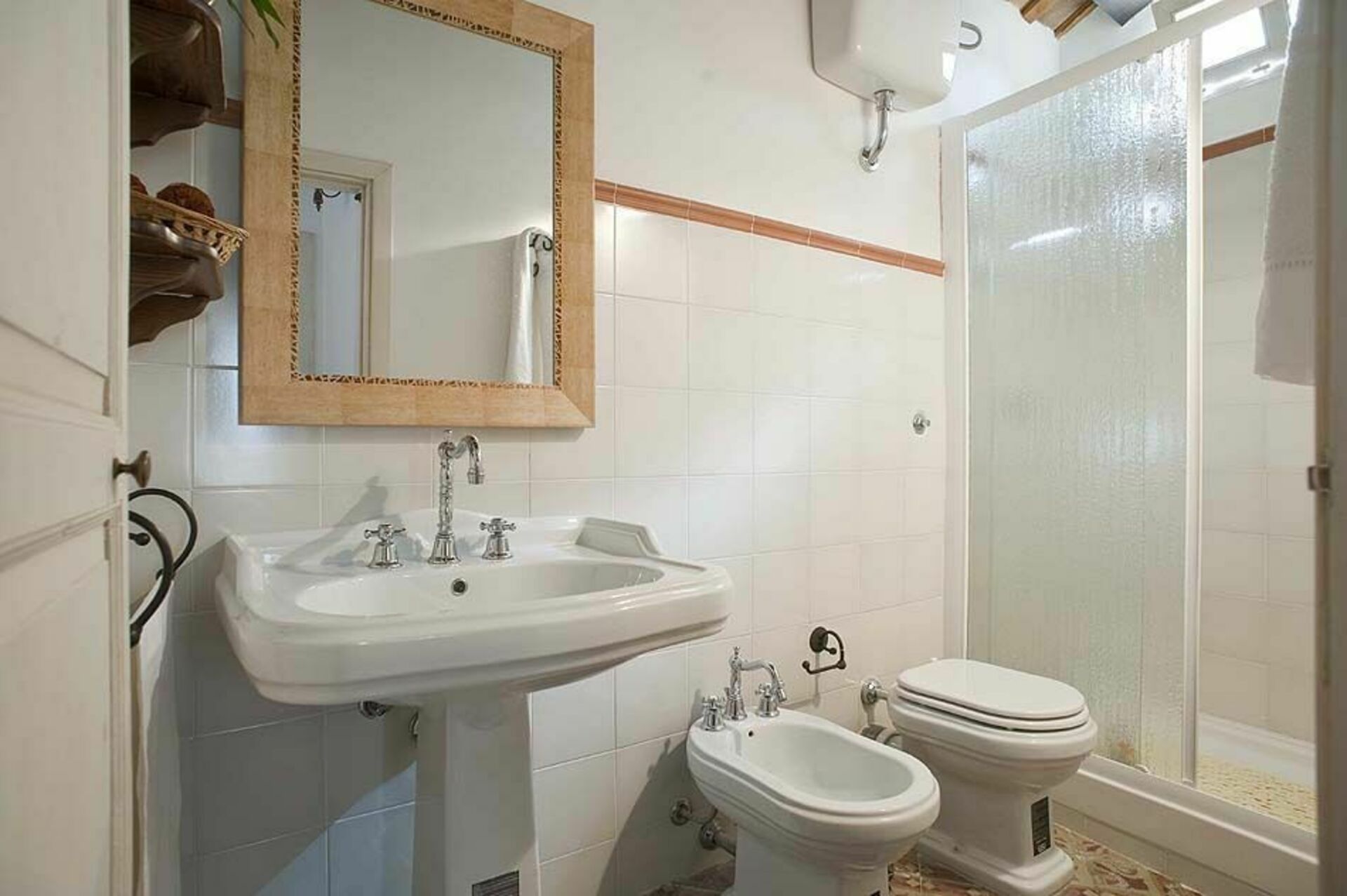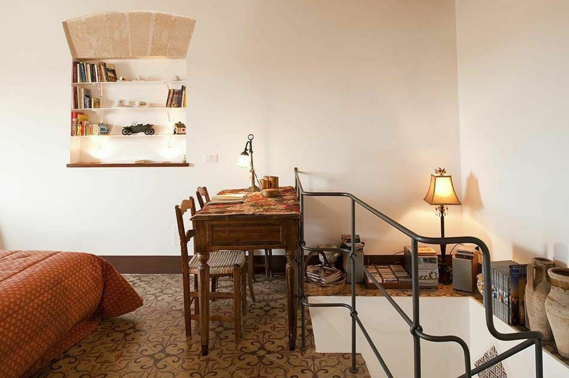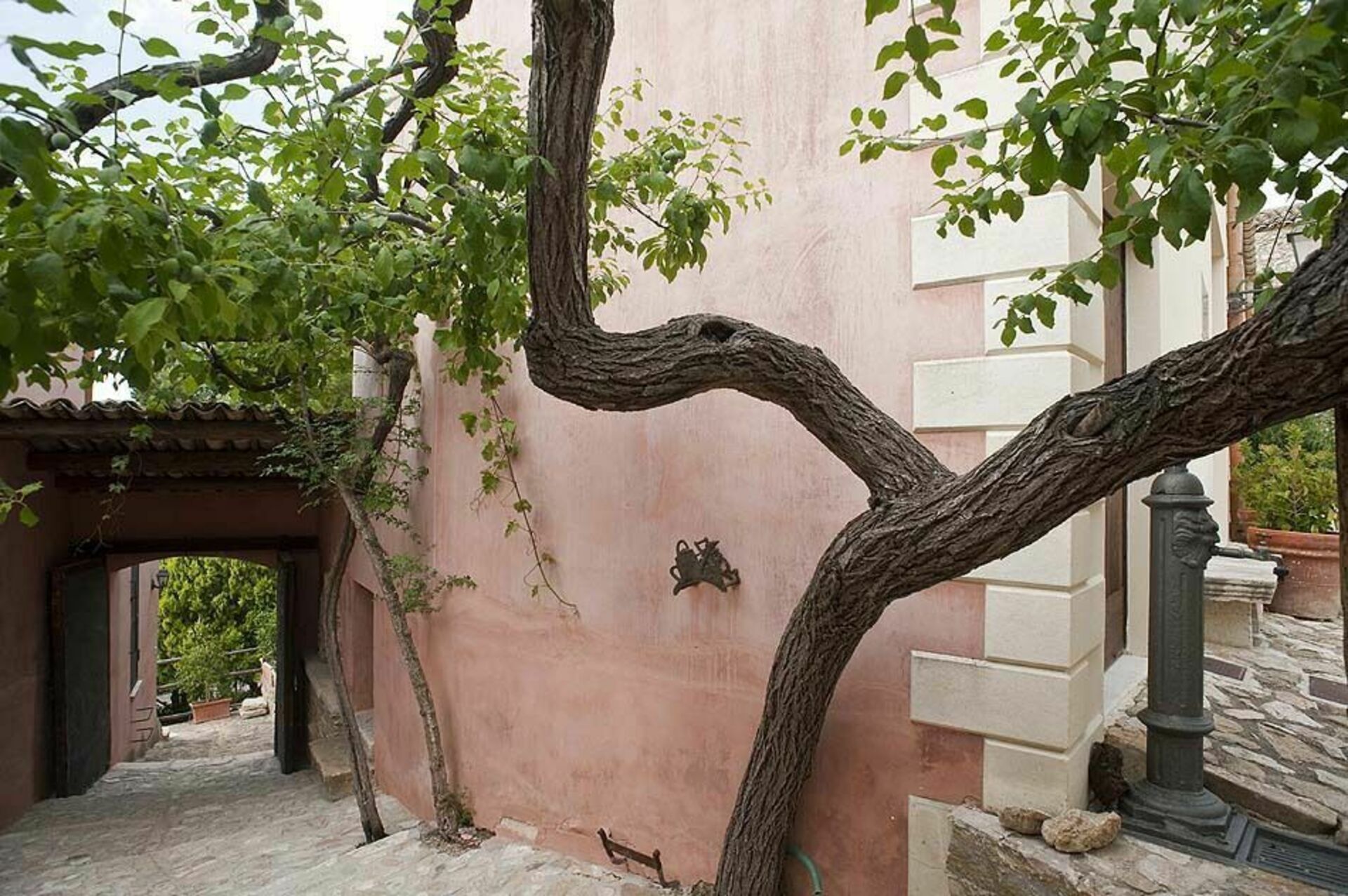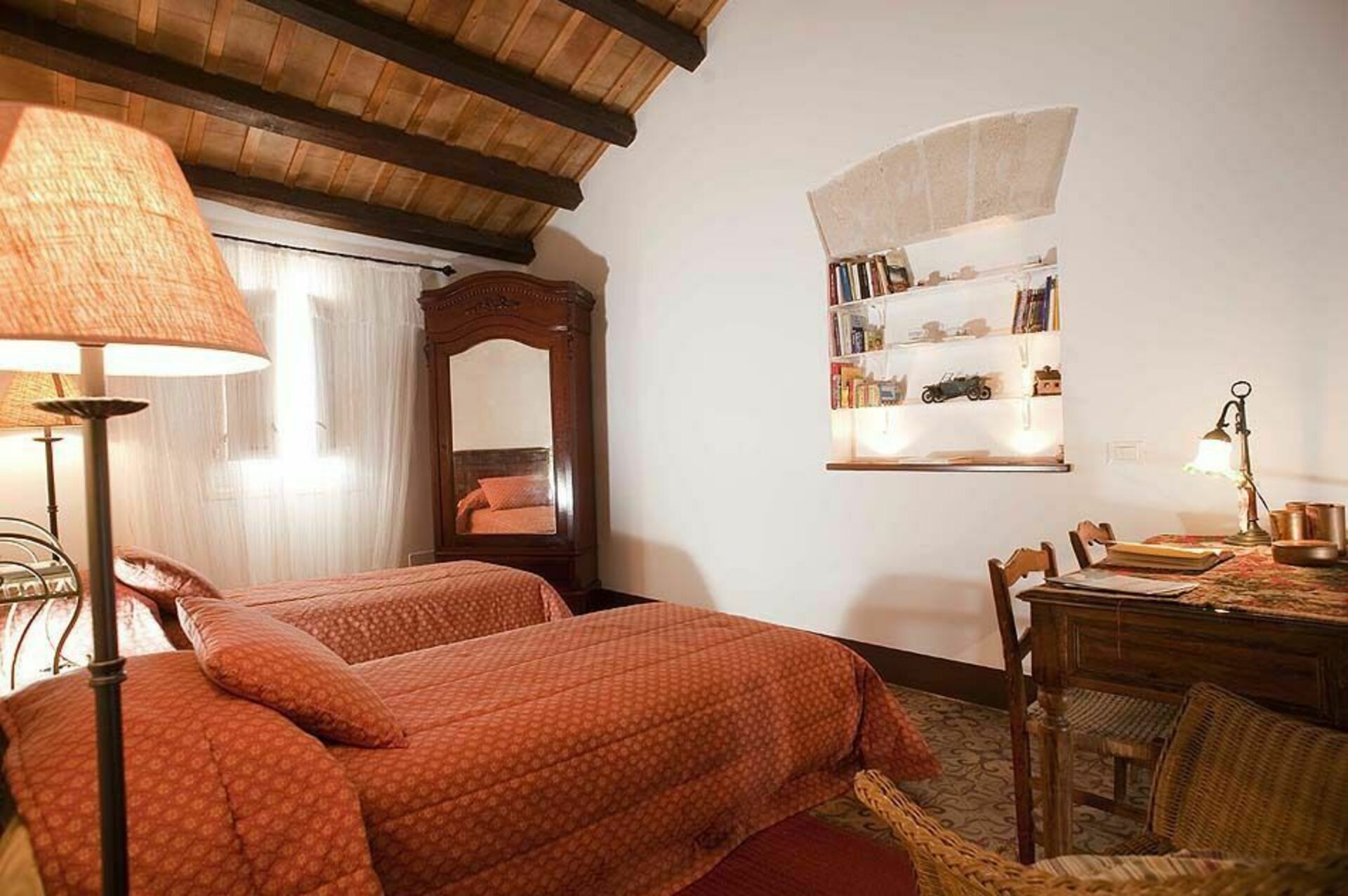 Träbjälkar i taket och tjocka stenväggar, vardagsrum med öppen spis, ett välutrustat kök som vetter mot terrassen, två bekväma dubbelrum, ett genomgångsrum med två enkelsängar och två badrum.