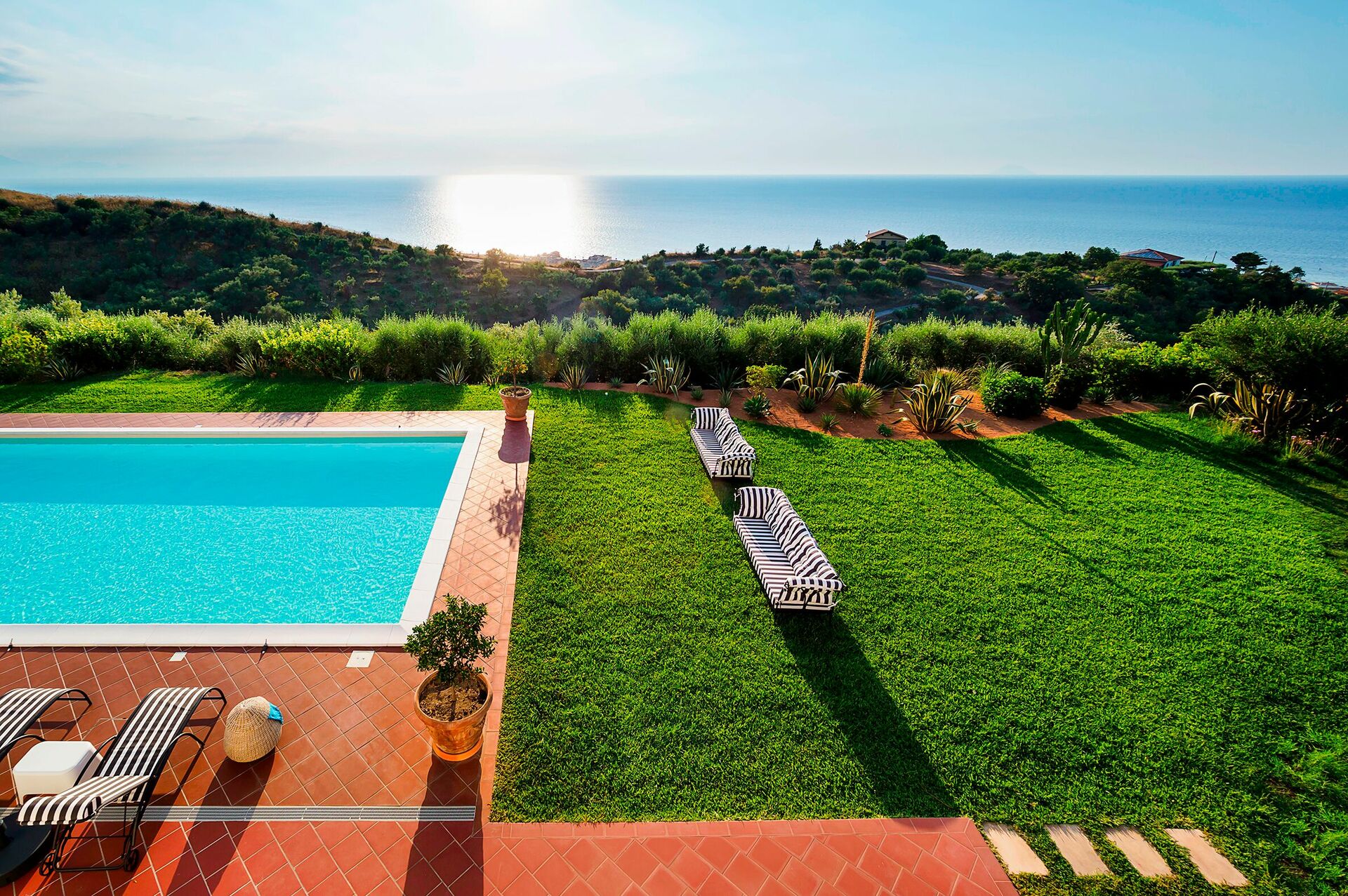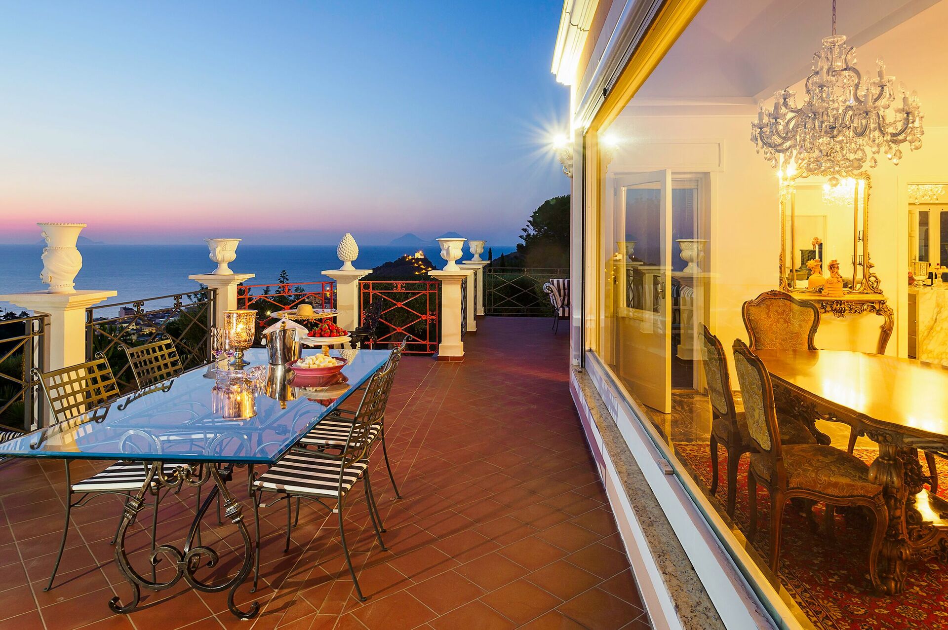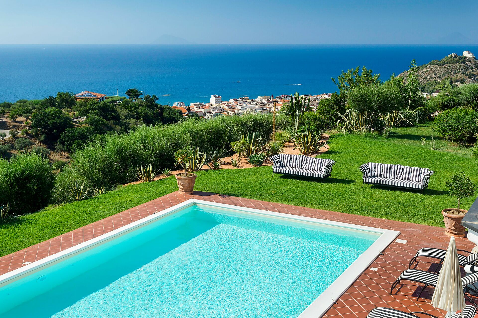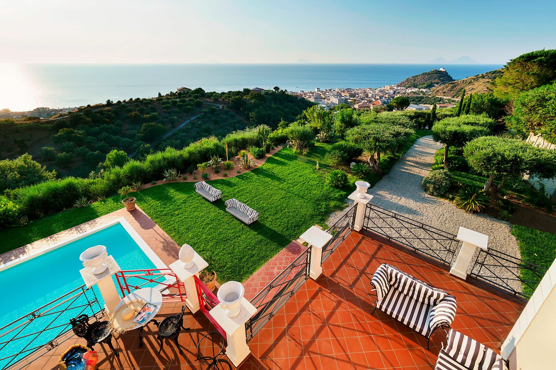 Villa Estella har ett lugnt och soligt läge med panoramautsikt. Från den lummiga trädgården, de rymliga terrasserna och den exklusiva poolen kan du njuta av en förtrollande utsikt över havet och de Eoliska öarna. Solnedgången är särskilt vacker.