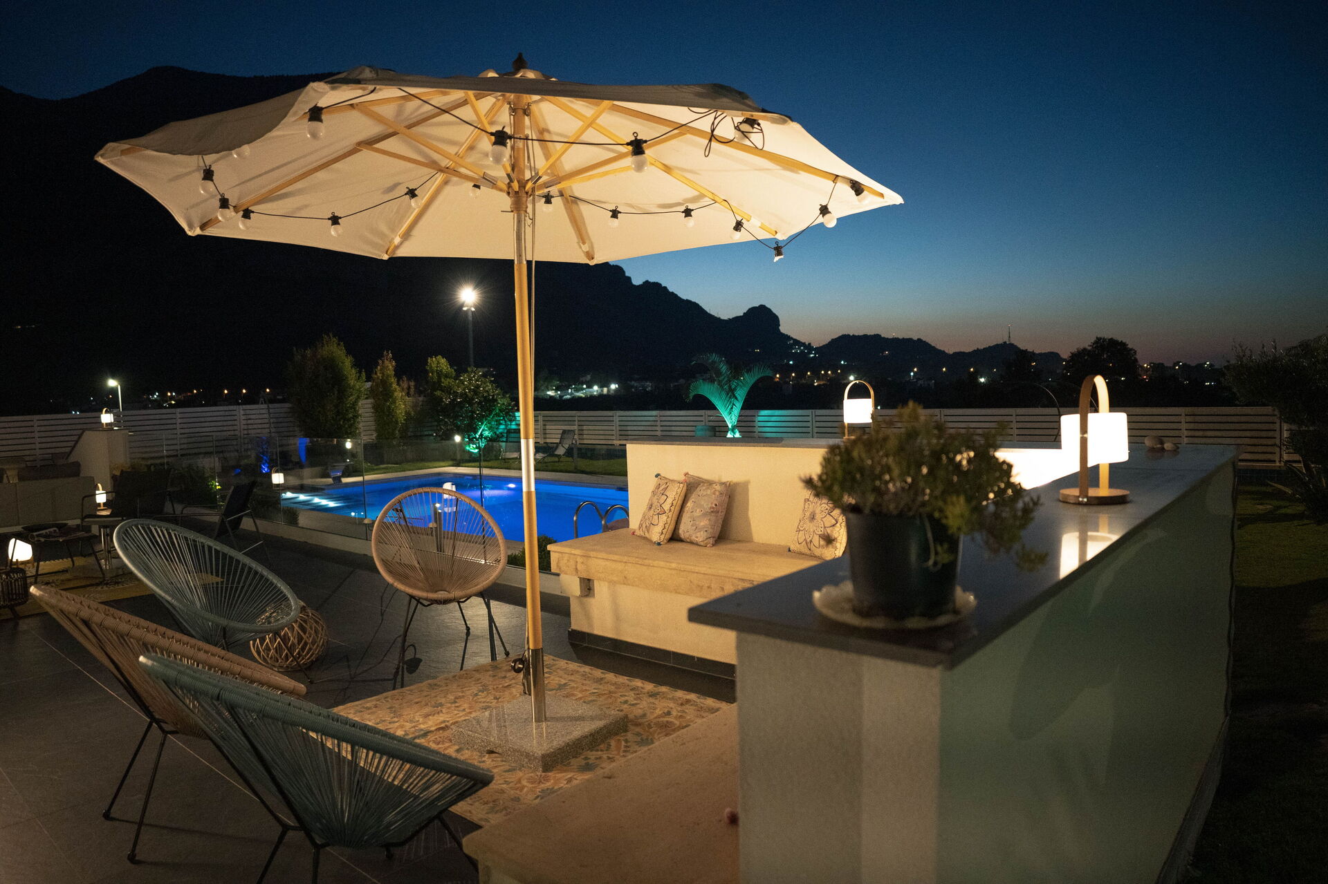 I den välskötta och inbjudande trädgården finns den privata poolen med jacuzzi zon, solstolar och flera chill out-zoner.