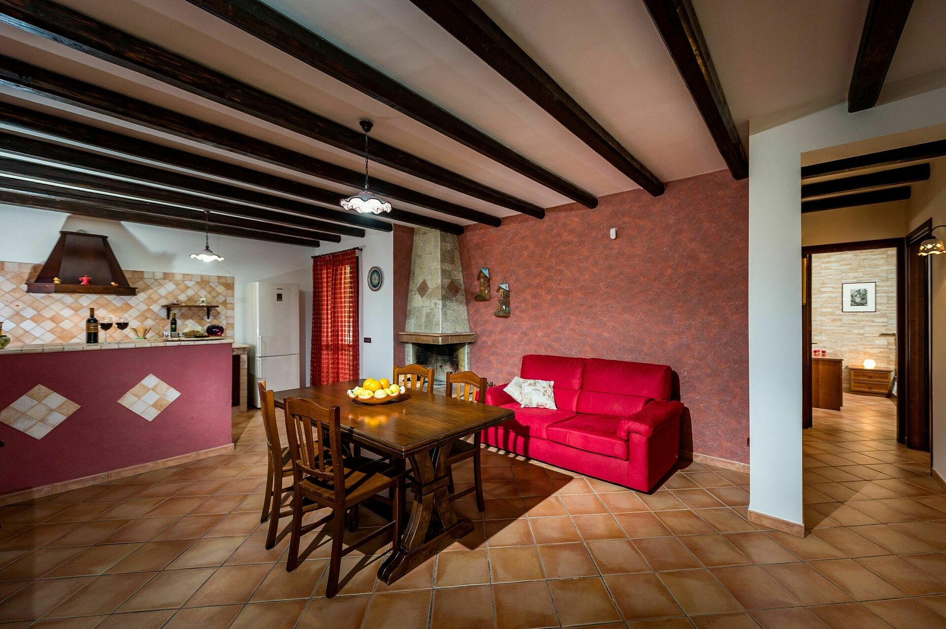 Tillgång från vardagsrum med öppen planlösning med matplats, soffa och öppen spis, inbyggt kök med frukostplats och utrustat (5 brännare, ugn, kyl/frys, etc.)