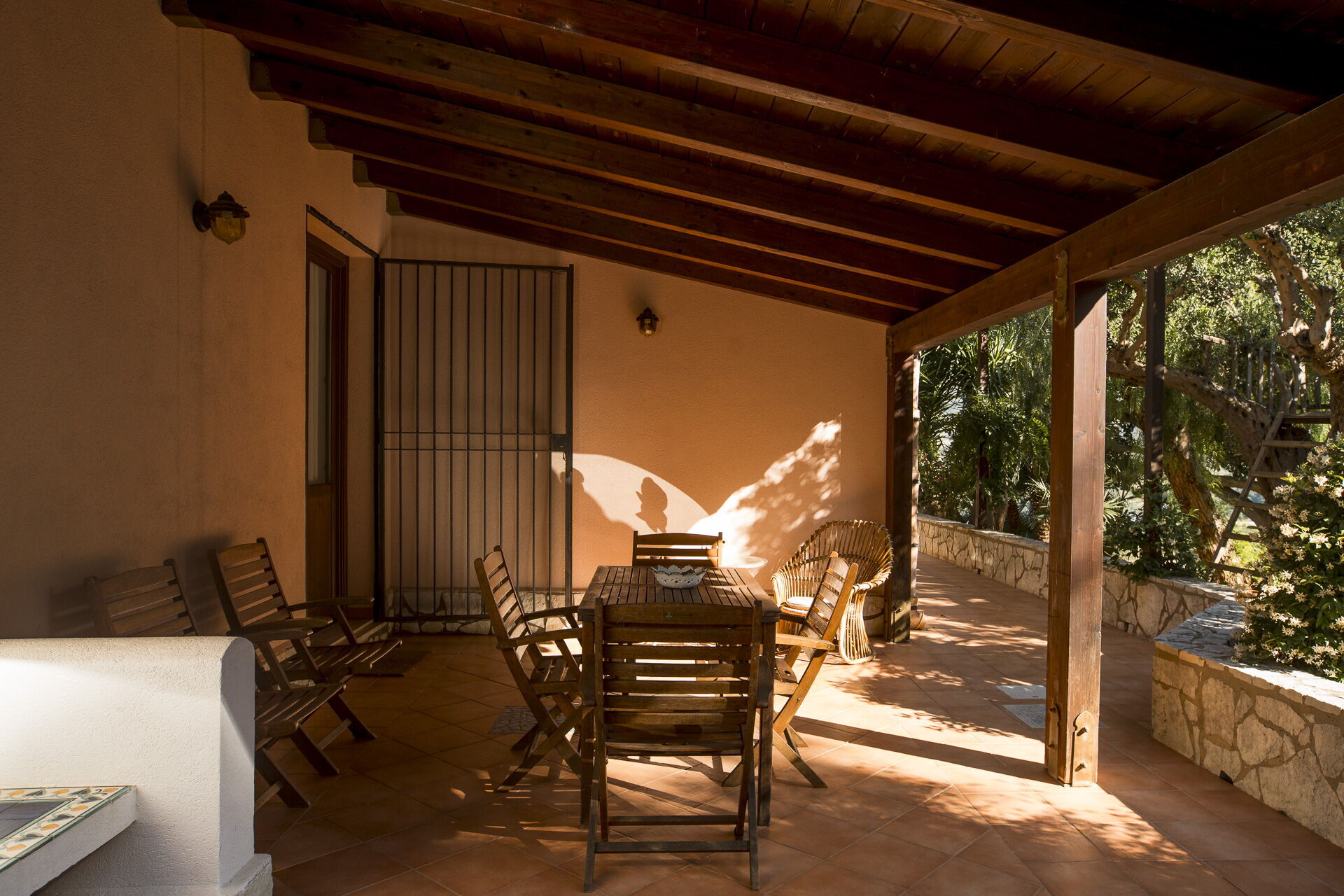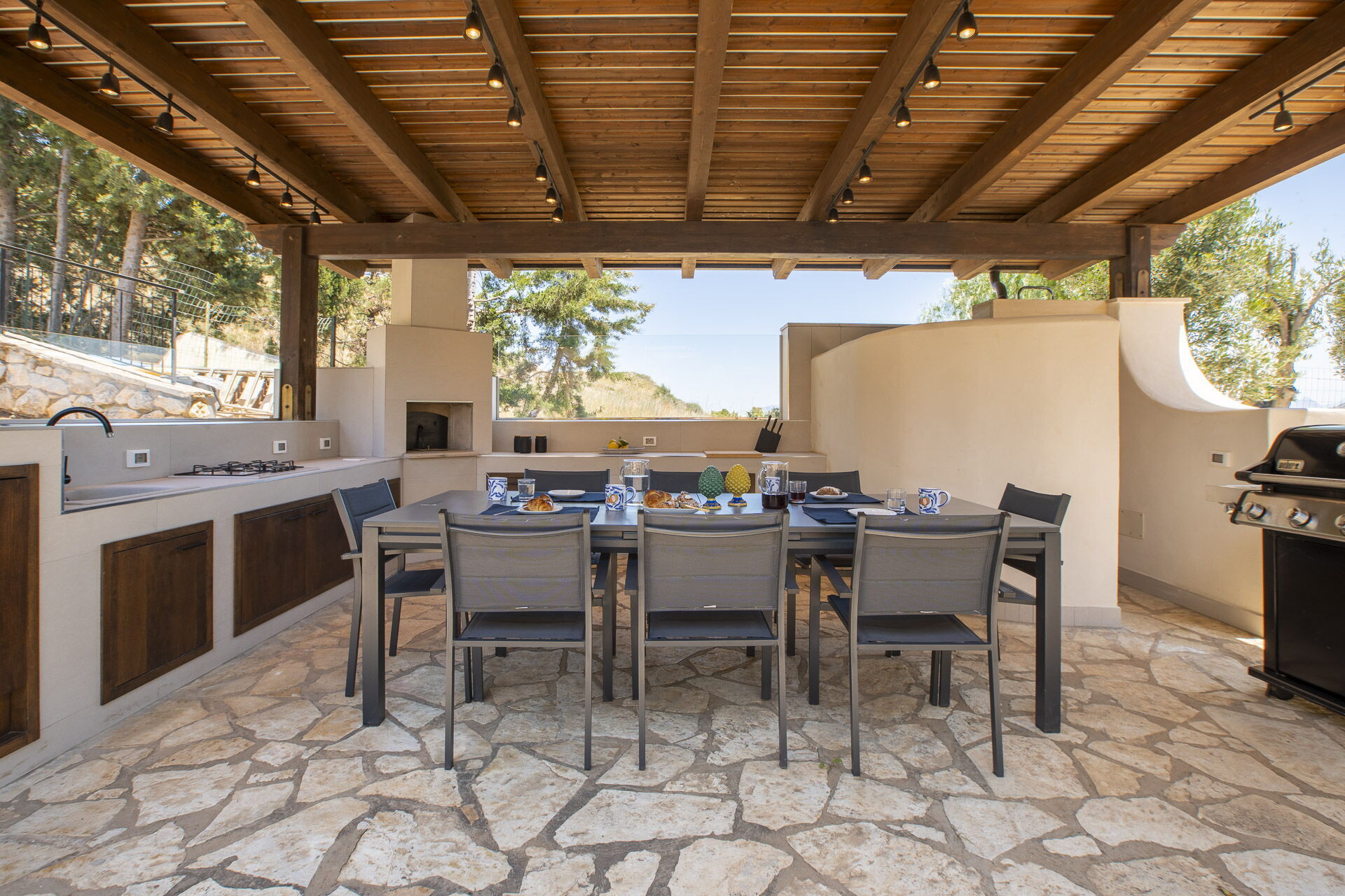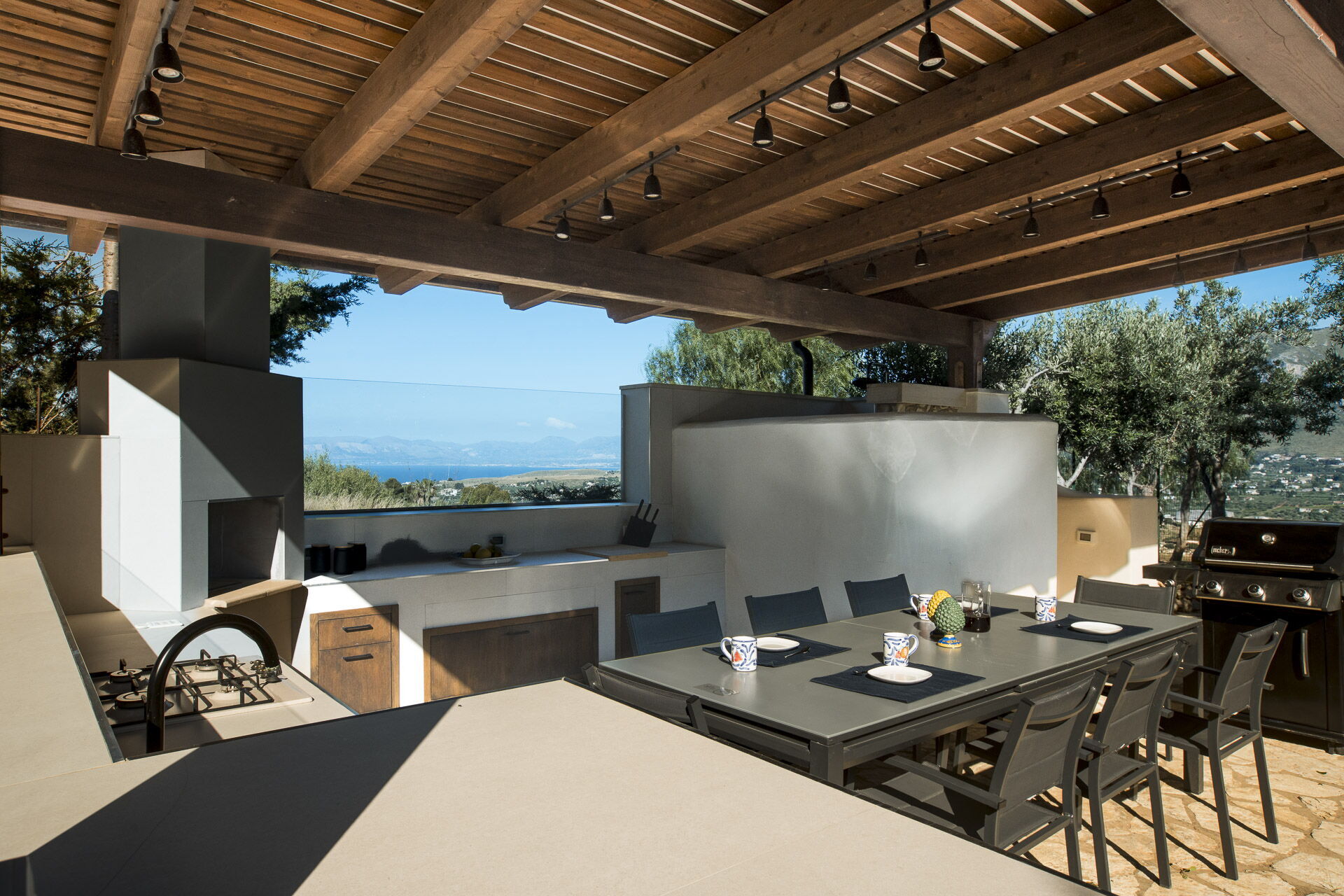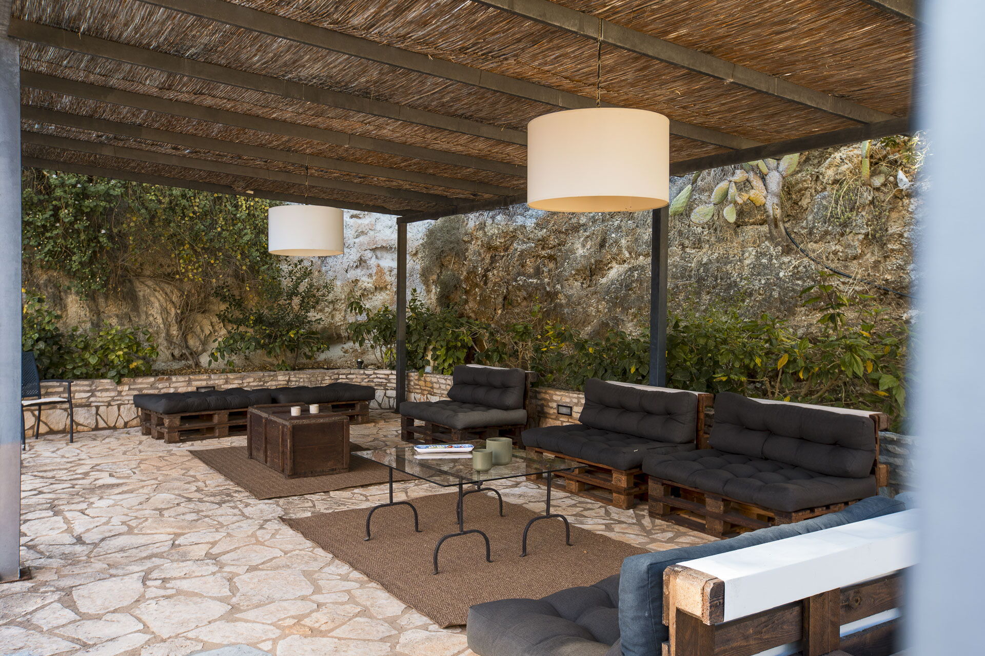 Utanför finns flera lusthus och en täckt veranda, perfekt för uteservering och fastigheten är omgiven av en naturlig oas av medelhavsbuskar, johannesbröd och citronträd.