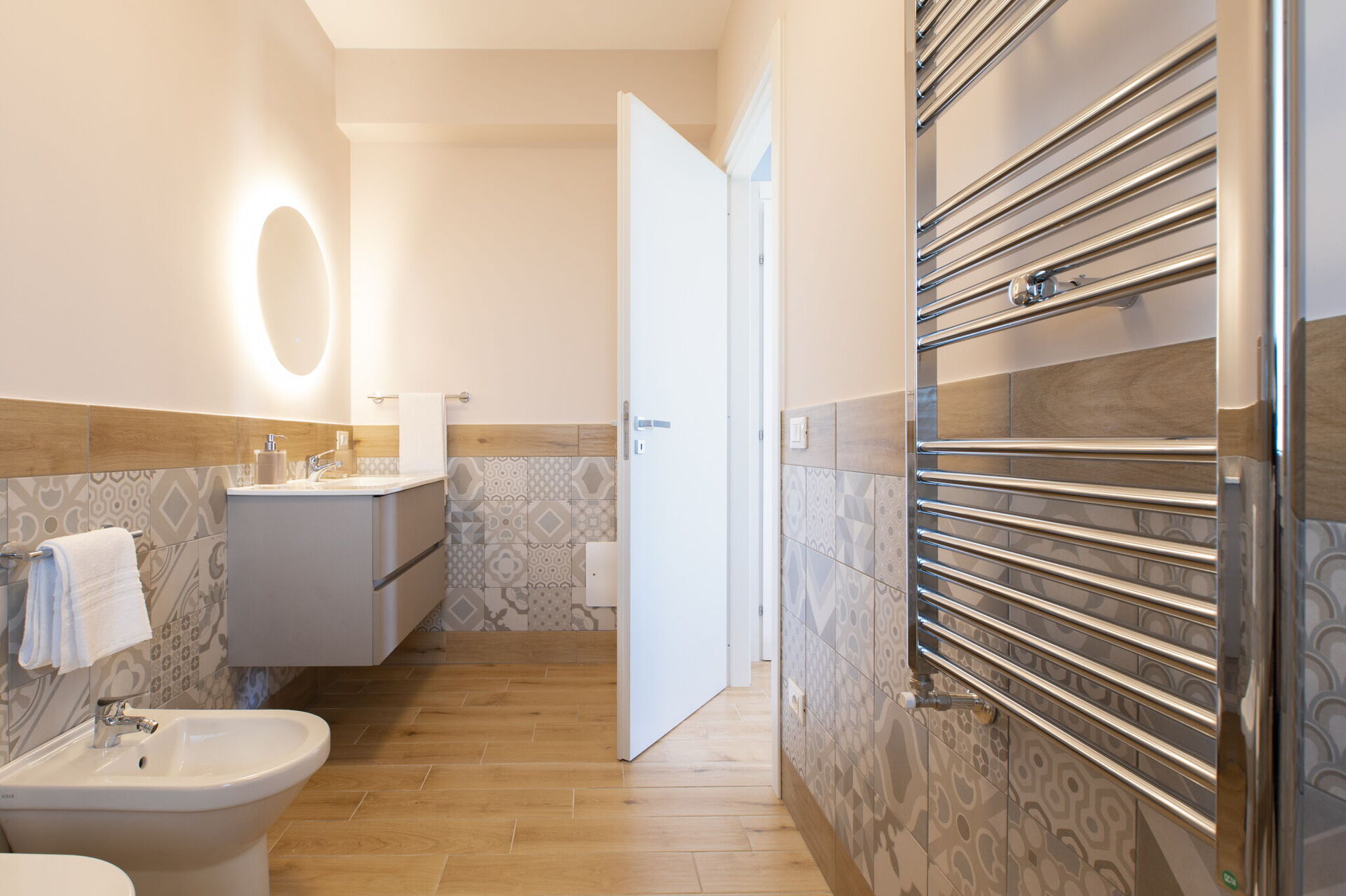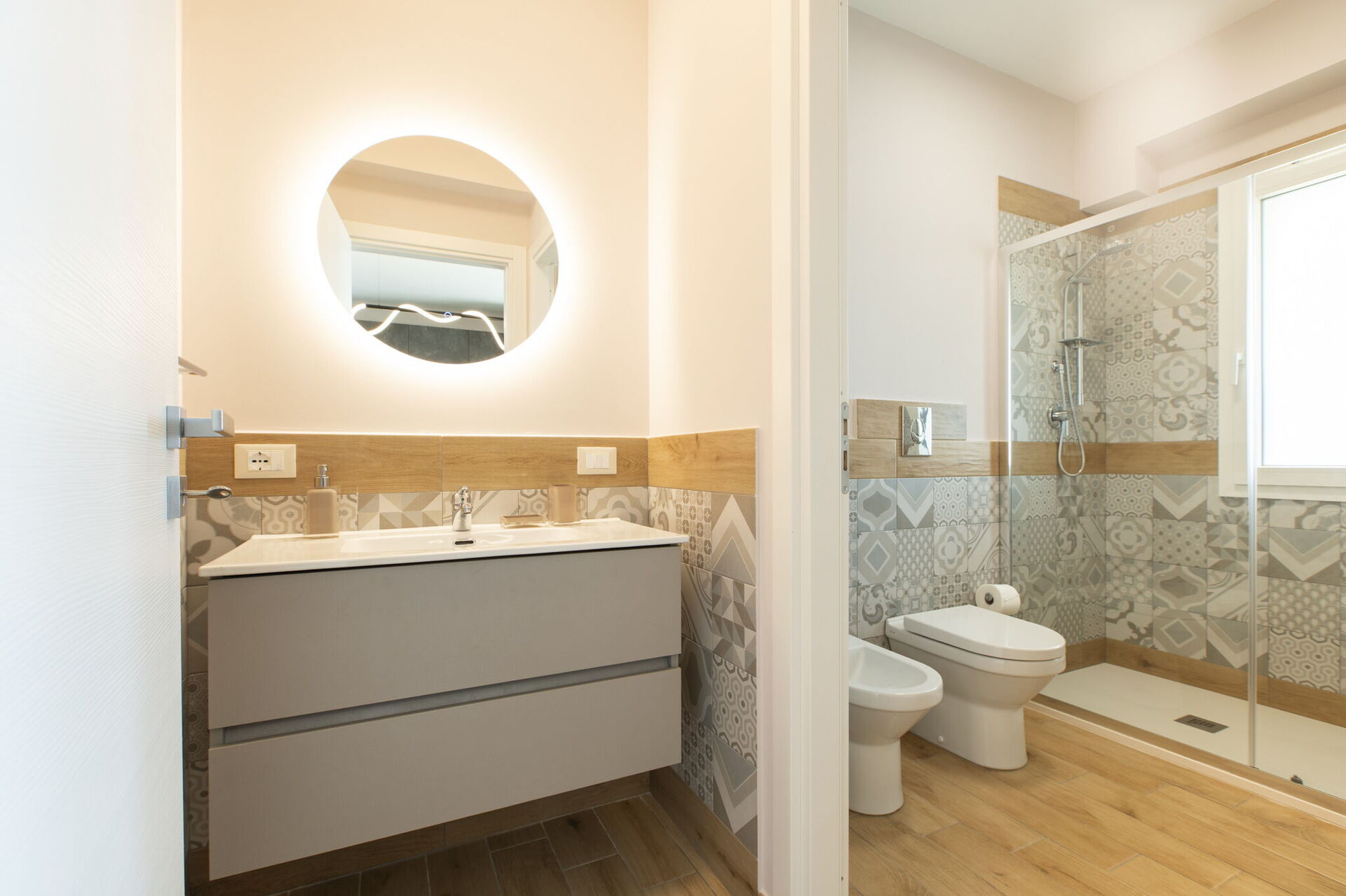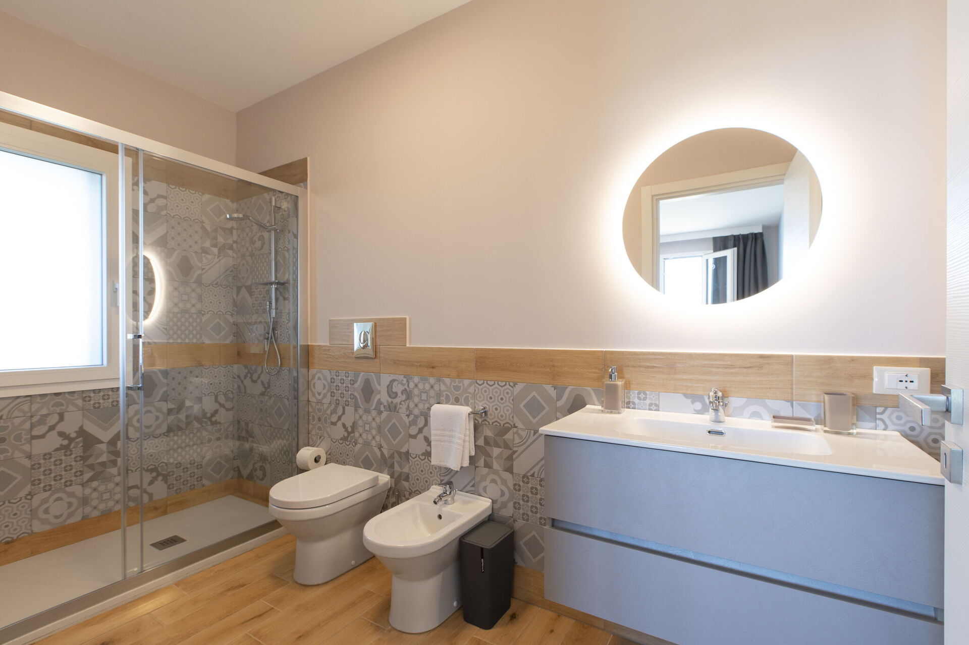 Bottenvåning : stort vardagsrum (smart-TV) med matplats, kök (häll, elektrisk ugn, kylskåp, frys, diskmaskin, mikrovågsugn, brödrost, espressomaskin), 2 dubbelrum, vart och ett med eget badrum med dusch, sovrum med 2 enkelsängar, badrum med dusch.