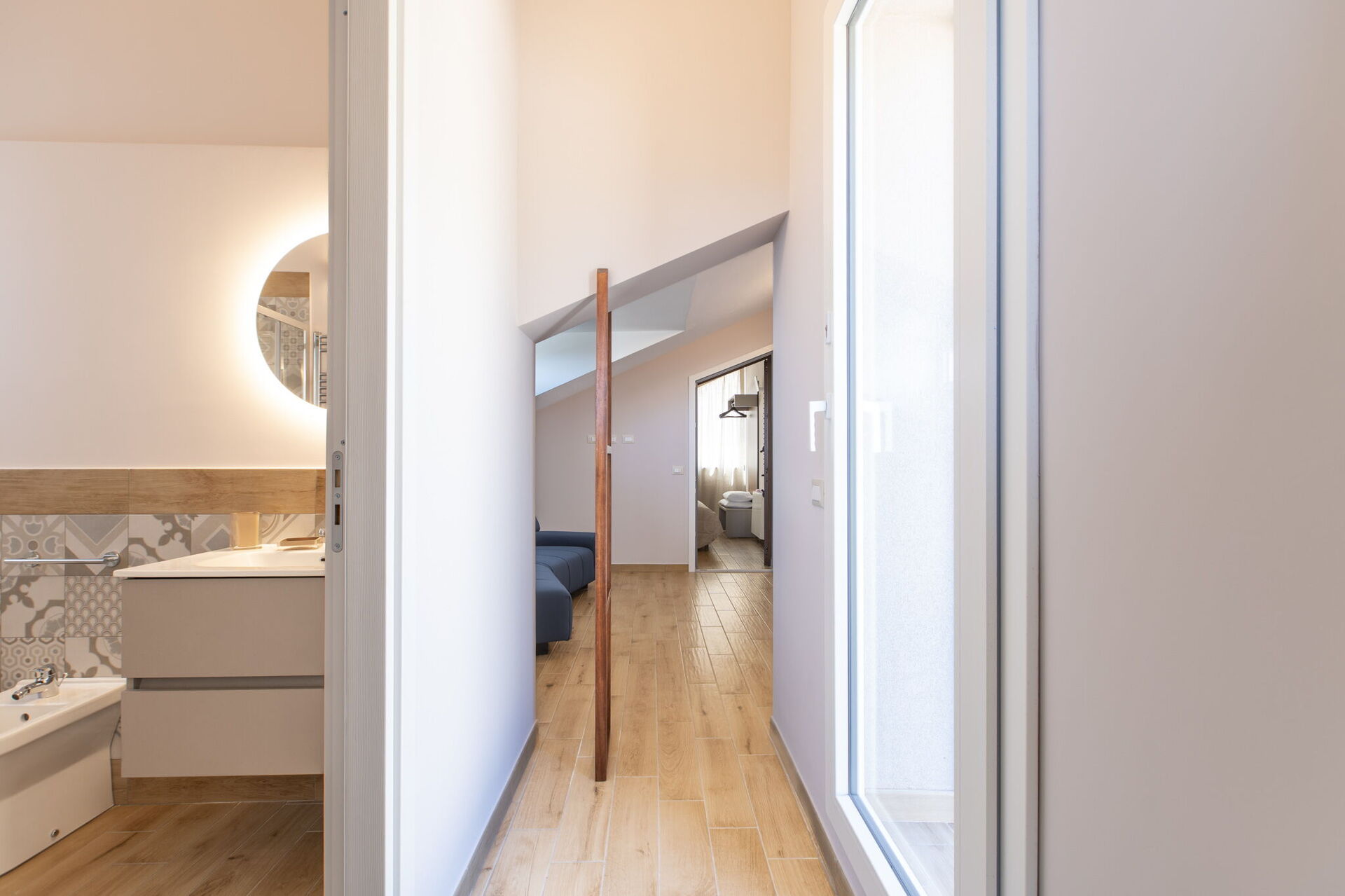 Första våningen : vardagsrum med utgång till solterrass (smart-TV), 2 dubbelrum, badrum med dusch. I vardagsrummet och i ett av sovrummen sluttar en del av taket.