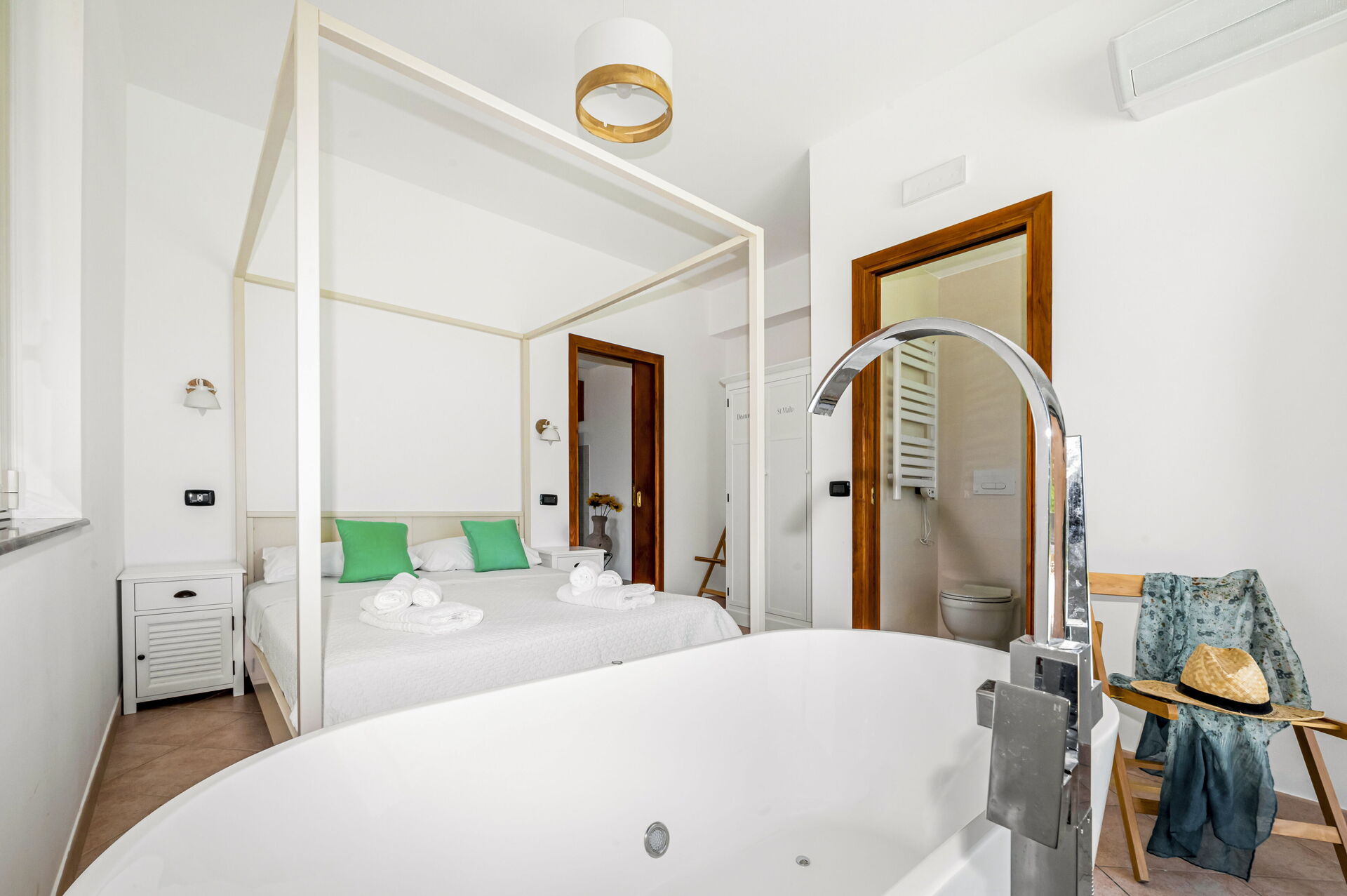 Ingång till vardagsrum med bäddsoffa och kök (luftkonditionering, TV, induktionshäll, ugn, kyl, frys, diskmaskin, mikrovågsugn, brödrost, espressomaskin) med matplats, 1 dubbelrum (luftkonditionering, king size-säng) med privat badrum med hydromassagebadkar, 1 dubbelrum (luftkonditionerat, superking size-säng) med badrum med badkar, 1 dubbelrum (luftkonditionerat, king size-säng), 1 tvåbäddsrum, badrum med dusch
