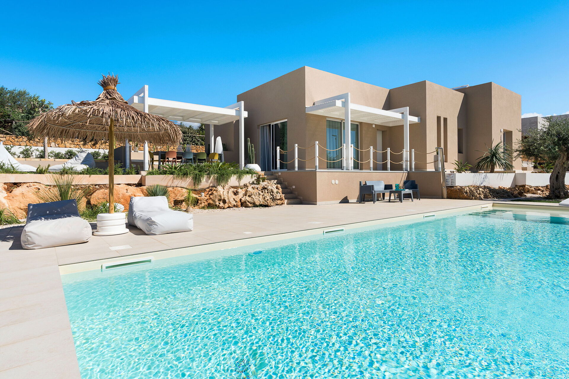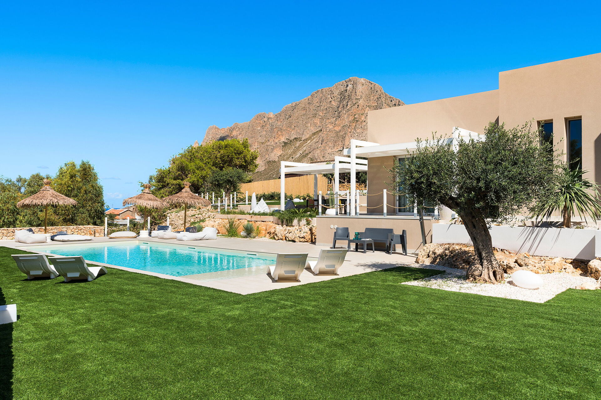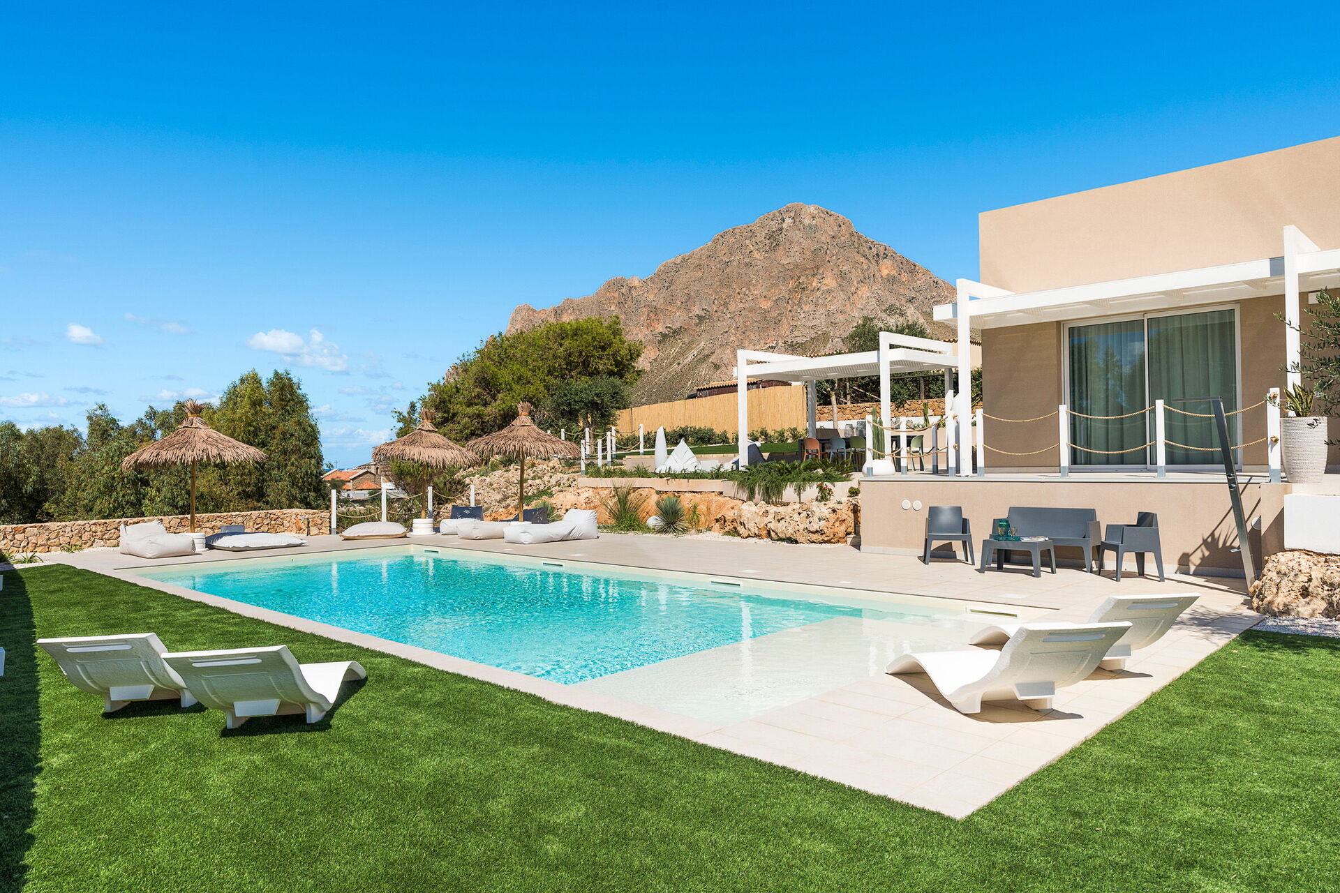 Villa Castalia är ett lyxigt semesterhus i den välkända kuststaden Cornino, halvvägs mellan San Vito Lo Capo och Trapani på Sicilien.