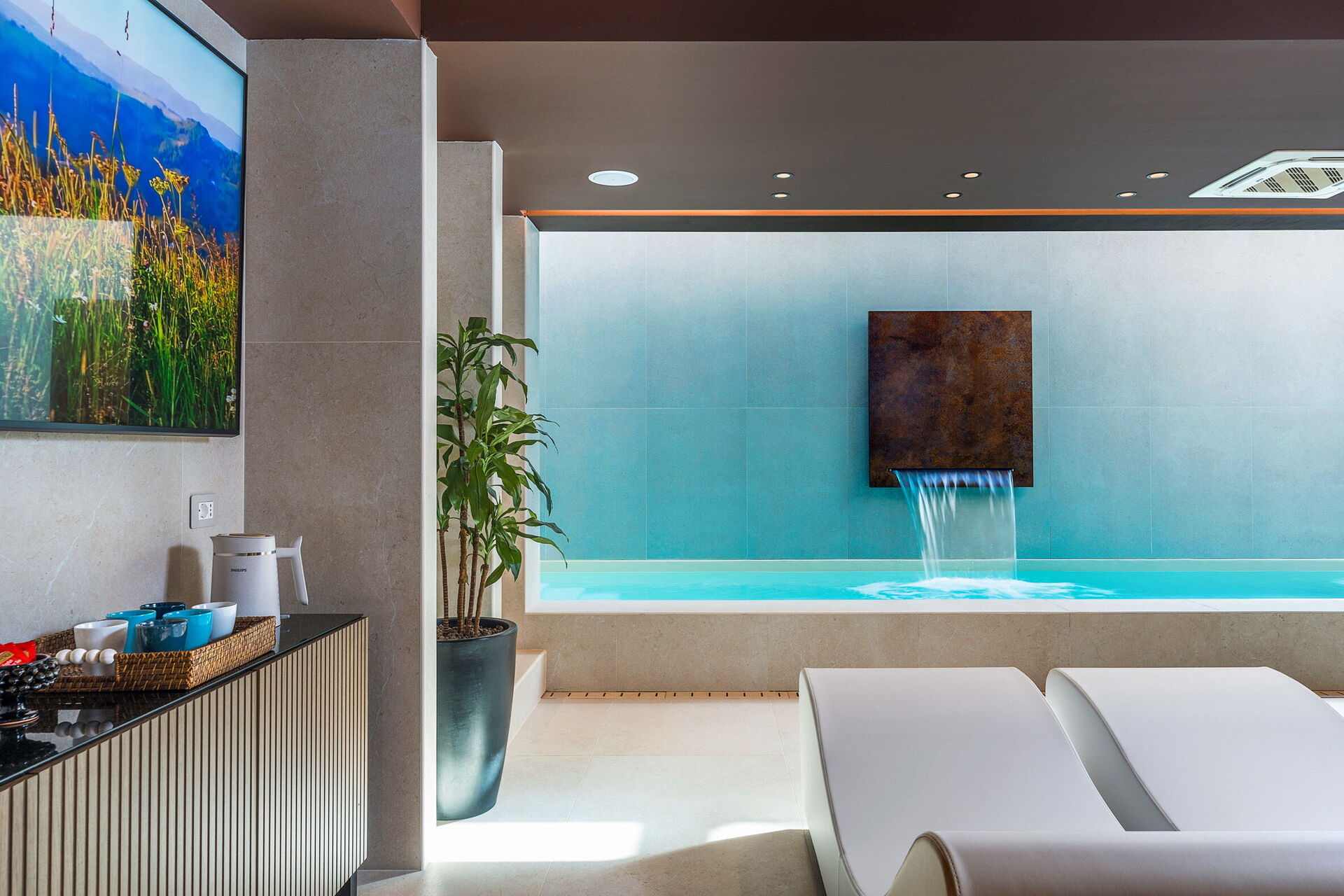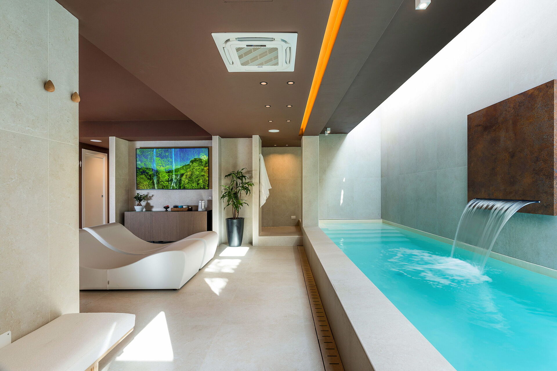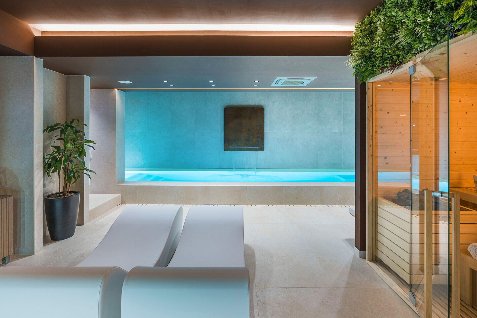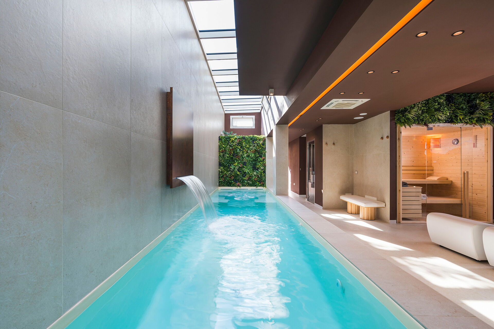 - Privat inomhuspool med vattenfall och bubbelhörn (9 x 2 meter; djup: 1,2 meter) som kan värmas upp till 28°C på begäran (utan extra kostnad)