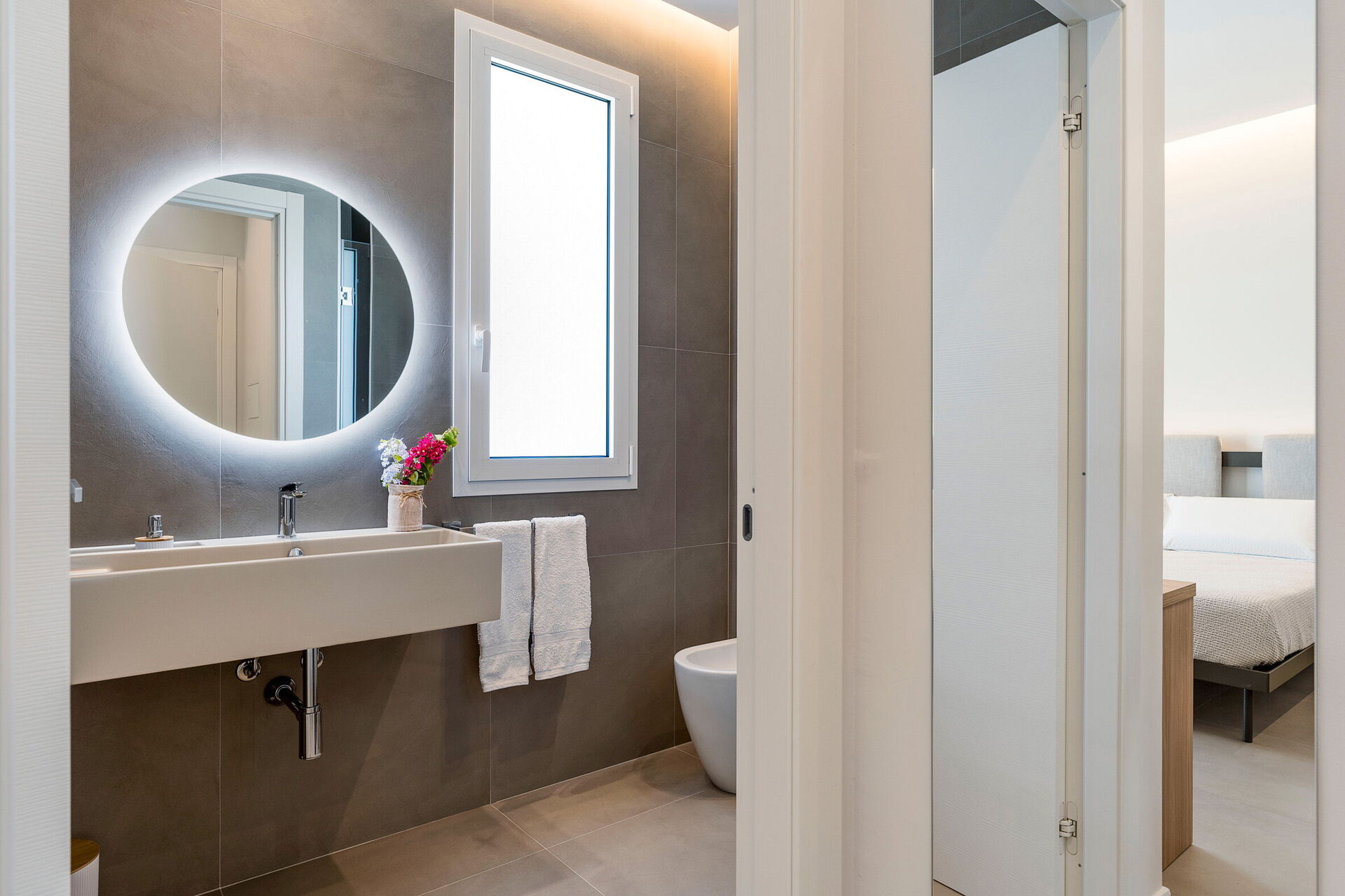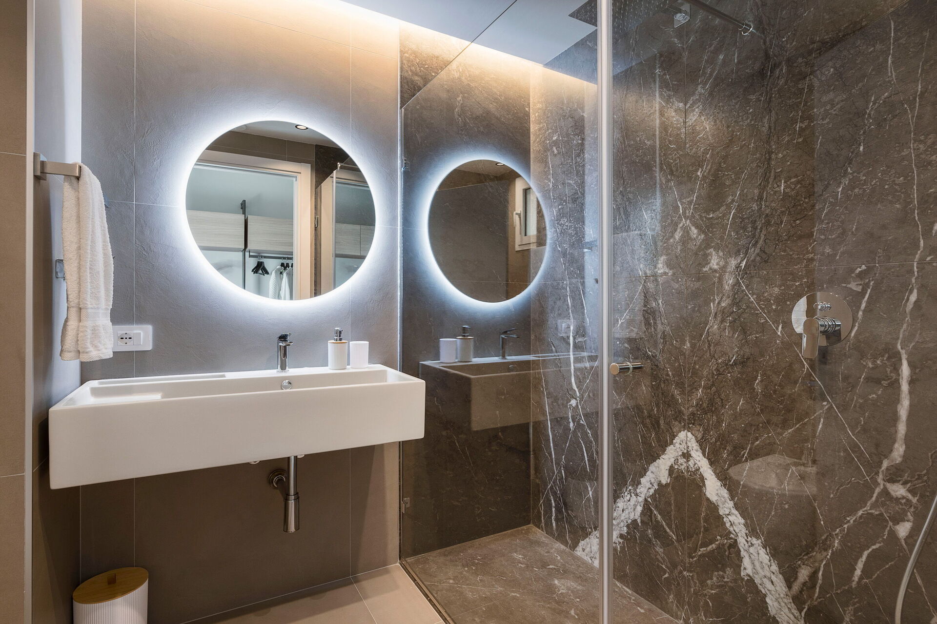 Bottenvåning: stor och ljus sällskapsyta bestående av vardagsrum (smart-TV), matplats och kök (ugn, frys, kylskåp, diskmaskin, mikrovågsugn, espressomaskin, kaffebryggare, brödrost), wc, sovrum med dubbelsäng (king size, minibar) och enkel bäddsoffa samt privat badrum med dusch, sovrum med dubbelsäng (minibar) och privat badrum med dusch.