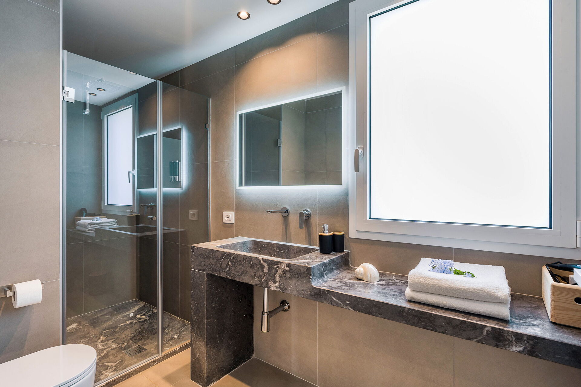 Nedre våning: sovrum med dubbelsäng (king size, minibar) och enkel bäddsoffa samt privat badrum med dusch, sovrum med dubbelsäng (minibar) och privat badrum med dusch; Spa med: inomhuspool med vattenfall och bubbelhörna som kan värmas upp till 28° på begäran (9 x 2 meter, djup: 1,2 meter), bastu, ångbad, multisensorisk dusch och avkopplingsområde, 2 wc, rum med massagebord och 2 duschar.