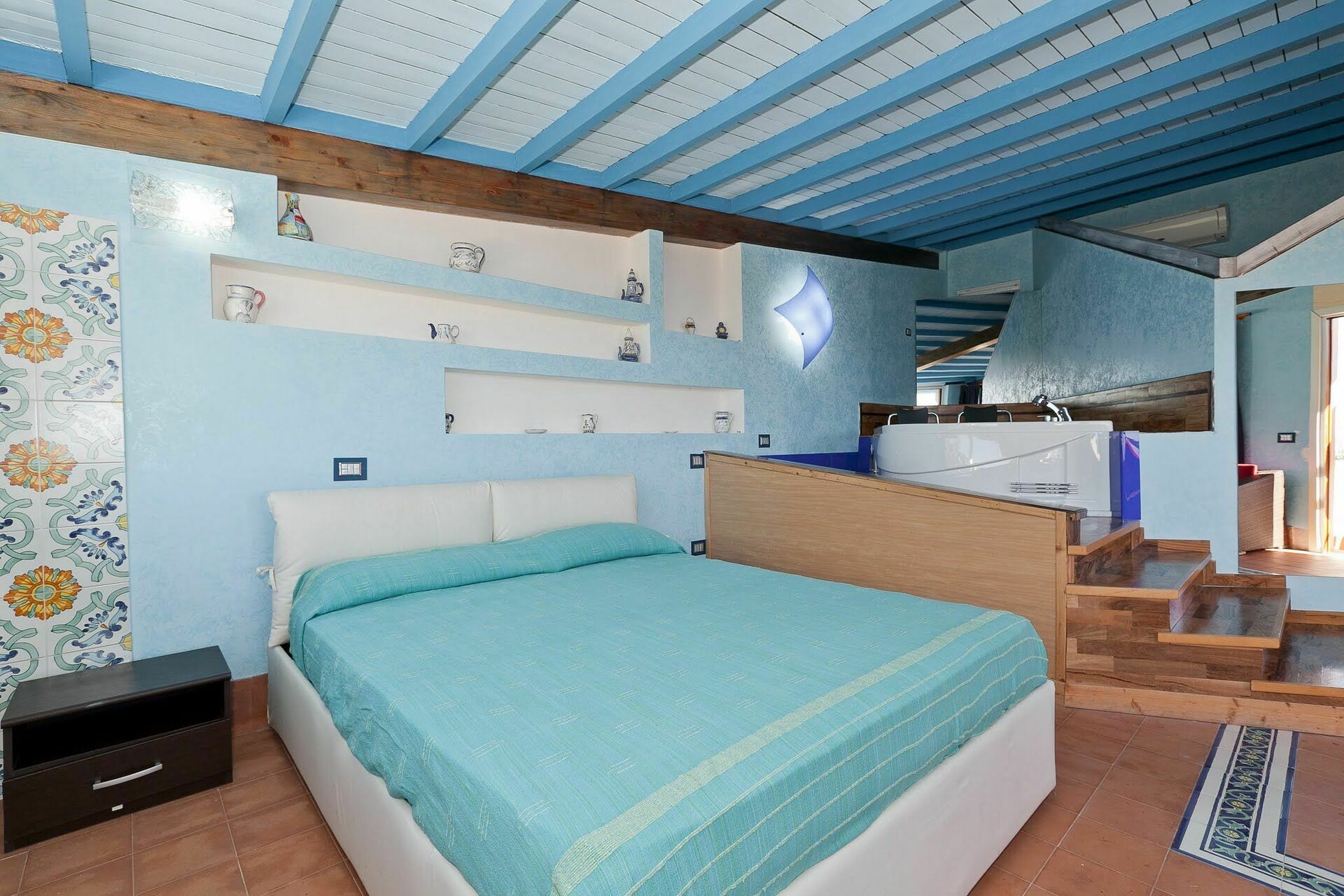 Andra våningen (endast tillgänglig från utsidan): vacker panoramautsikt med dubbelsäng och jacuzzi, badrum med jacuzzi dusch.