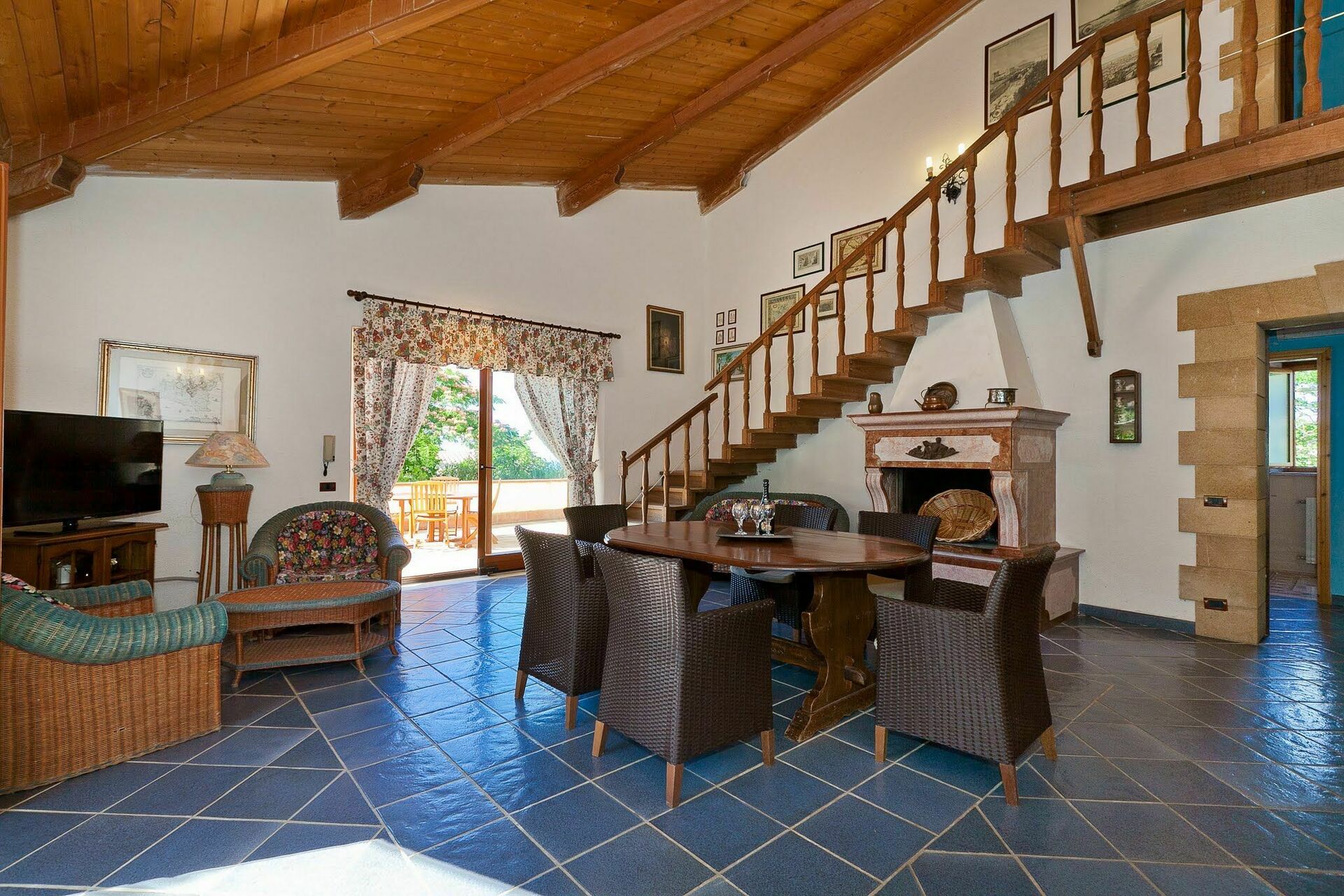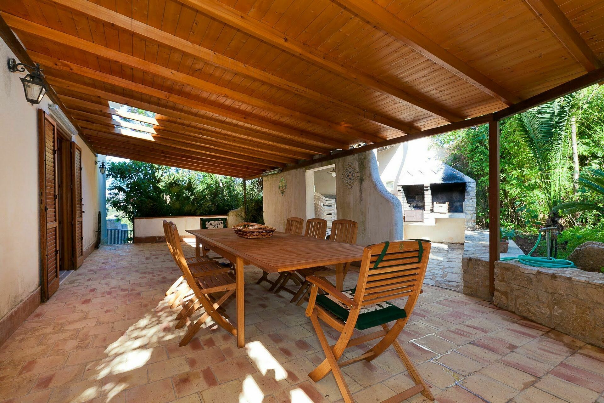 Trädgården planterat med träd, palmer, århundrade gamla olivträd och medelhavsbuskar. En vacker veranda erbjuder utsikt över det omgivande landskapet och möjligheten till mysiga middagar utomhus.