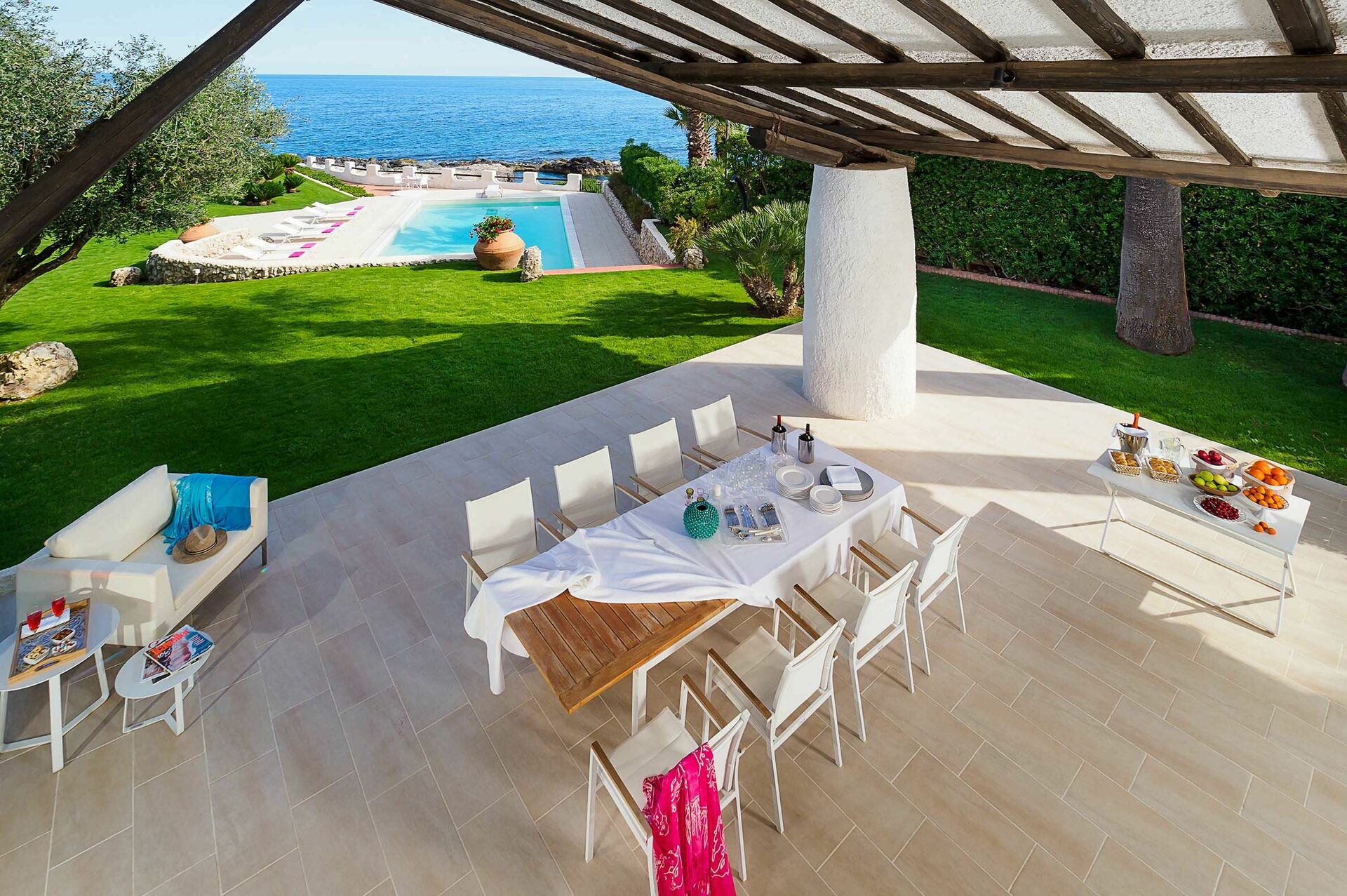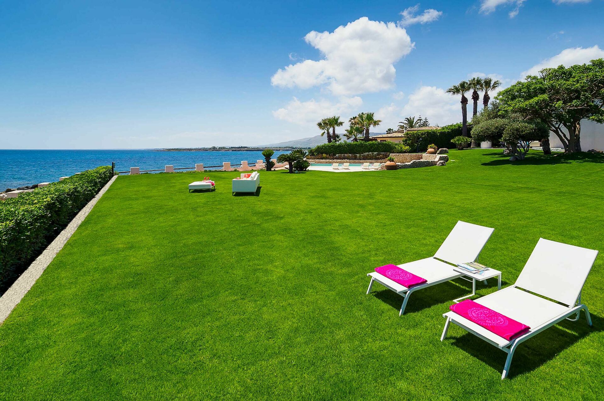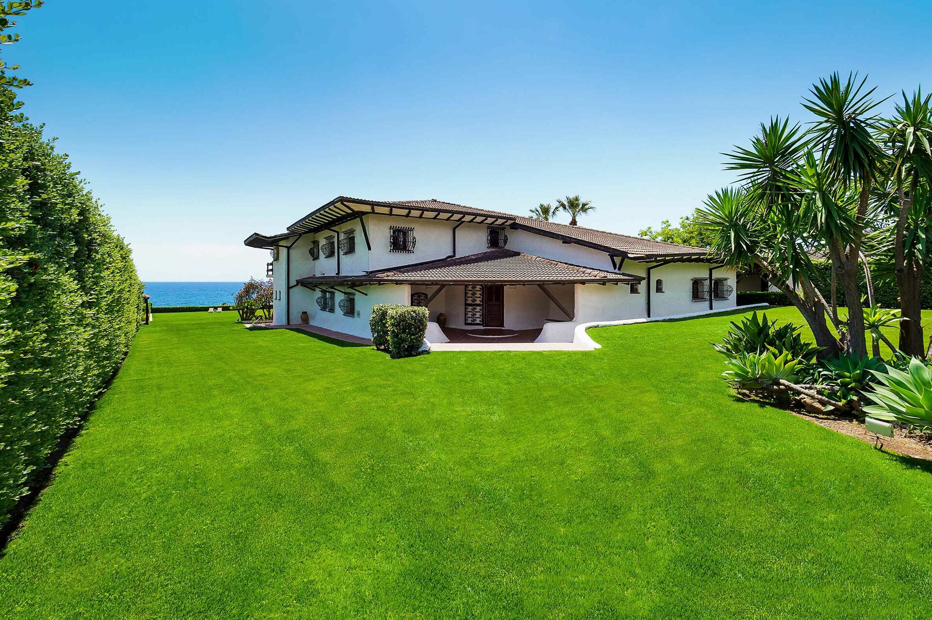 Omgivet av en välskött trädgård med gräsmatta, erbjuder denna exklusiva semestervillan rymliga, välutrustade utomhusområden, en vacker pool med solterrass och bekväm privat tillgång till havet och bergen nedanför.