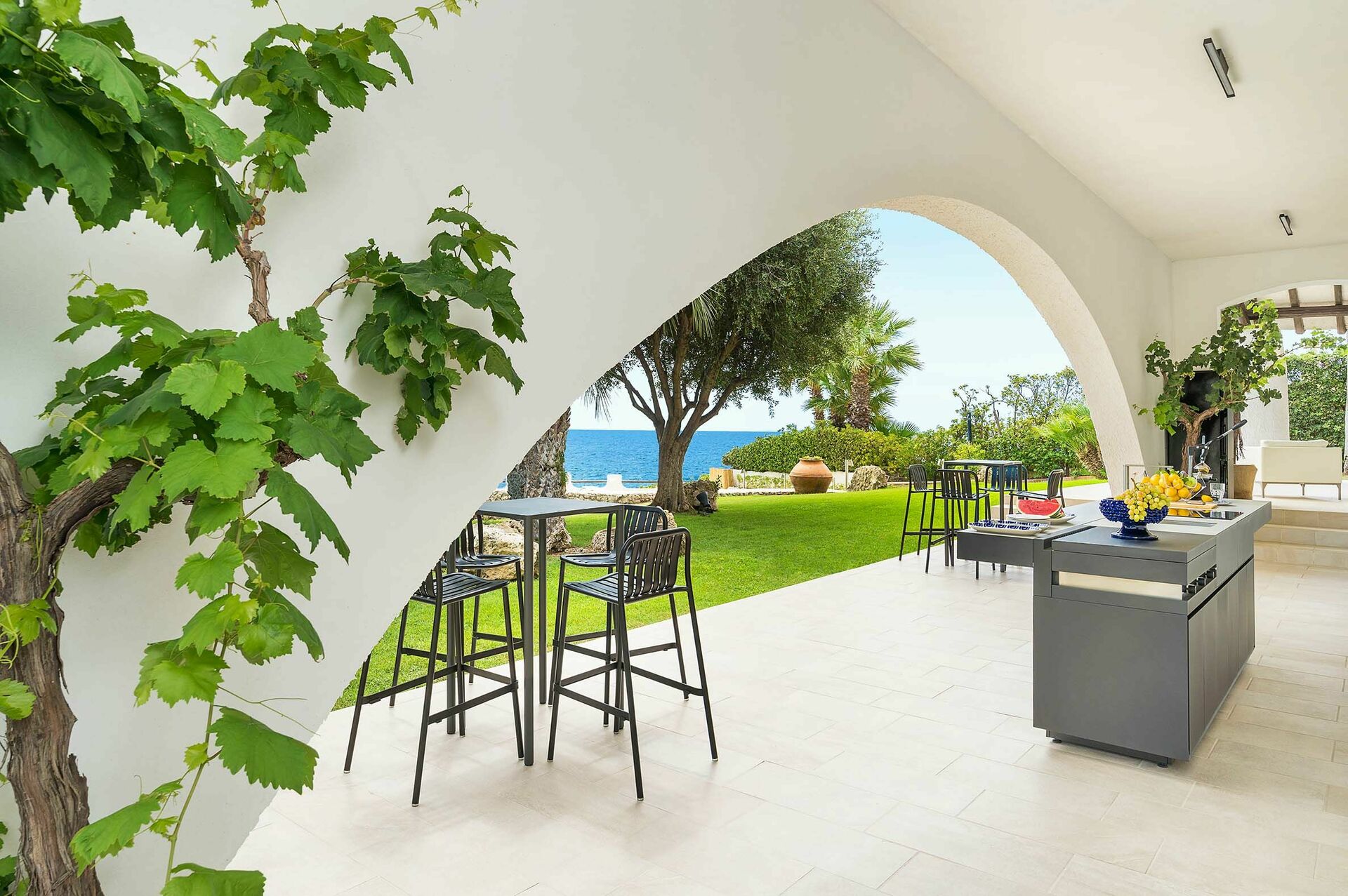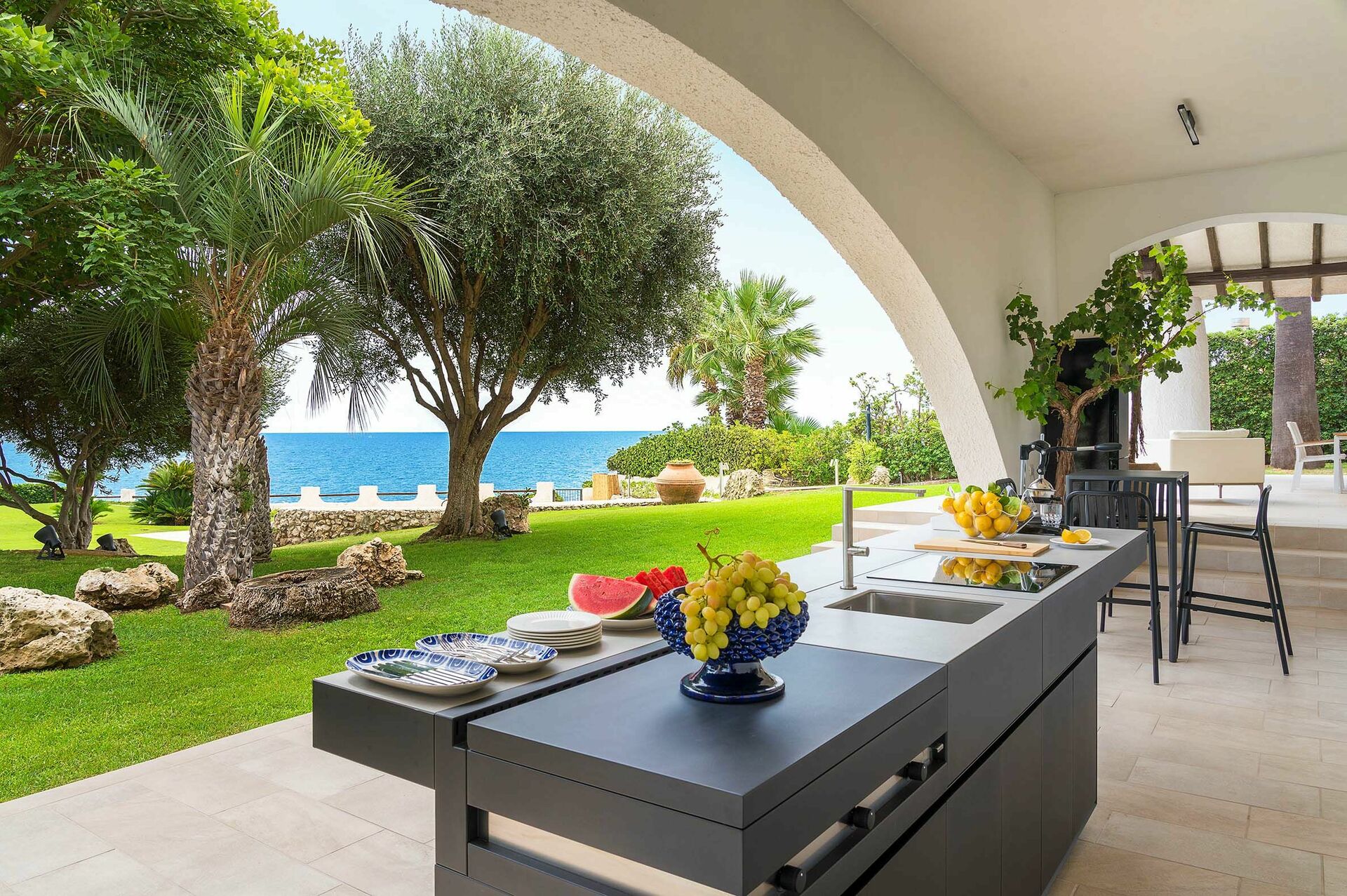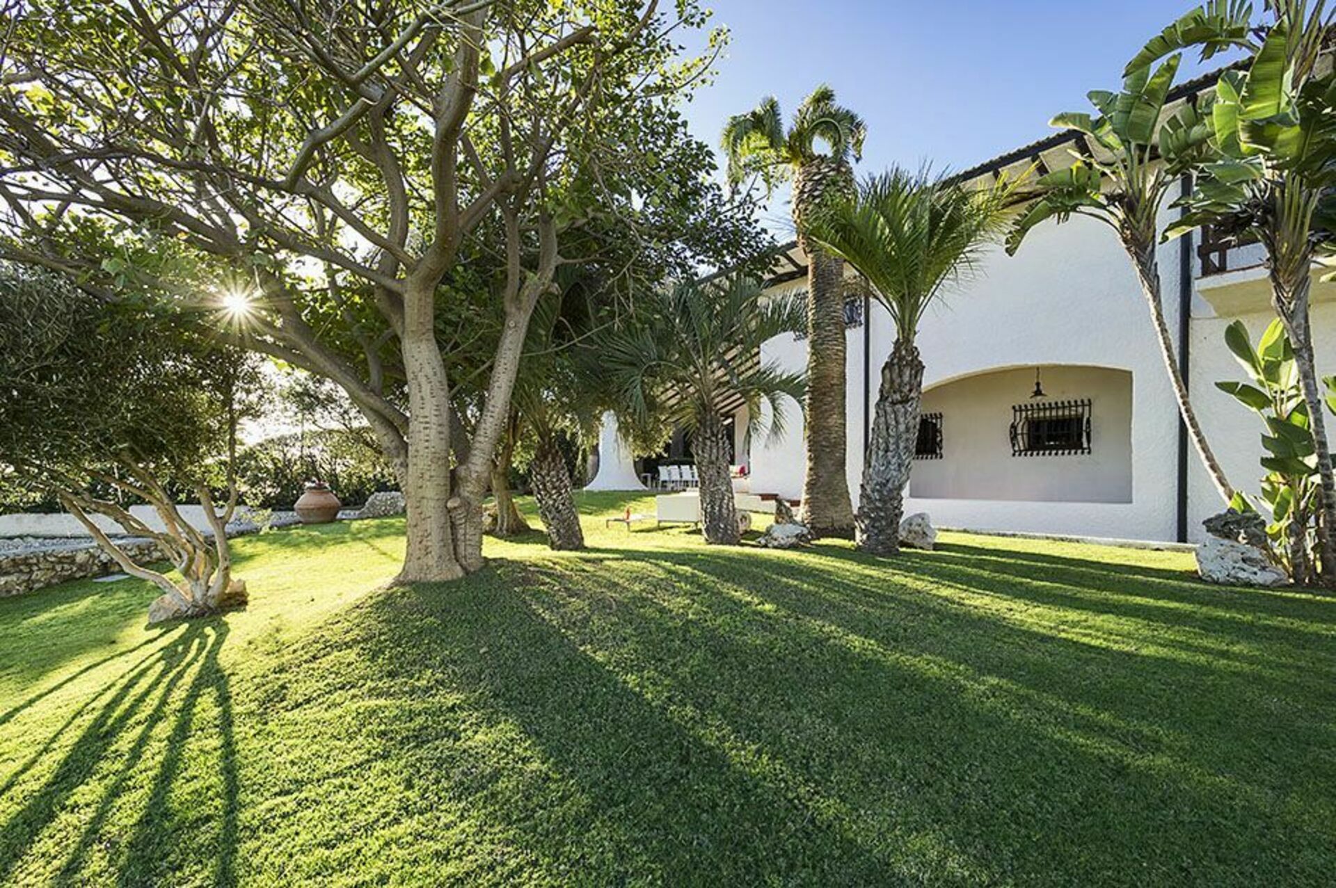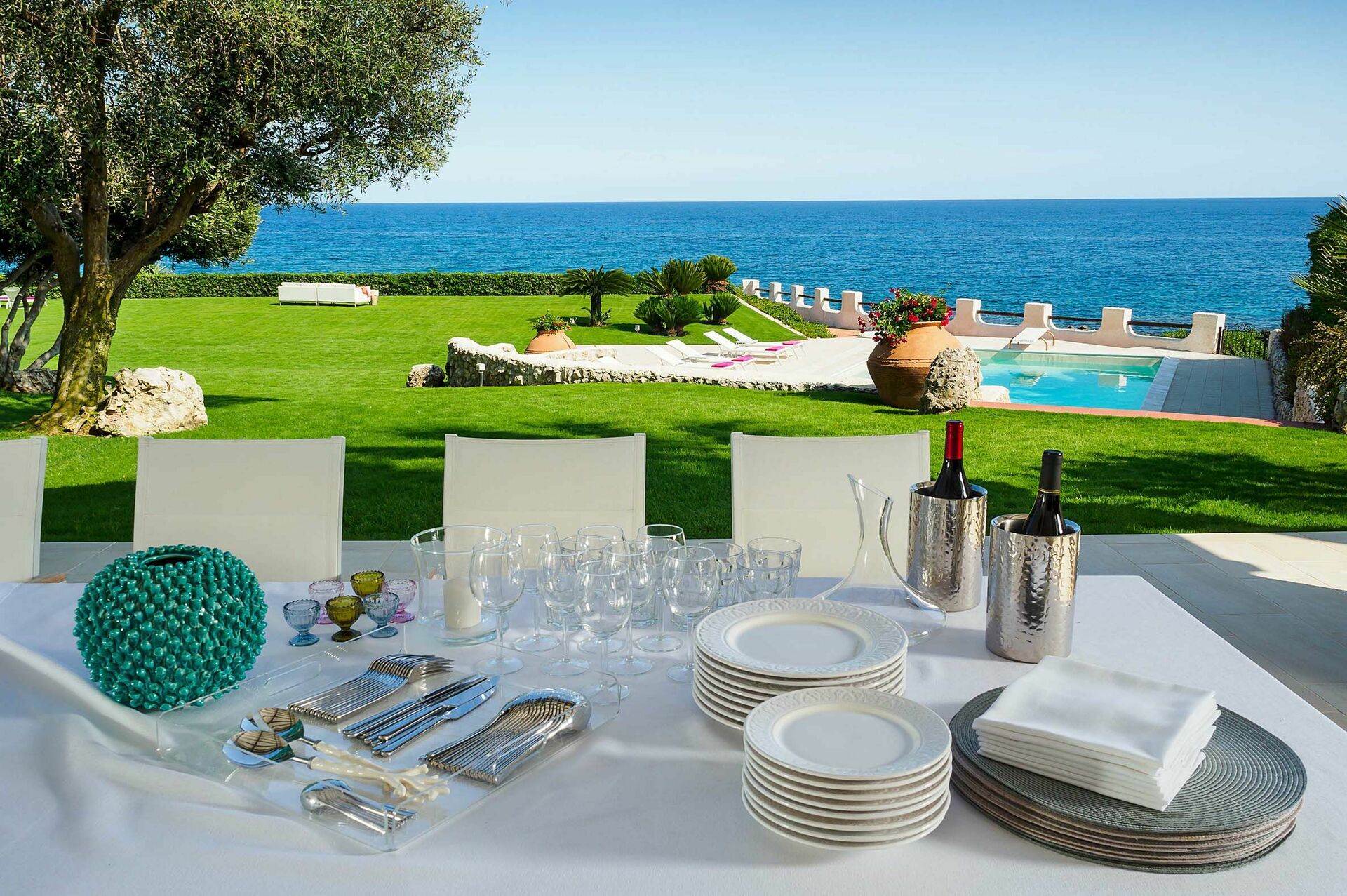 Omgivet av en välskött trädgård med gräsmatta, erbjuder denna exklusiva semestervillan rymliga, välutrustade utomhusområden, en vacker pool med solterrass och bekväm privat tillgång till havet och bergen nedanför.