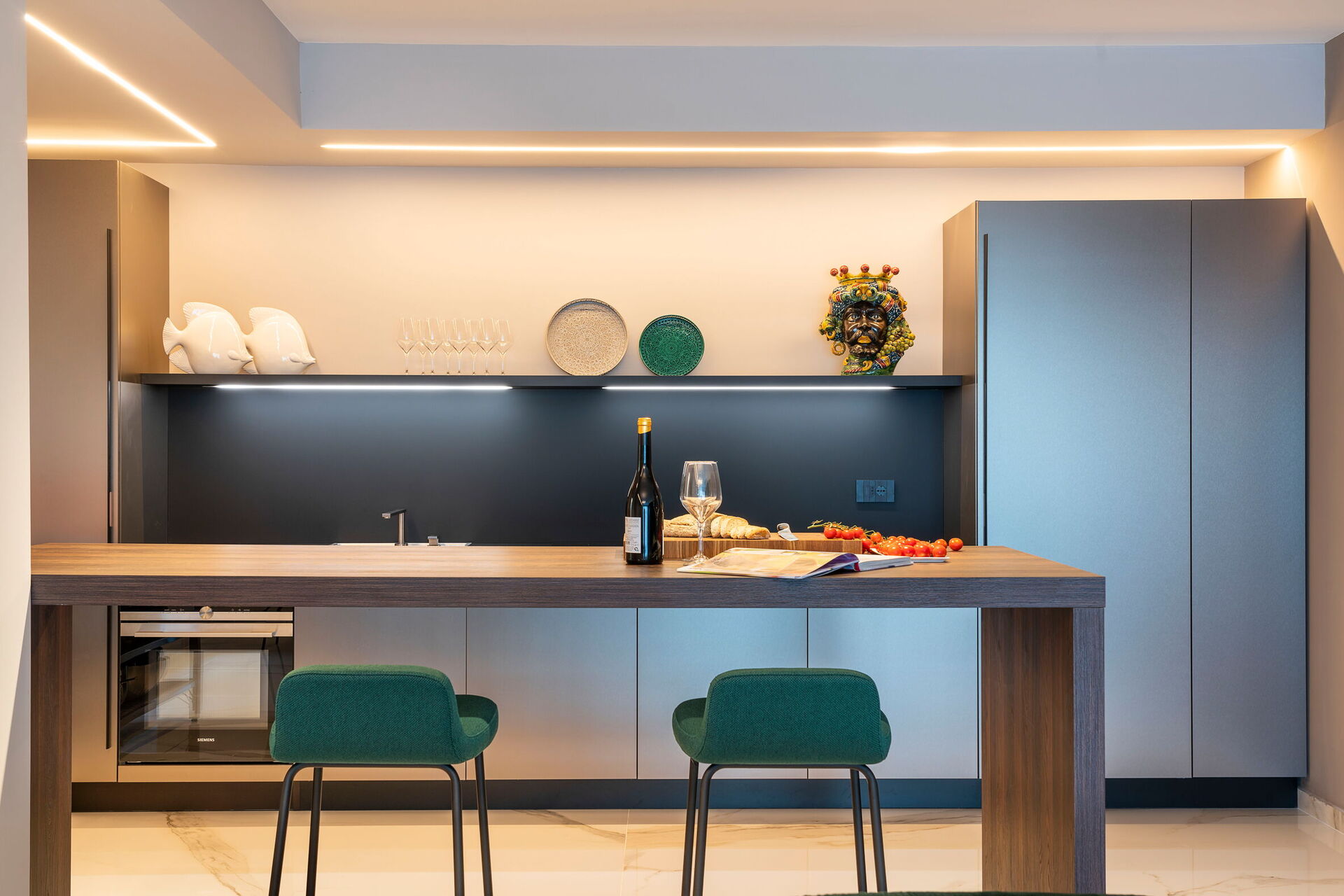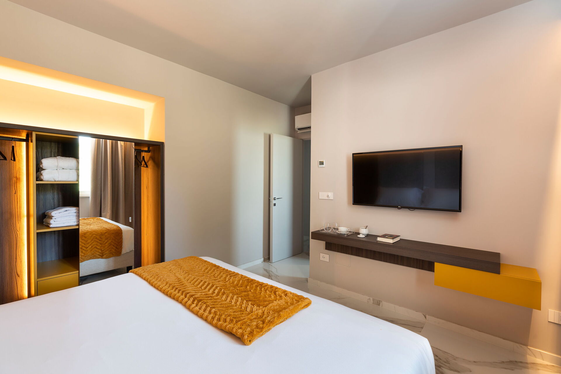 Vardagsrum (luftkonditionering, TV) med matplats, kök (spishäll, ugn, kyl, frys, diskmaskin, mikrovågsugn, brödrost, espressomaskin), 1 dubbelrum (luftkonditionering, TV) med badrum med dusch