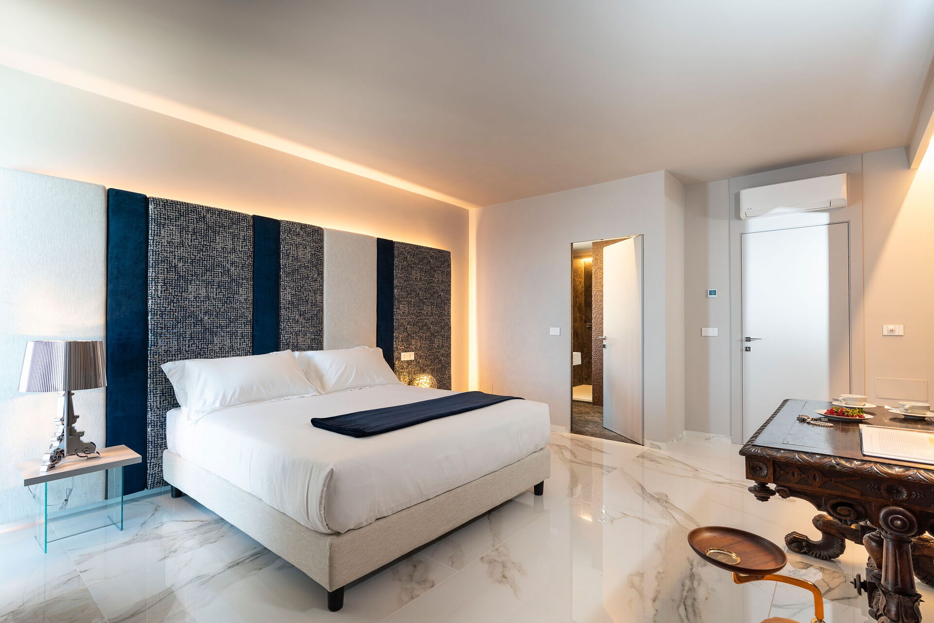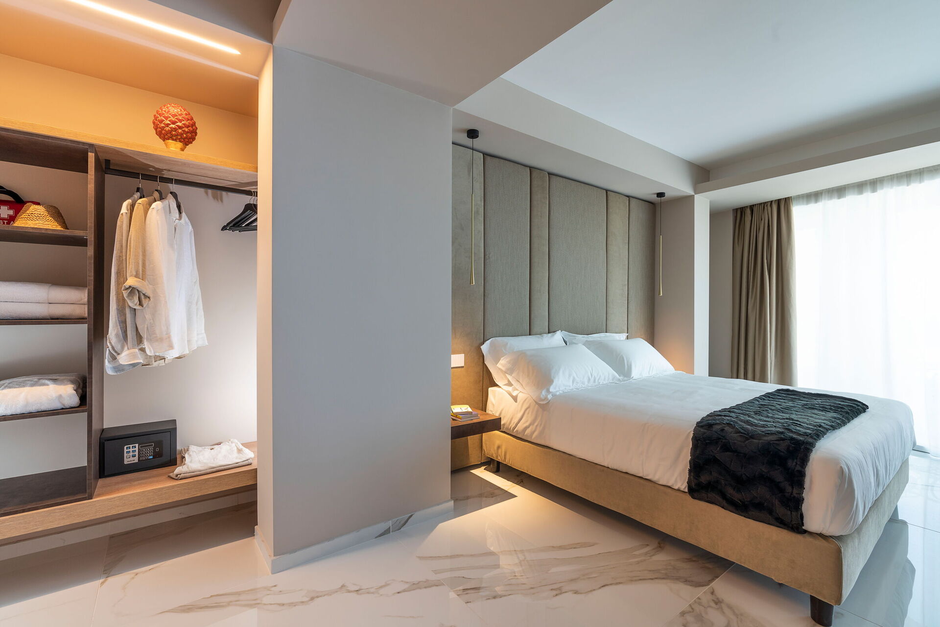 Stort vardagsrum (luftkonditionering, TV), kök (spishäll, ugn, kyl, frys, diskmaskin, mikrovågsugn, brödrost, espressomaskin, kaffebryggare) med matplats, 2 dubbelrum (luftkonditionering, TV) med badrum med dusch, 2 dubbelrum (luftkonditionering, klädkammare, TV) med badrum med dusch