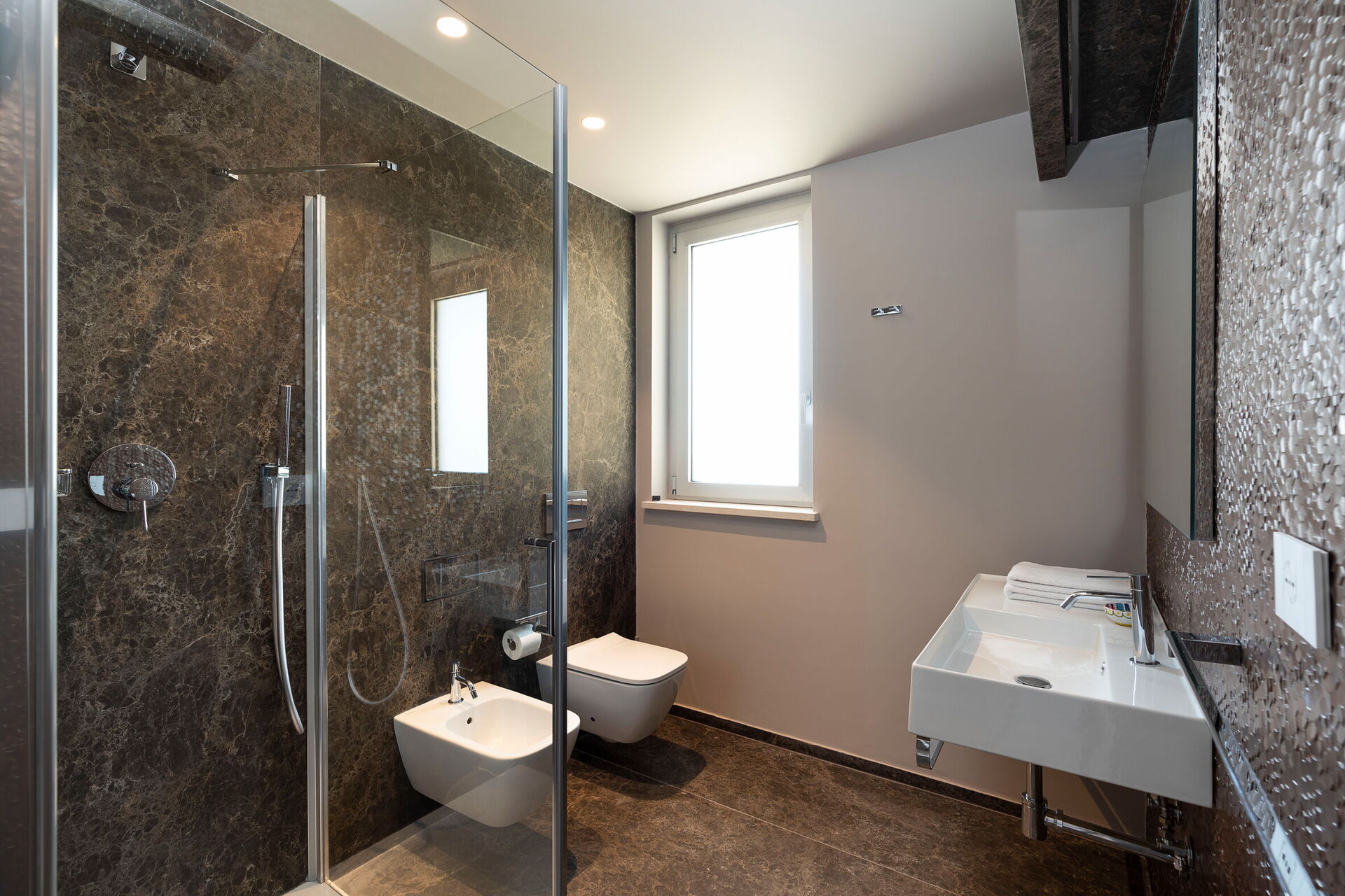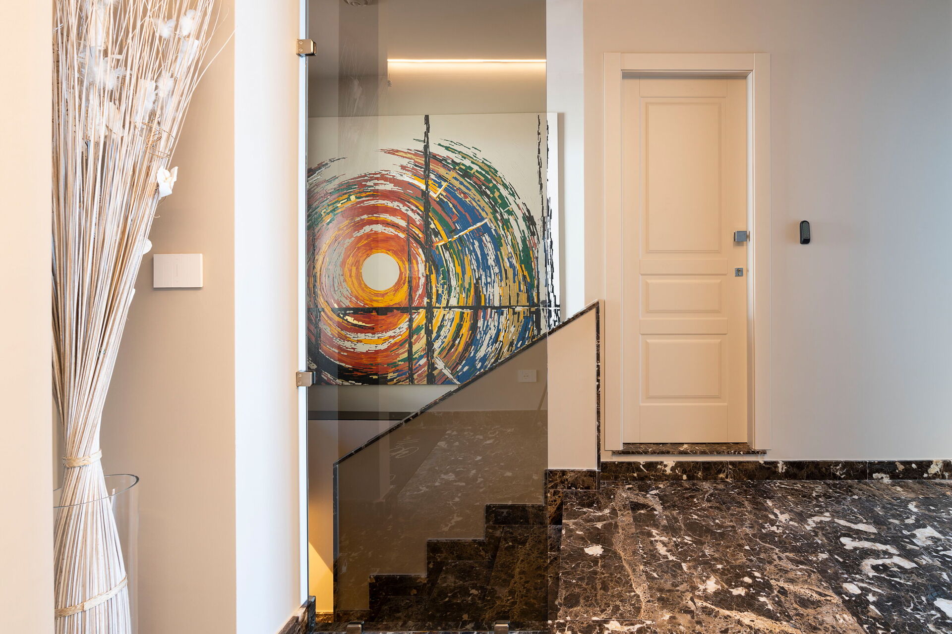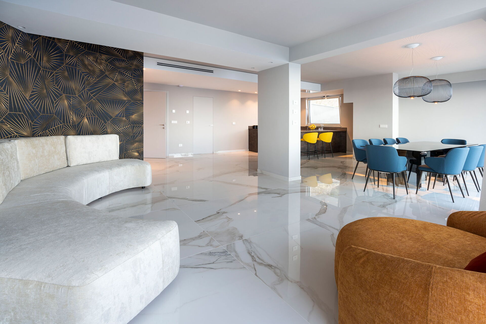 Stort vardagsrum (luftkonditionering, TV) med matplats, kök (spis, ugn, kyl, frys, diskmaskin, mikrovågsugn, brödrost, espressomaskin, kaffebryggare), 1 dubbelrum (luftkonditionering, TV) med badrum med dusch, 1 dubbelrum (luftkonditionering, klädkammare, TV) med badrum med dusch, tvättstuga, gym (träningsutrustning, träningsområde, bastu och sensorisk dusch)