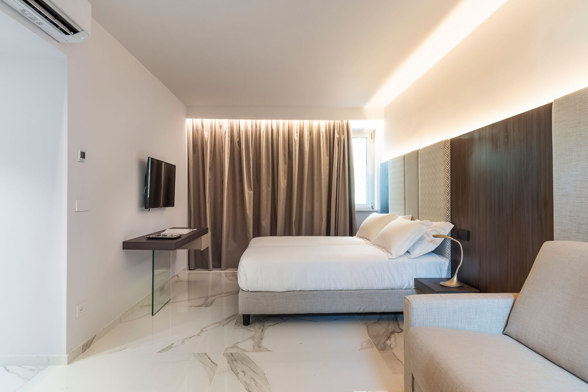 Stort vardagsrum (luftkonditionering, TV) med matplats, kök (spishäll, ugn, kyl, frys, diskmaskin, mikrovågsugn, brödrost, espressomaskin, kaffebryggare), 2 dubbelrum (luftkonditionering, TV) med badrum med dusch, 1 dubbelrum (luftkonditionering, klädkammare, TV) med badrum med dusch