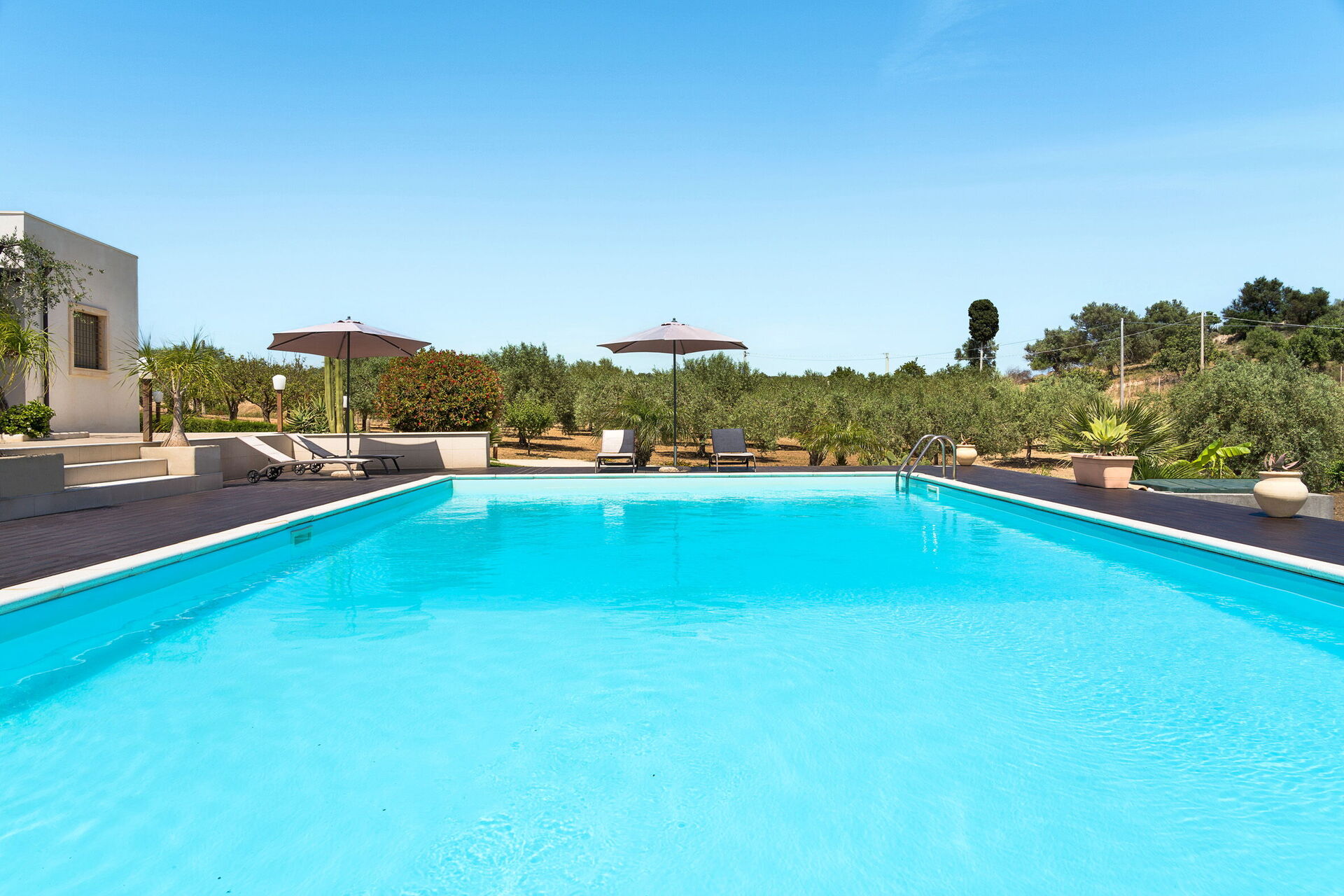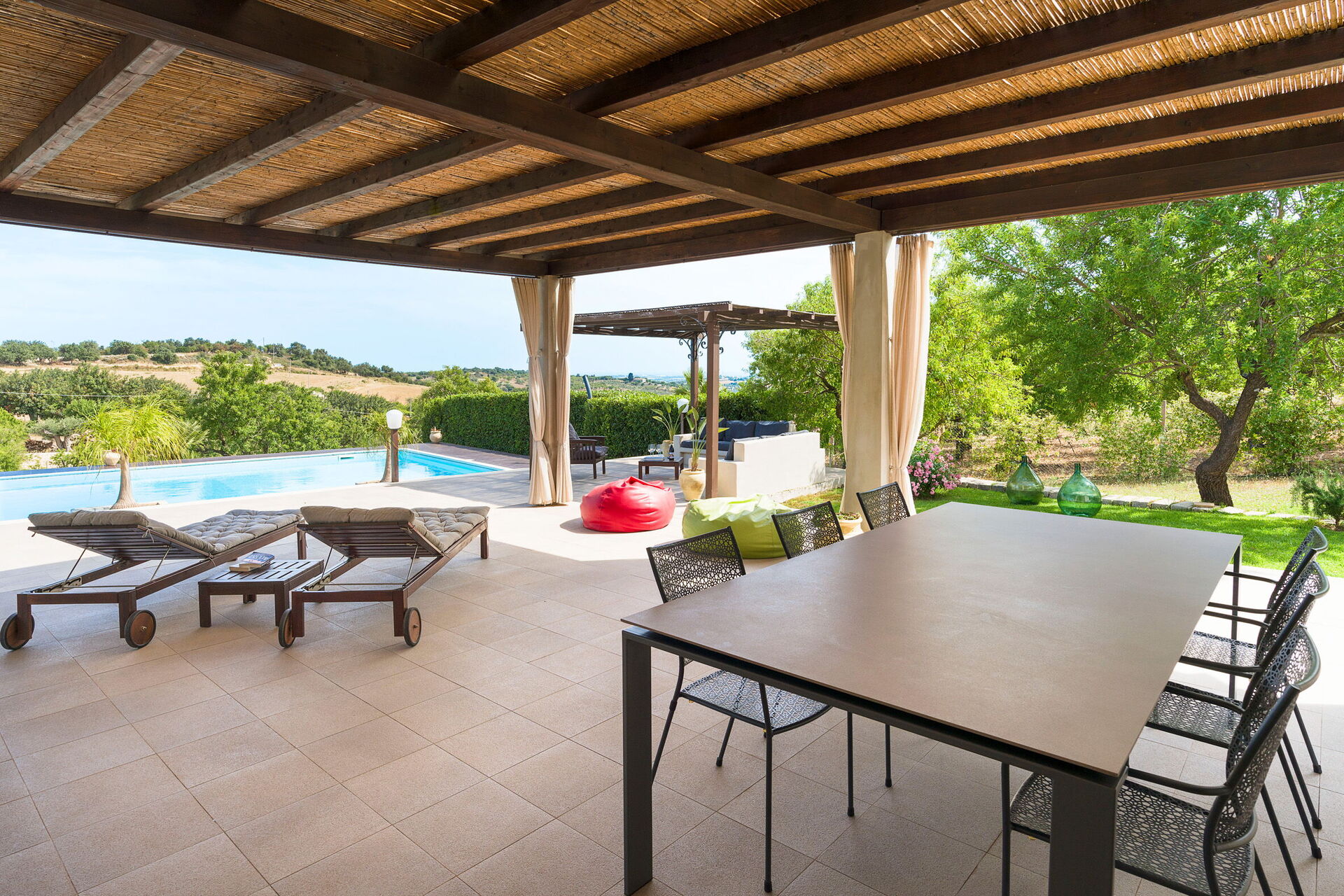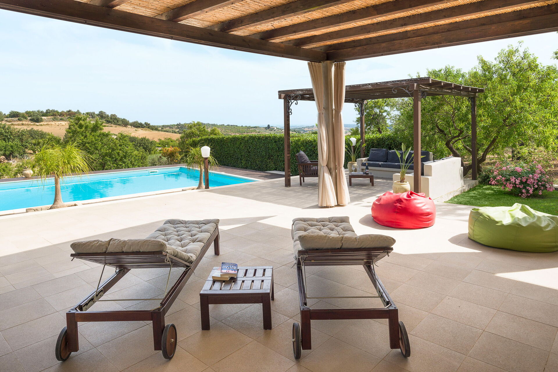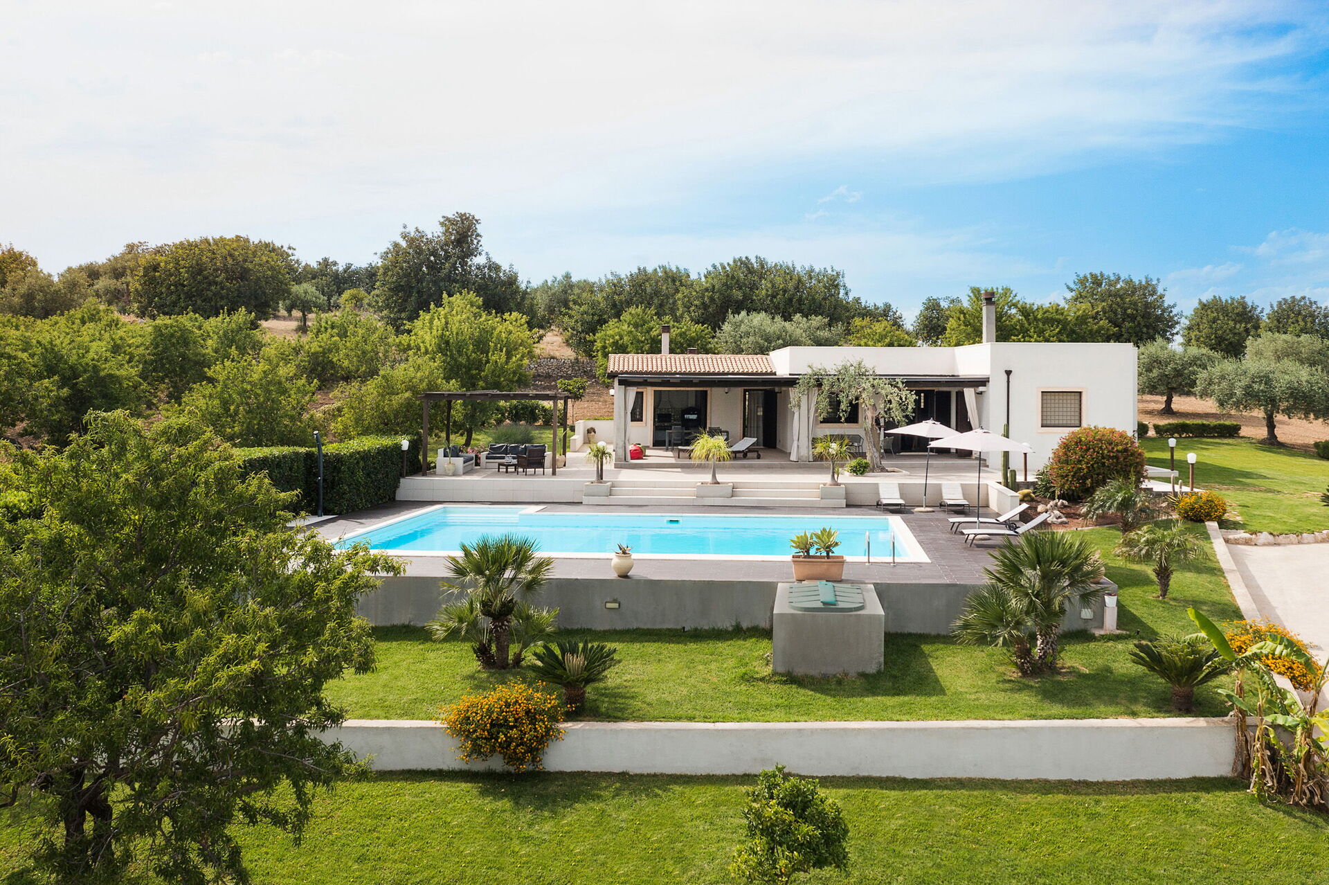 Villa Mara är en vacker fastighet med pool i sydöstra Sicilien. Semesterhuset ligger nära Rosolini och är omgiven av en stor naturpark med olivträd och mandelträd. Från huset har du en förtrollande utsikt över landskapet. Det är särskilt vacker utsikt från den stora terrassen, från solen terrassen och från saltvatten poolen (inga klor). Terrassen är delvis täckt och utrustad för att äta utomhus