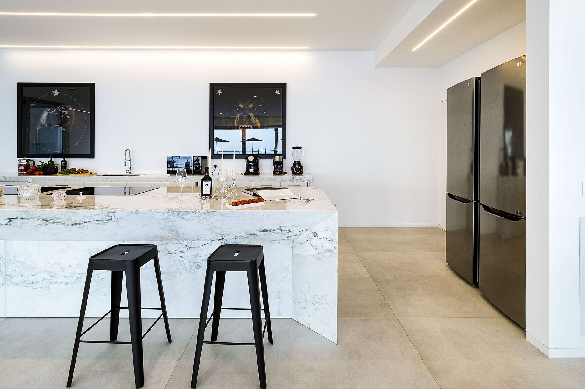 Stort öppet rum med vardagsrum och kök (spishäll, ugn, kyl, frys, diskmaskin, mikrovågsugn, brödrost, espressomaskin, kaffebryggare) med matplats, 1 toalett, 3 dubbelrum (luftkonditionering, myggnät) med eget badrum med dusch