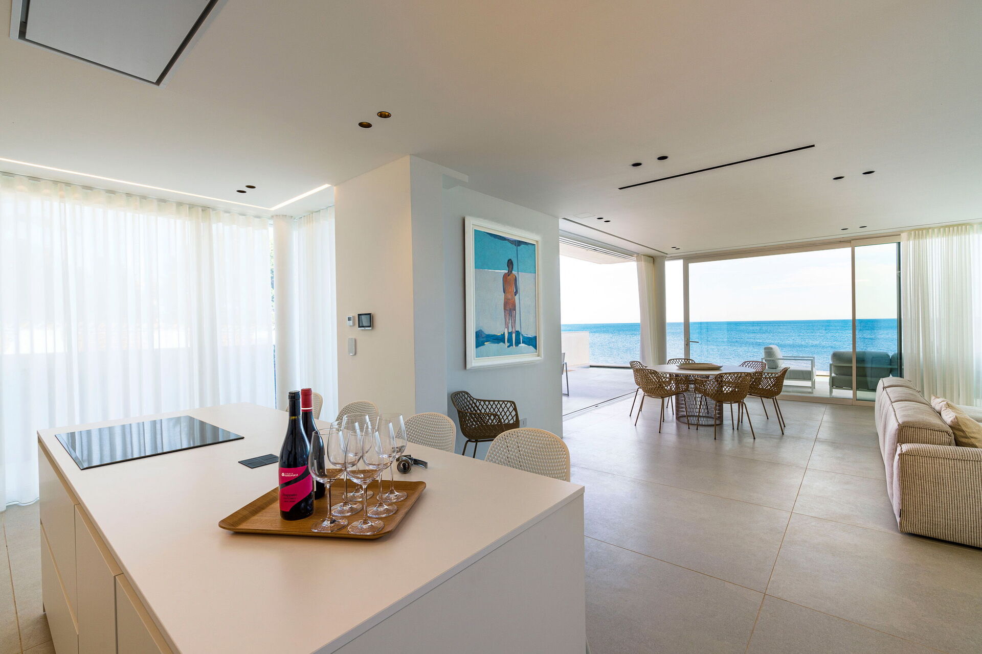 Vardagsrum (luftkonditionerat) med stora fönster med utsikt över havet, matsal och kök (spishällar, ugn, kyl, frys, diskmaskin, mikrovågsugn, brödrost, espressomaskin, kaffebryggare), 1 dubbelrum (luftkonditionerat) med privat badrum med dusch