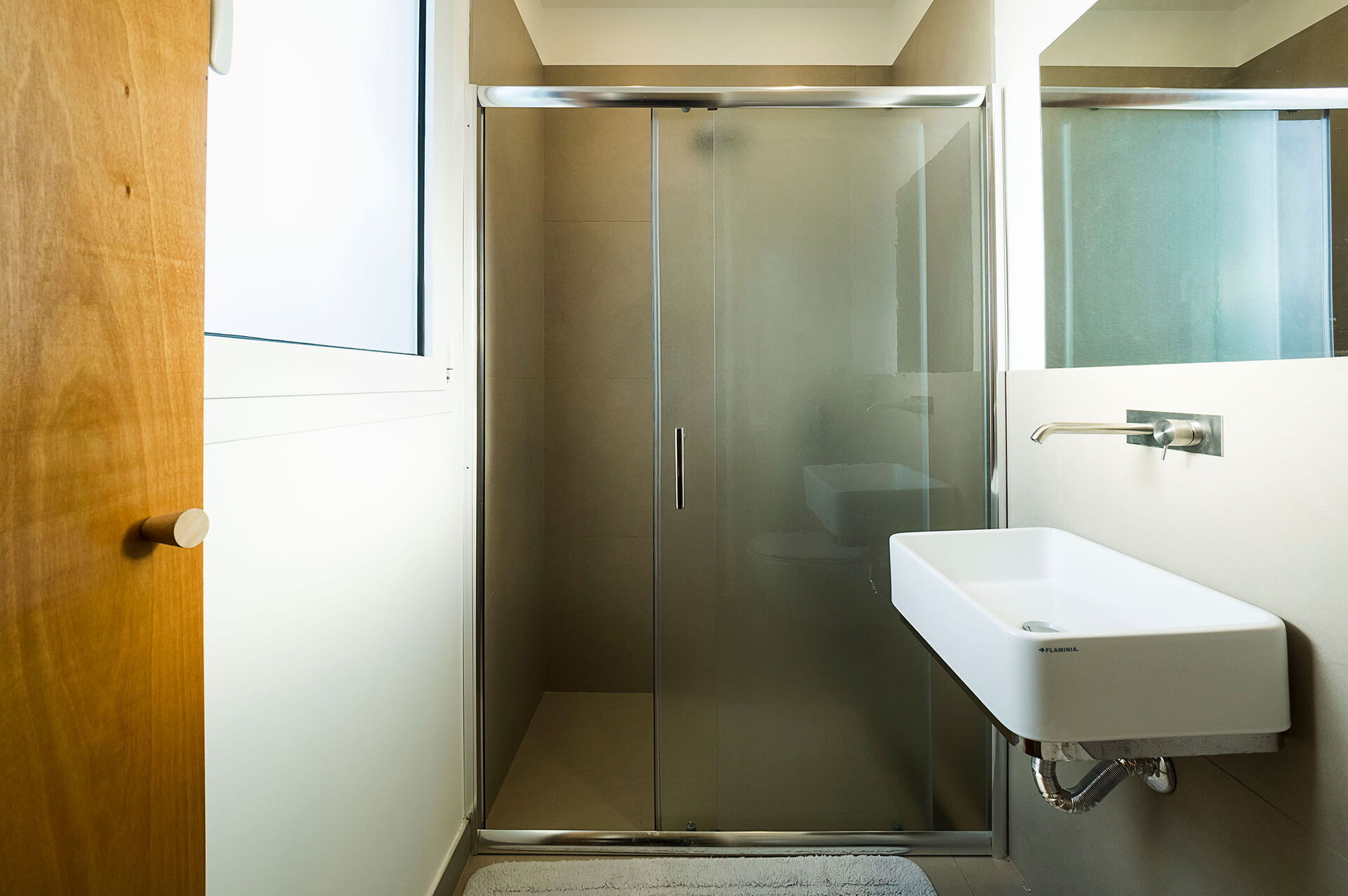 Vardagsrum (luftkonditionering, TV) med 2 bäddsoffor, kök (spis, ugn, frys, kyl, diskmaskin, brödrost) med matplats, 1 dubbelrum (luftkonditionering) med eget badrum med dusch, 1 dubbelrum (luftkonditionering), badrum med dusch