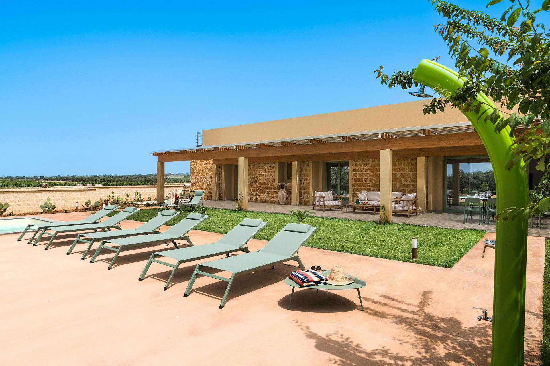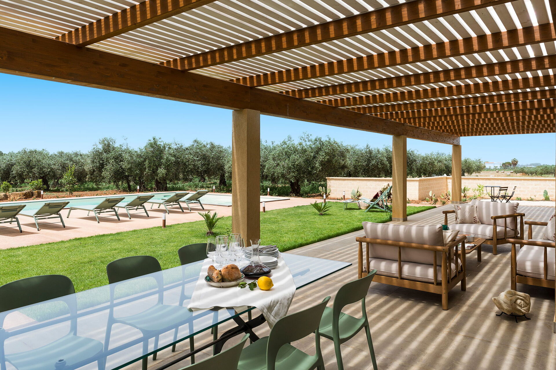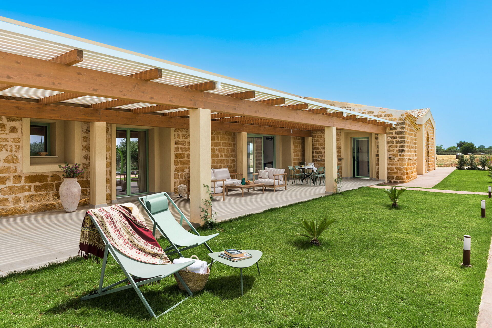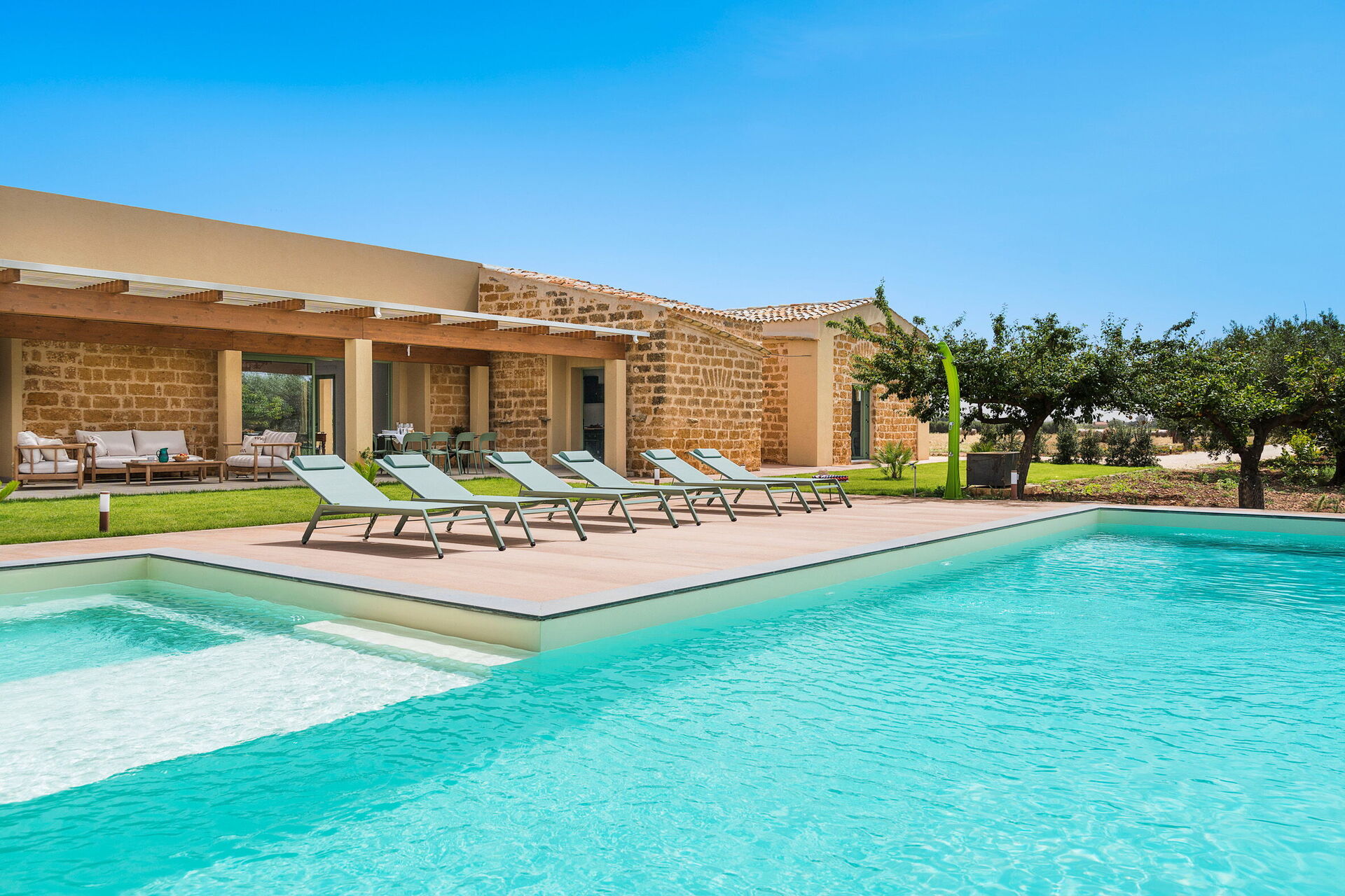 På fastigheten finns en stor saltvattenpool med bubbelhörna och en rymlig solterrass med solstolar: den perfekta platsen för avkoppling eller ett uppfriskande dopp under soliga sommardagar. Här kan man också njuta av lugnet och stillheten medan man sippar på en drink vid solnedgången.
