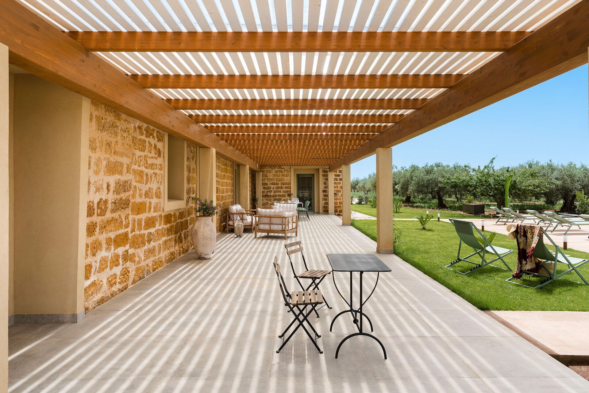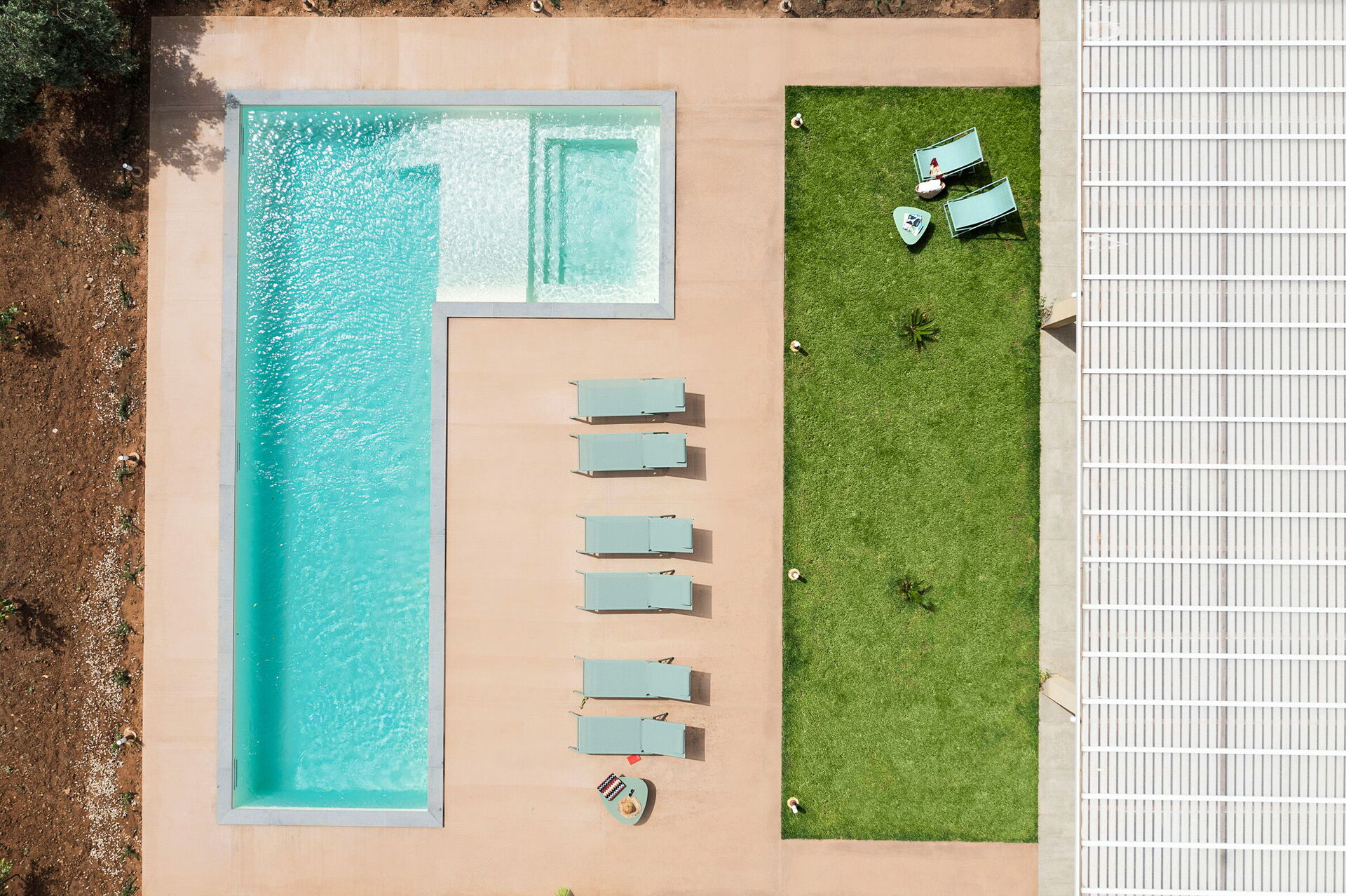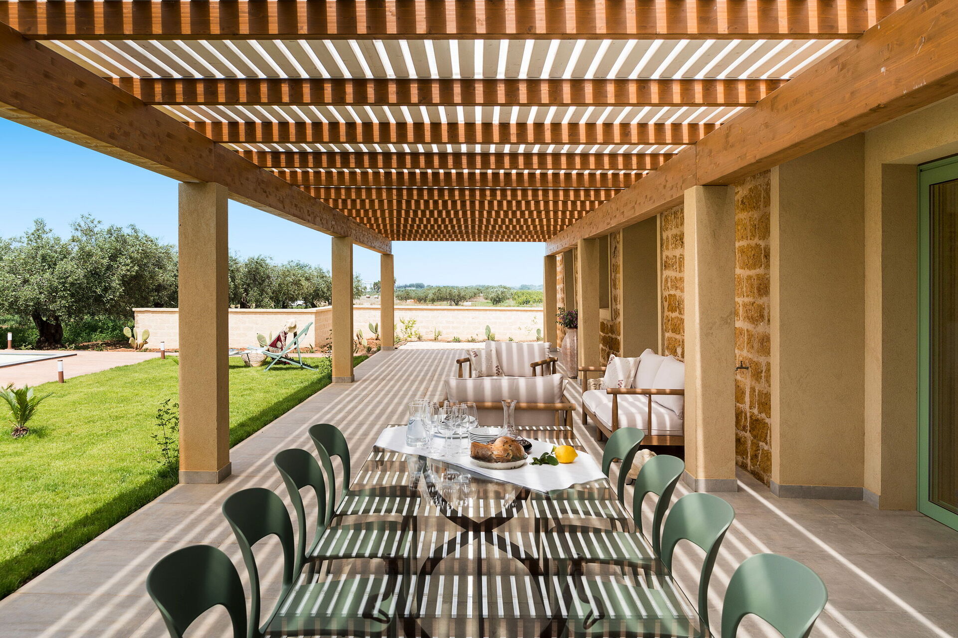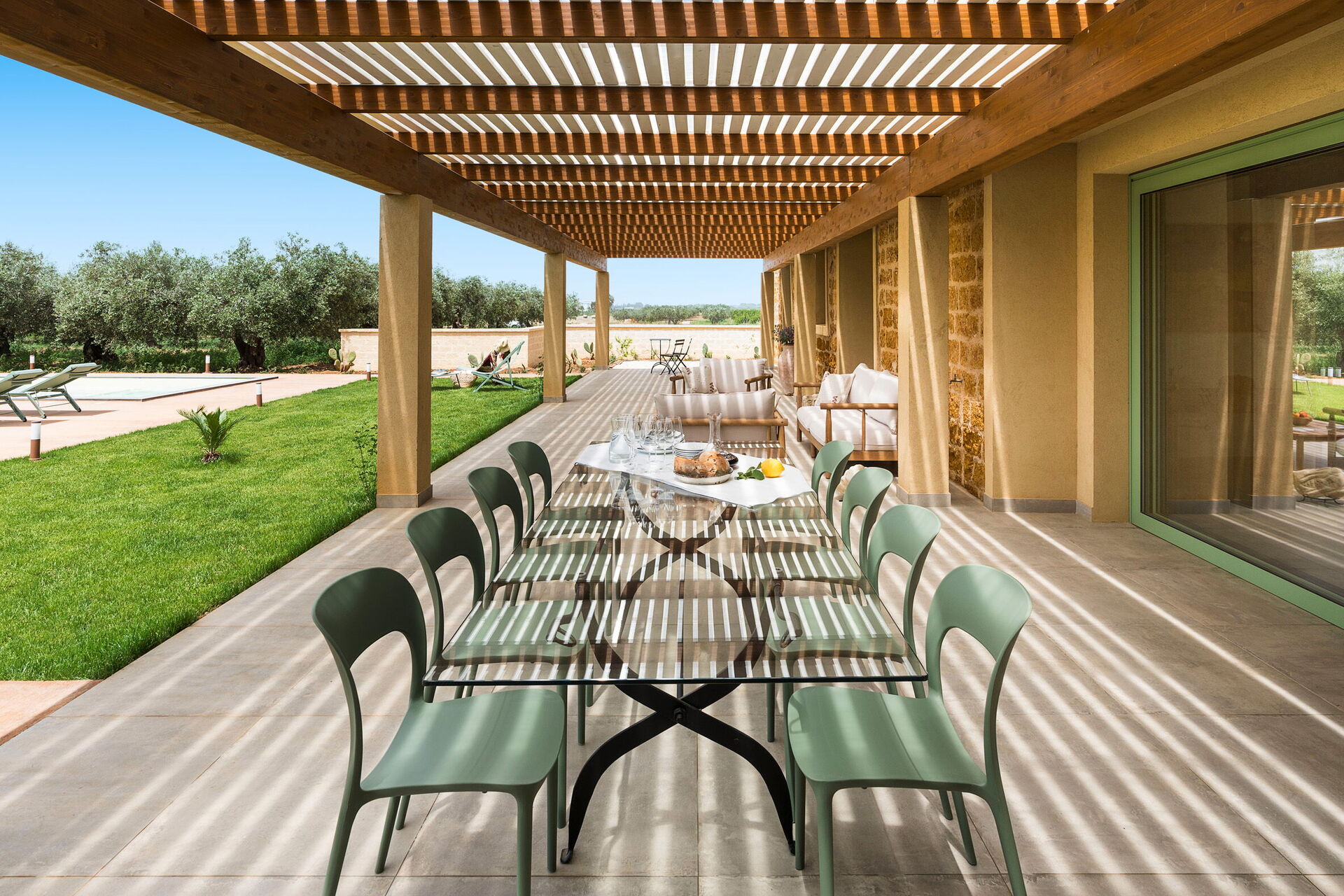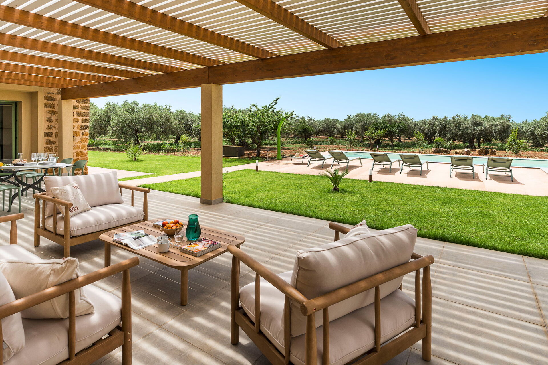 På fastigheten finns en stor saltvattenpool med bubbelhörna och en rymlig solterrass med solstolar: den perfekta platsen för avkoppling eller ett uppfriskande dopp under soliga sommardagar. Här kan man också njuta av lugnet och stillheten medan man sippar på en drink vid solnedgången.