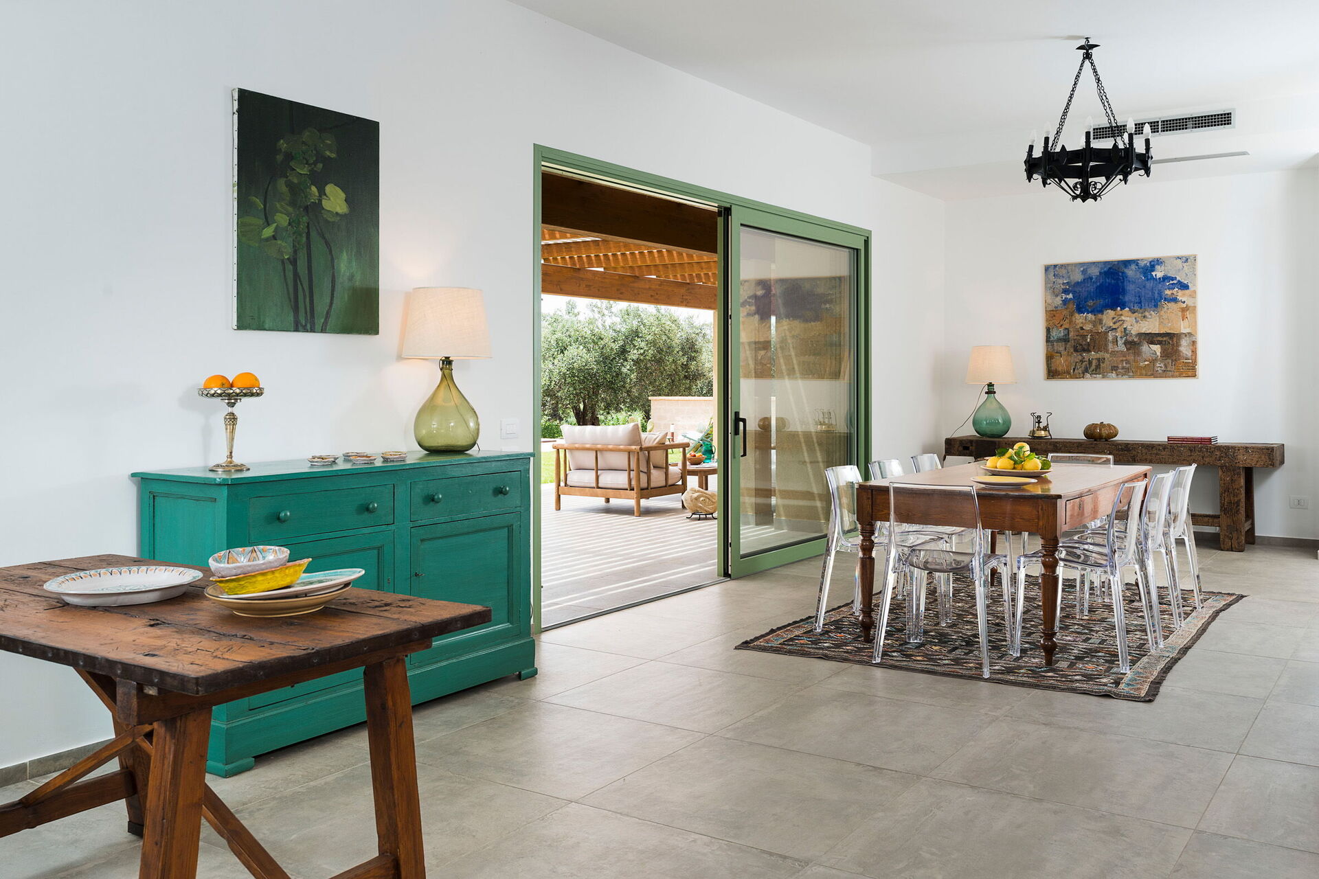 - veranda med bord och stolar för utomhusmåltider