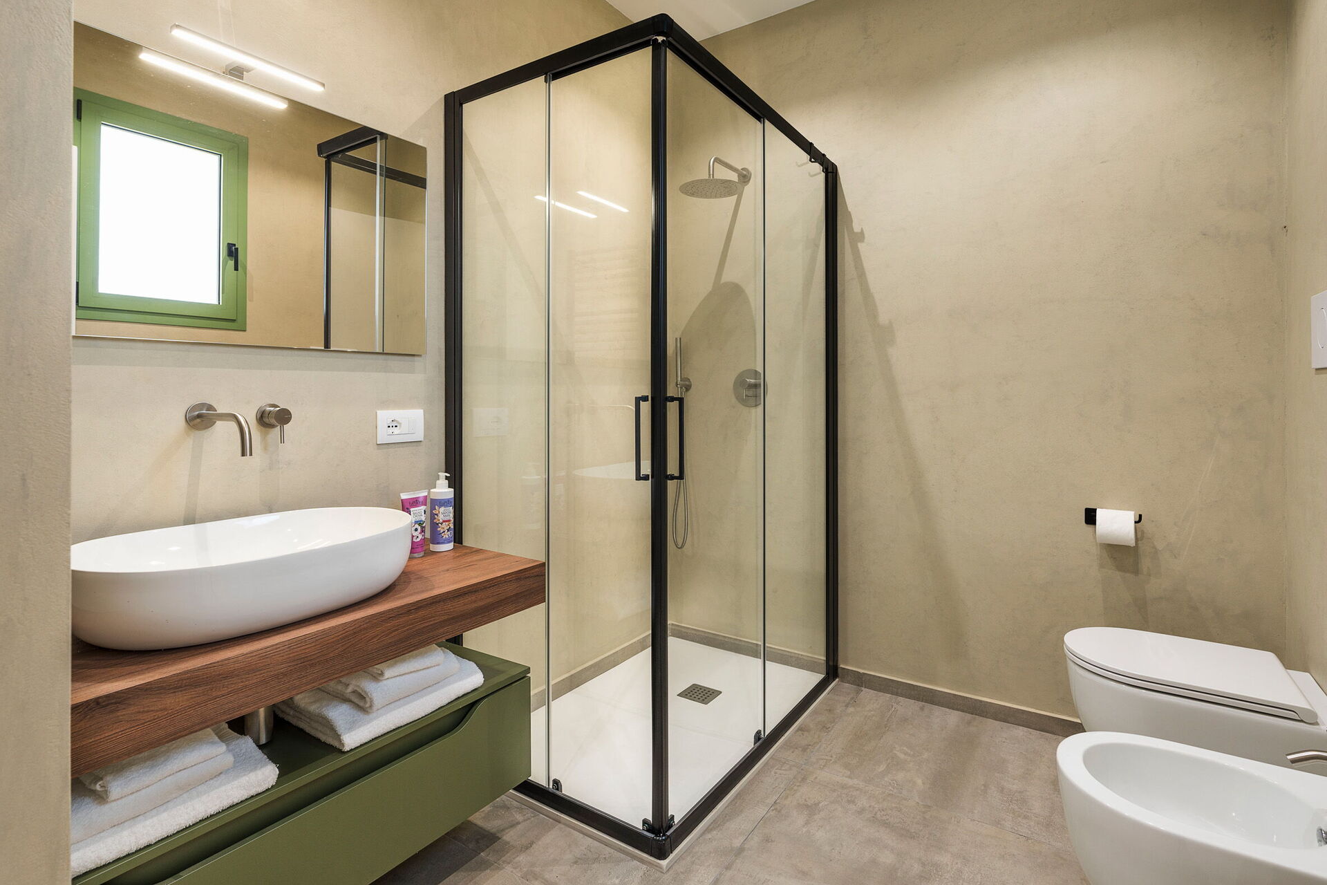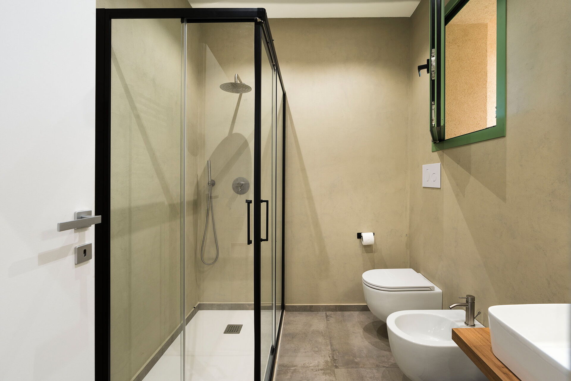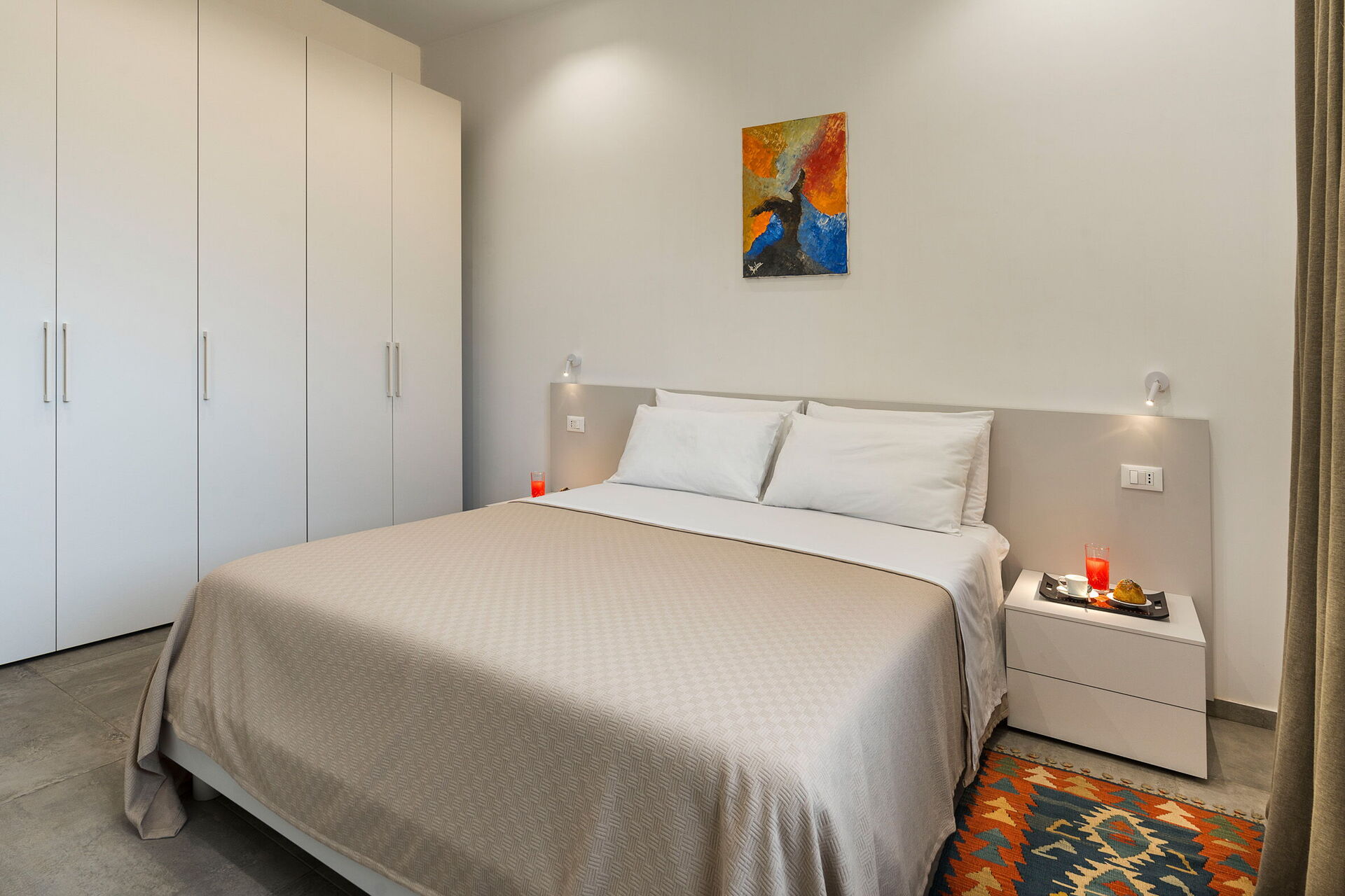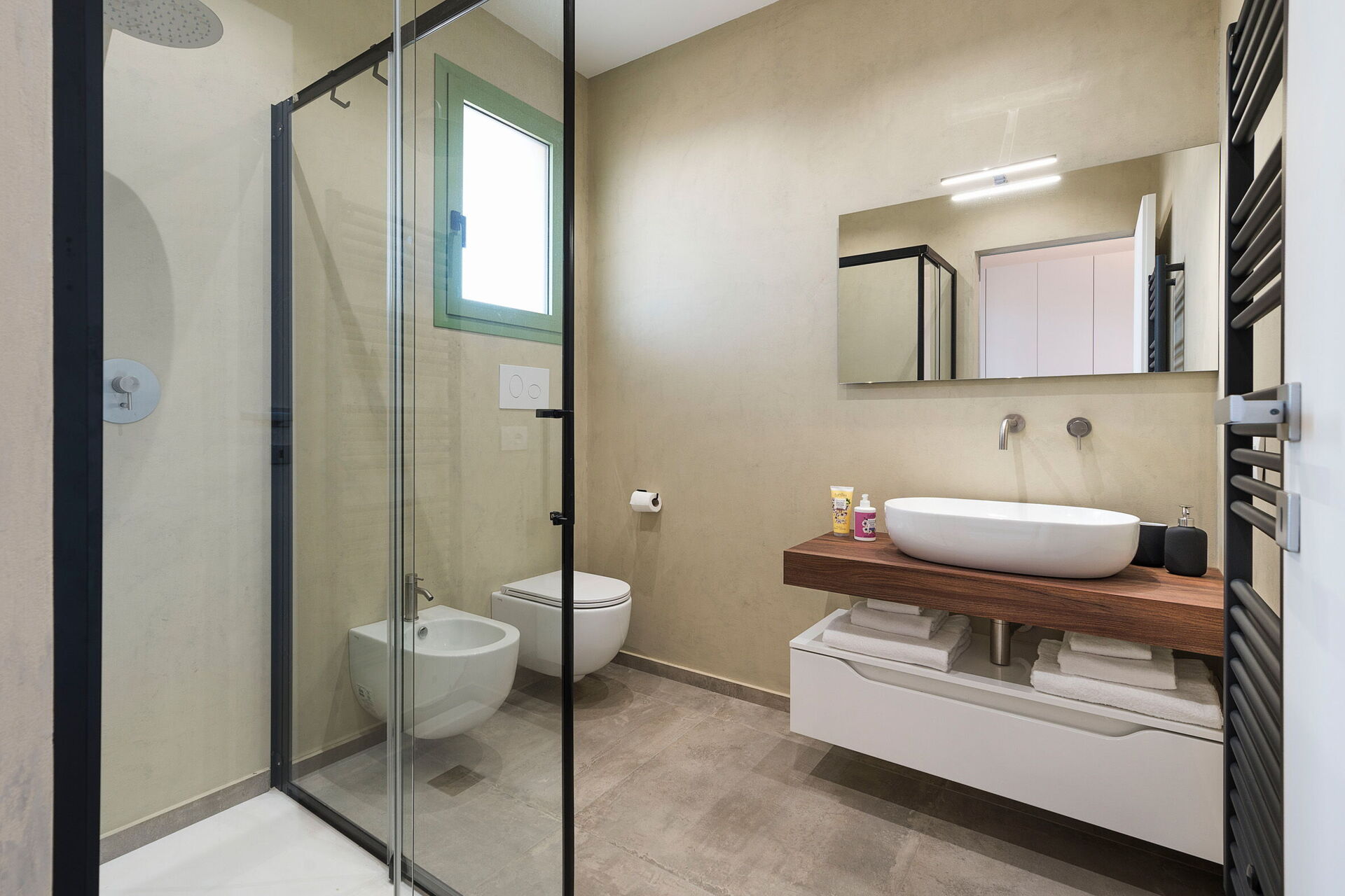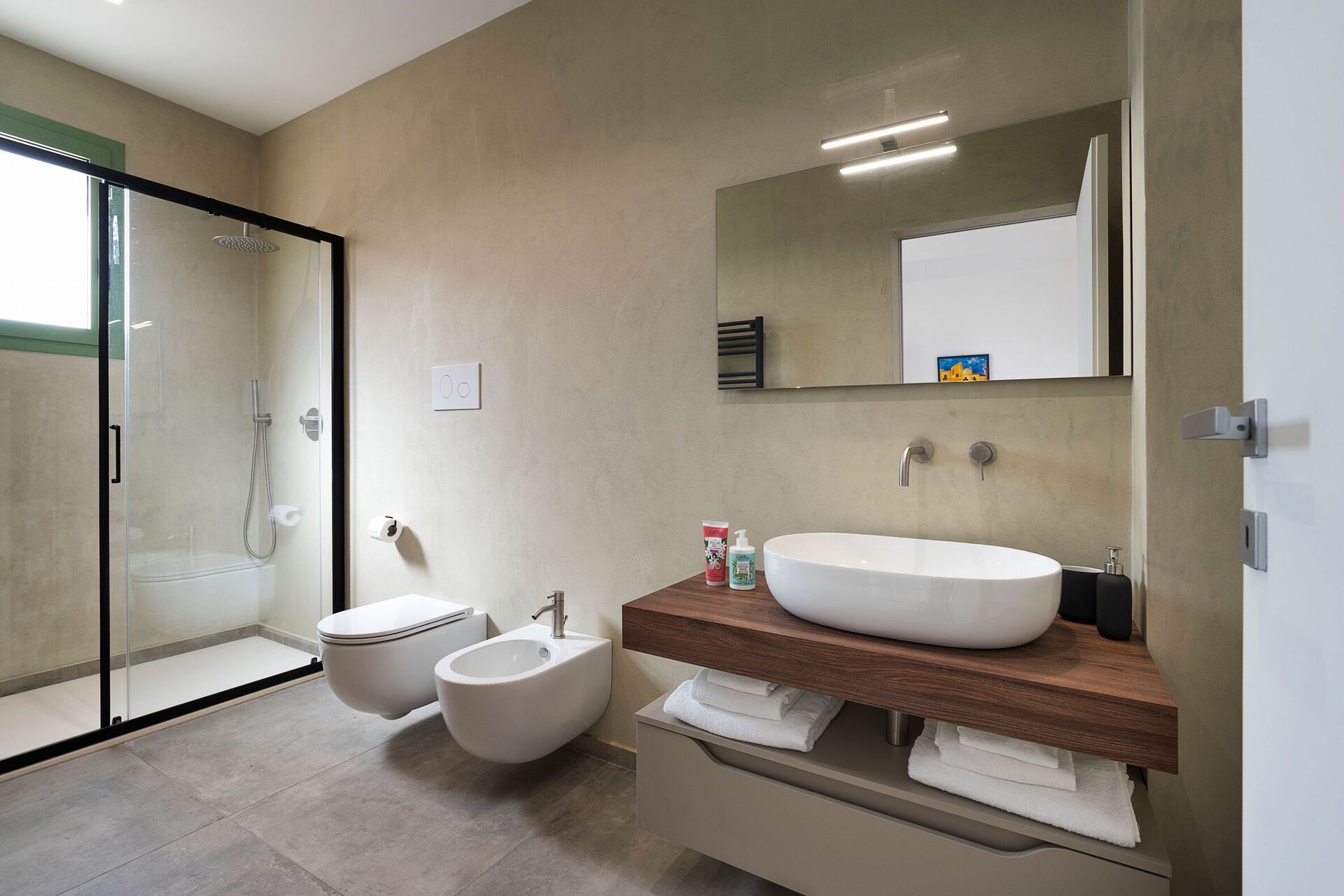 Bottenvåning: vardagsrum (luftkonditionering, TV) med matplats och kök (spis, ugn, kylskåp, frys, diskmaskin, mikrovågsugn, brödrost, espressomaskin, kaffebryggare), WC, 3 dubbelsovrum (luftkonditionering), alla med eget badrum med dusch.