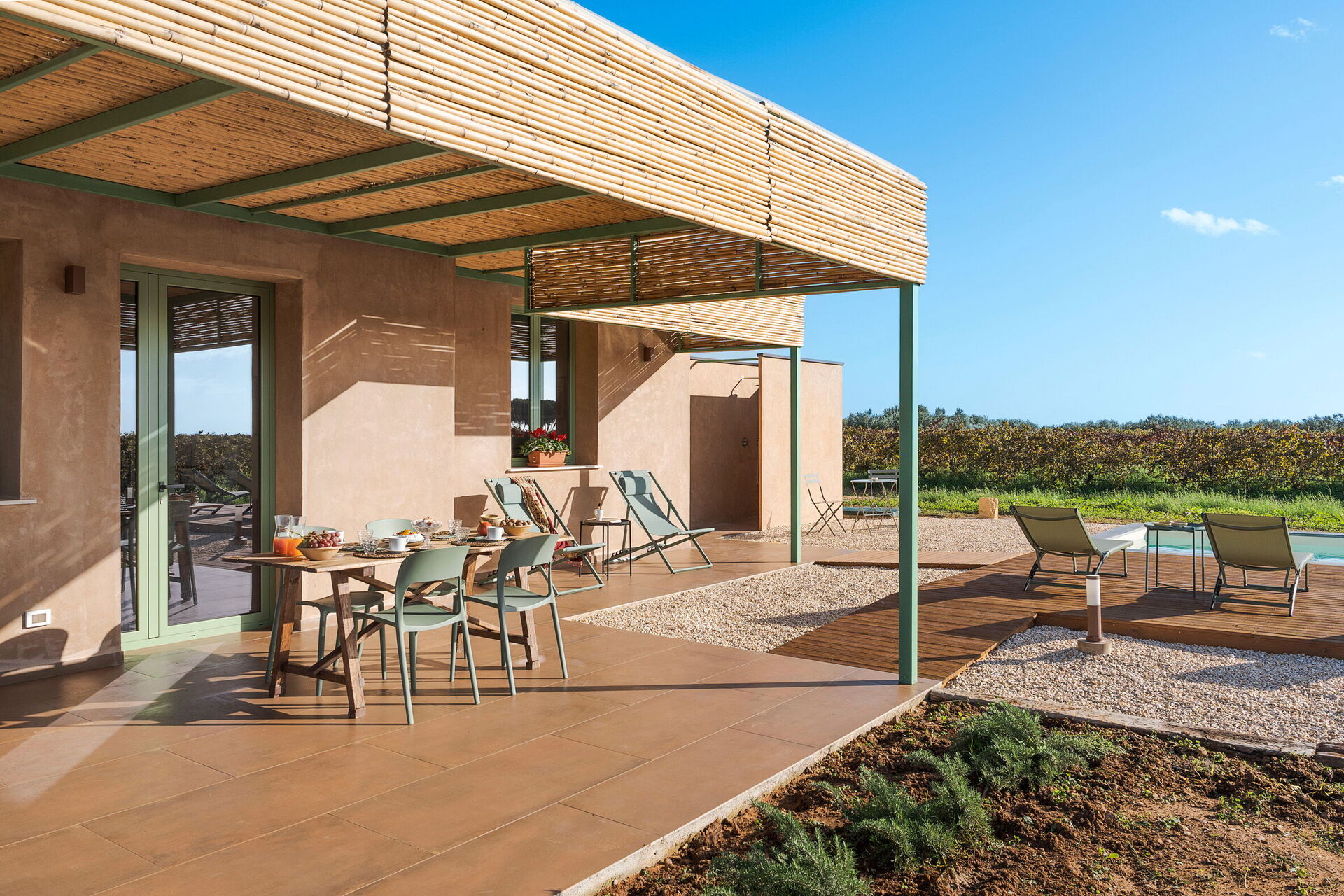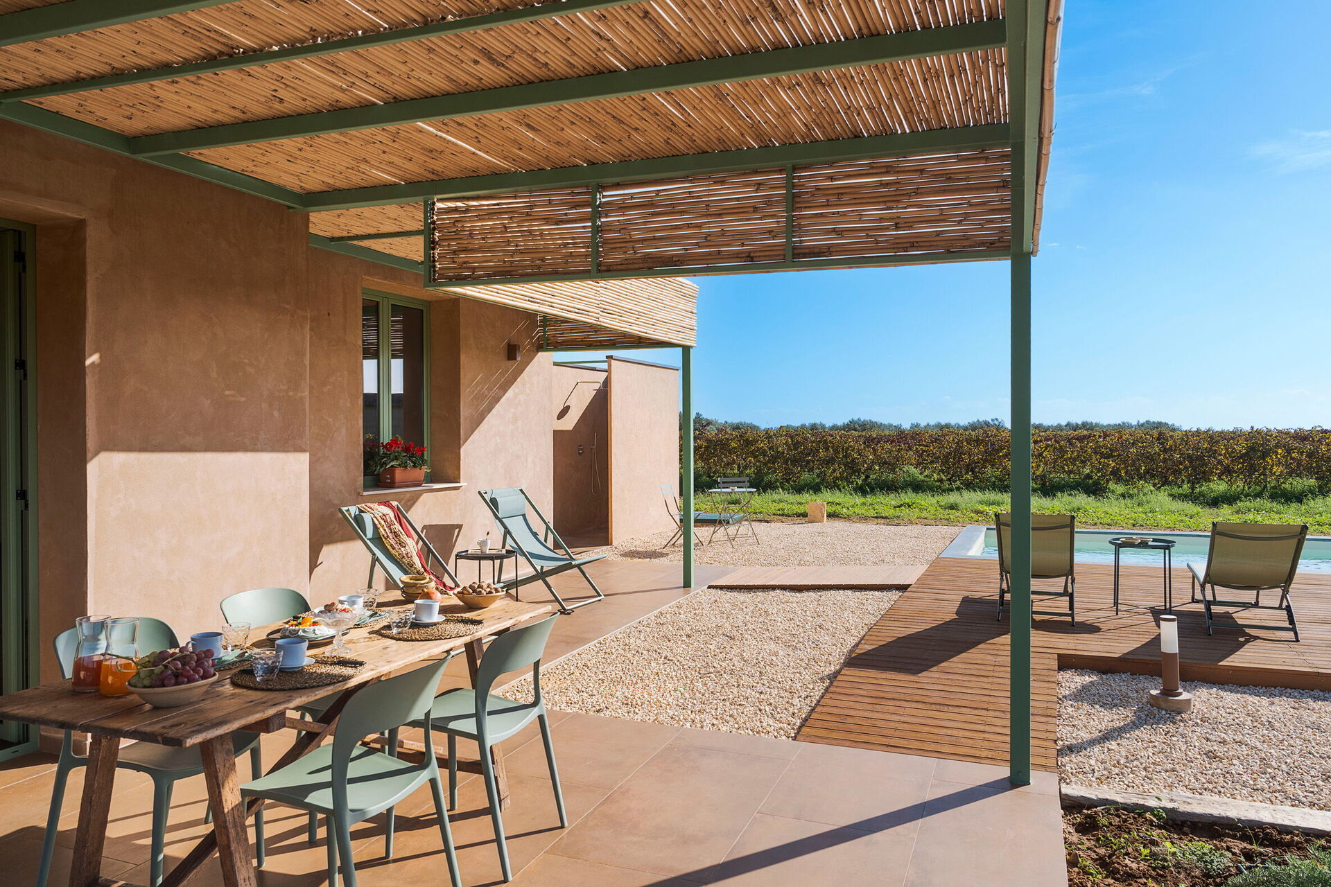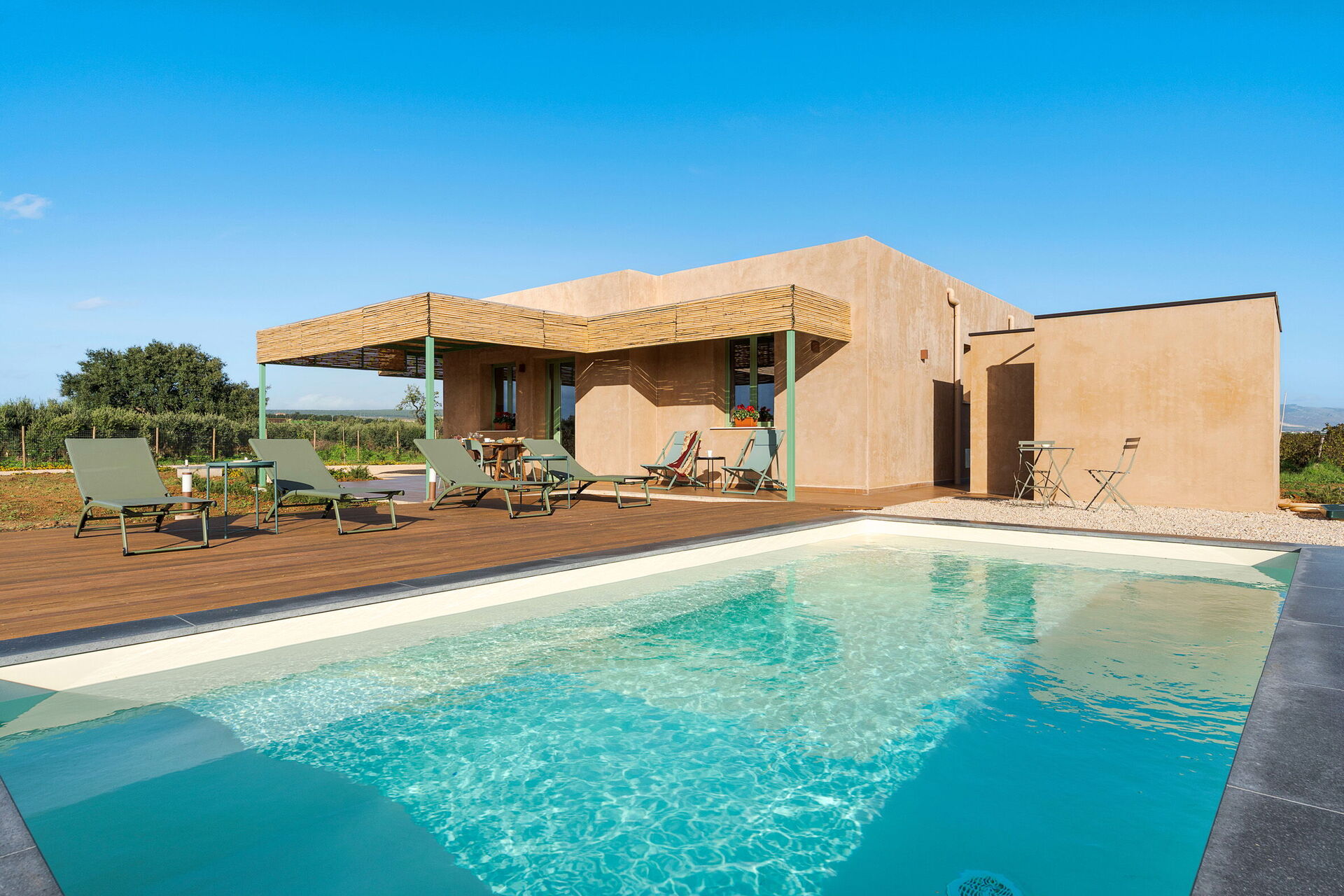 Villans utomhusområden är designade för att förbättra utomhuslivet. Fastigheten har en privat saltvattenpool, omgiven av en stenlagd solterrass utrustad med solsängar. I anslutning till huset finns en stor veranda skuggad av en pergola, möblerad med ett matbord för måltider utomhus och betjänad av en praktisk inbyggd grillplats. Frånvaron av grannbyggnader garanterar tystnad och total avskildhet på den sicilianska landsbygden.