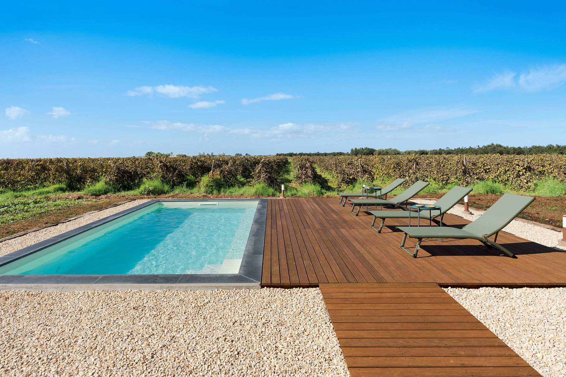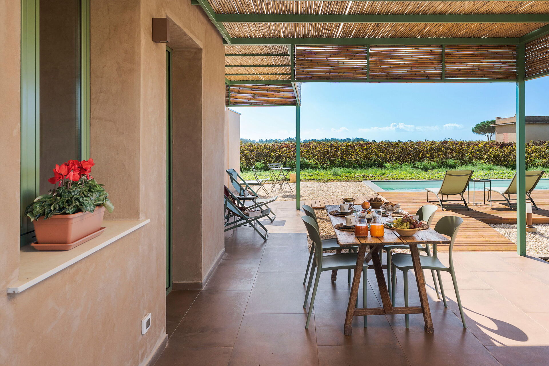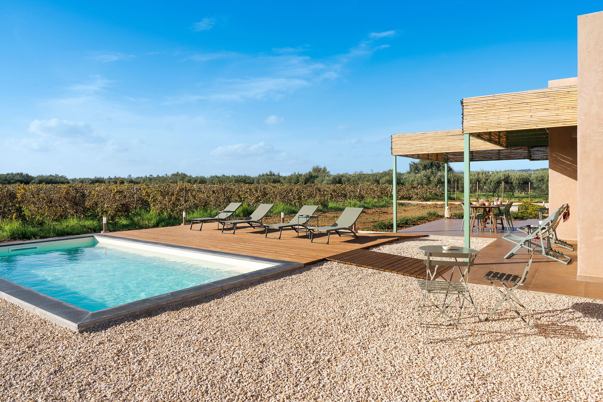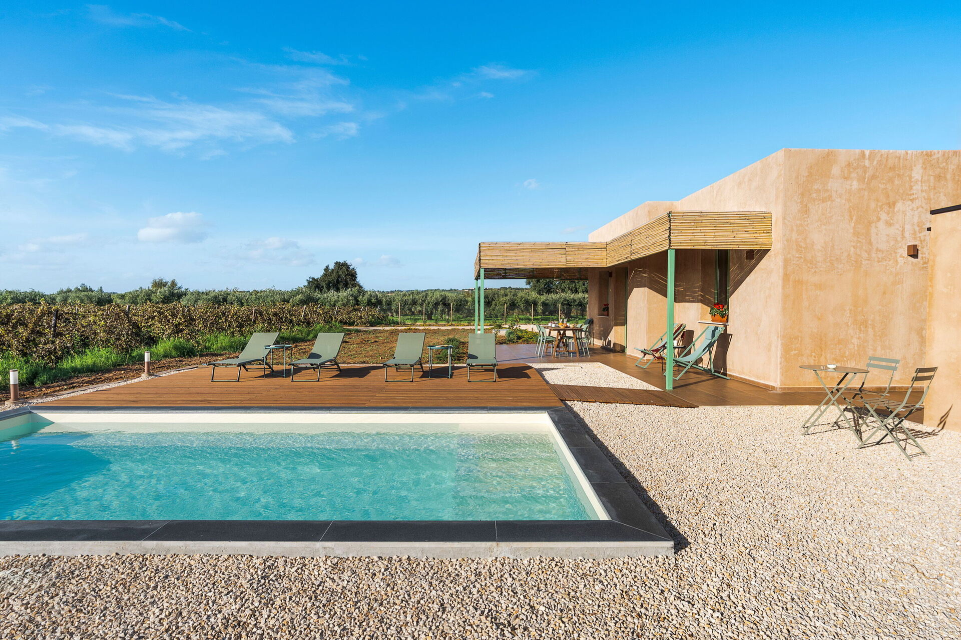 Villans utomhusområden är designade för att förbättra utomhuslivet. Fastigheten har en privat saltvattenpool, omgiven av en stenlagd solterrass utrustad med solsängar. I anslutning till huset finns en stor veranda skuggad av en pergola, möblerad med ett matbord för måltider utomhus och betjänad av en praktisk inbyggd grillplats. Frånvaron av grannbyggnader garanterar tystnad och total avskildhet på den sicilianska landsbygden.