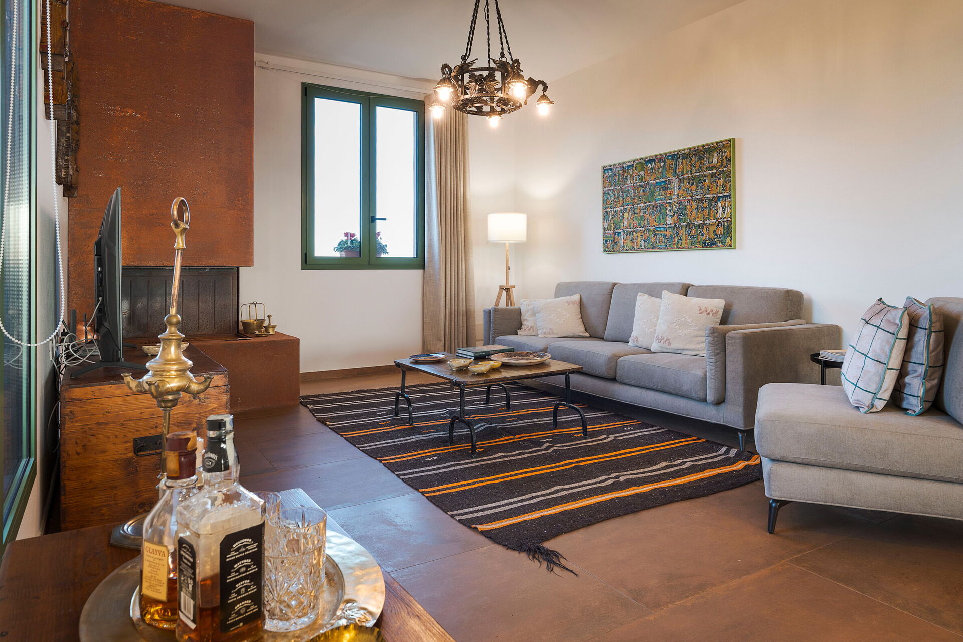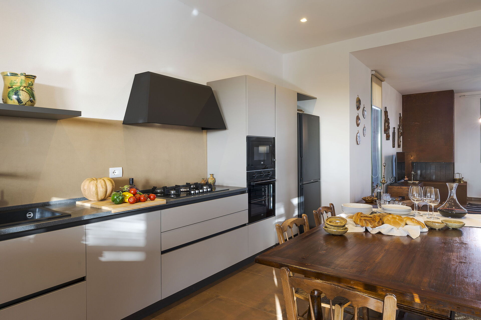 - Bottenvåning: Entrén öppnar upp till ett ljust sällskapsutrymme som består av en salong med öppen spis och TV, och en matplats med pentry. Det moderna köket är fullt utrustat med spishäll, ugn, kylskåp, frys, diskmaskin, mikrovågsugn, brödrost, espressomaskin och kaffebryggare. Sovavdelningen består av ett huvudsovrum med en king-size säng (180 x 200 cm), ett andra dubbelrum med en standardsäng (160 x 200 cm) och ett komplett badrum utrustat med dusch.