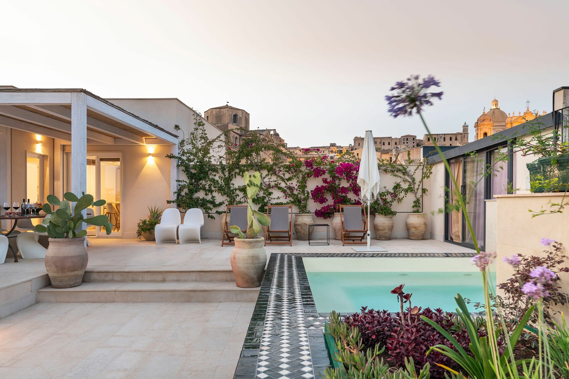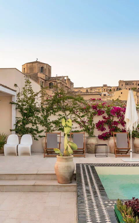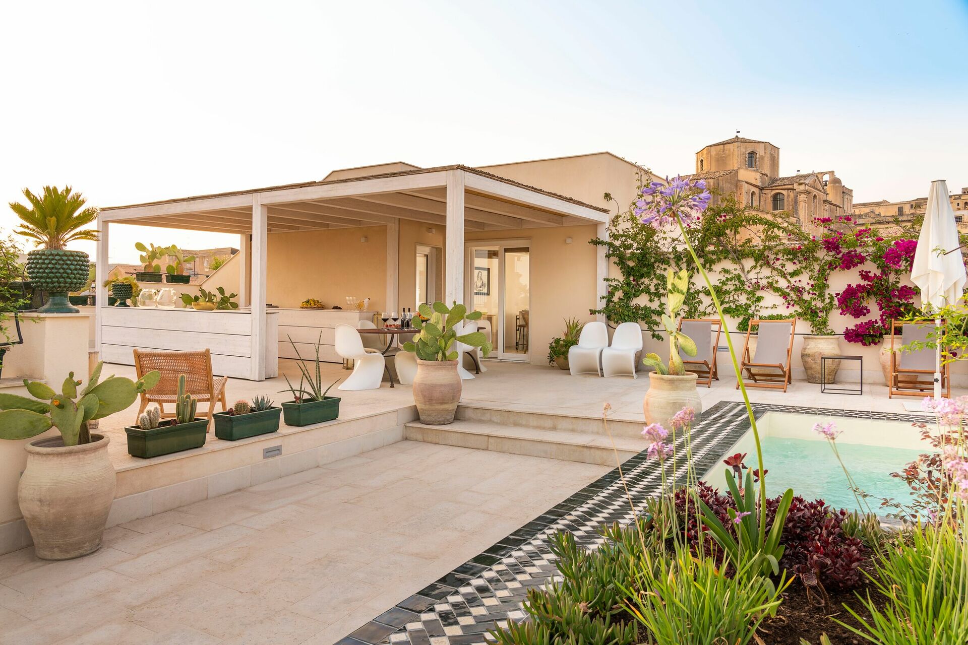 Denna exklusiva semesterlägenheten på Sicilien ligger på andra och tredje våningen i en prestigefylld byggnad med hiss och erbjuder en stor terrass med en minipool och fantastisk utsikt över hustaken i Gamla stan.