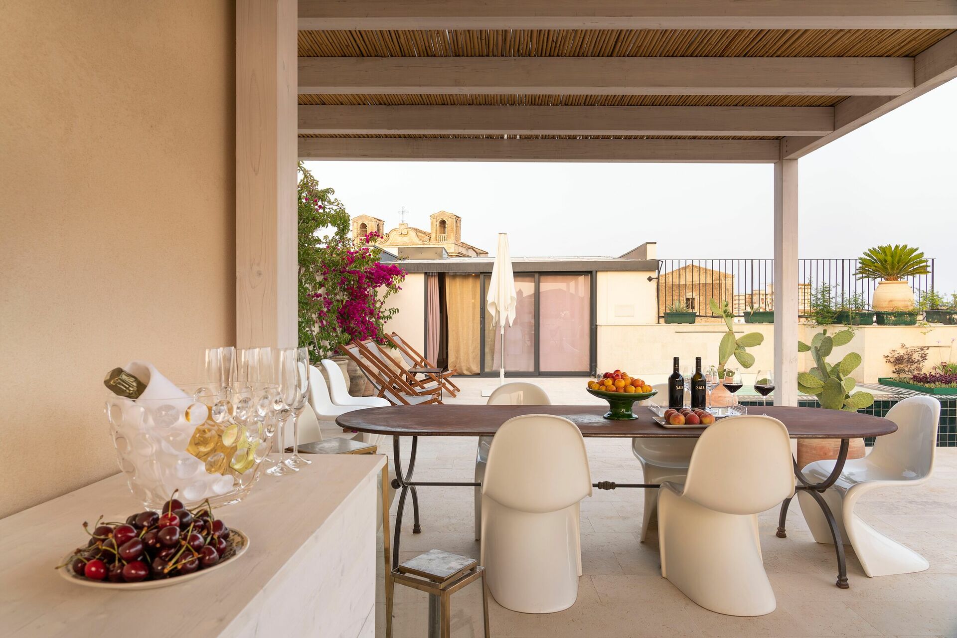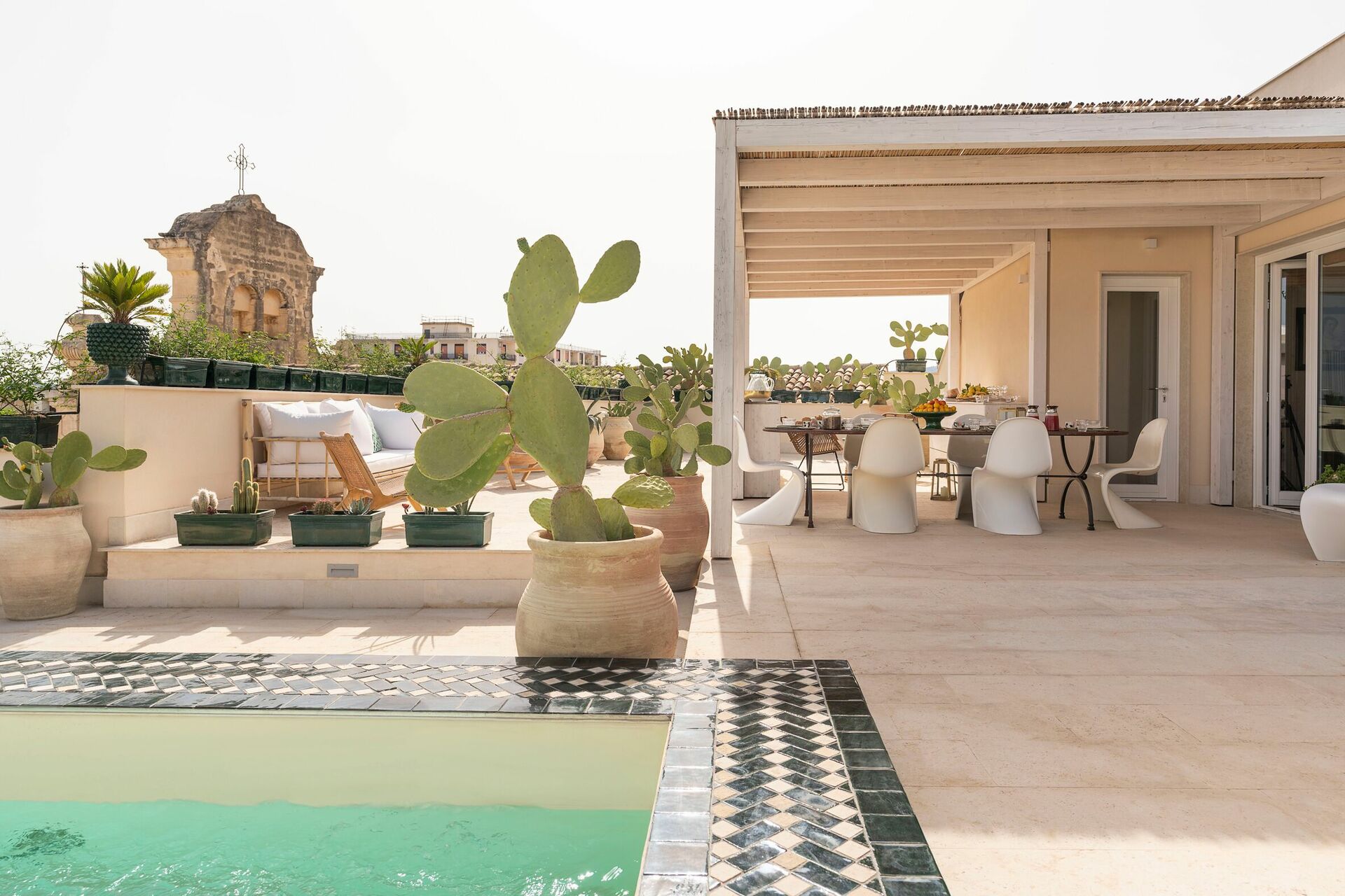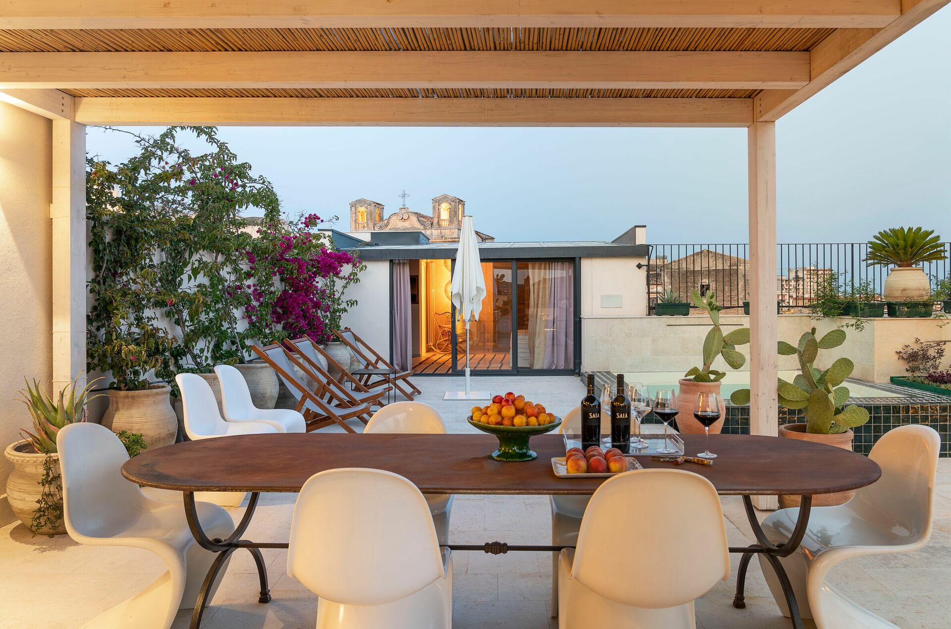 Denna exklusiva semesterlägenheten på Sicilien ligger på andra och tredje våningen i en prestigefylld byggnad med hiss och erbjuder en stor terrass med en minipool och fantastisk utsikt över hustaken i Gamla stan.