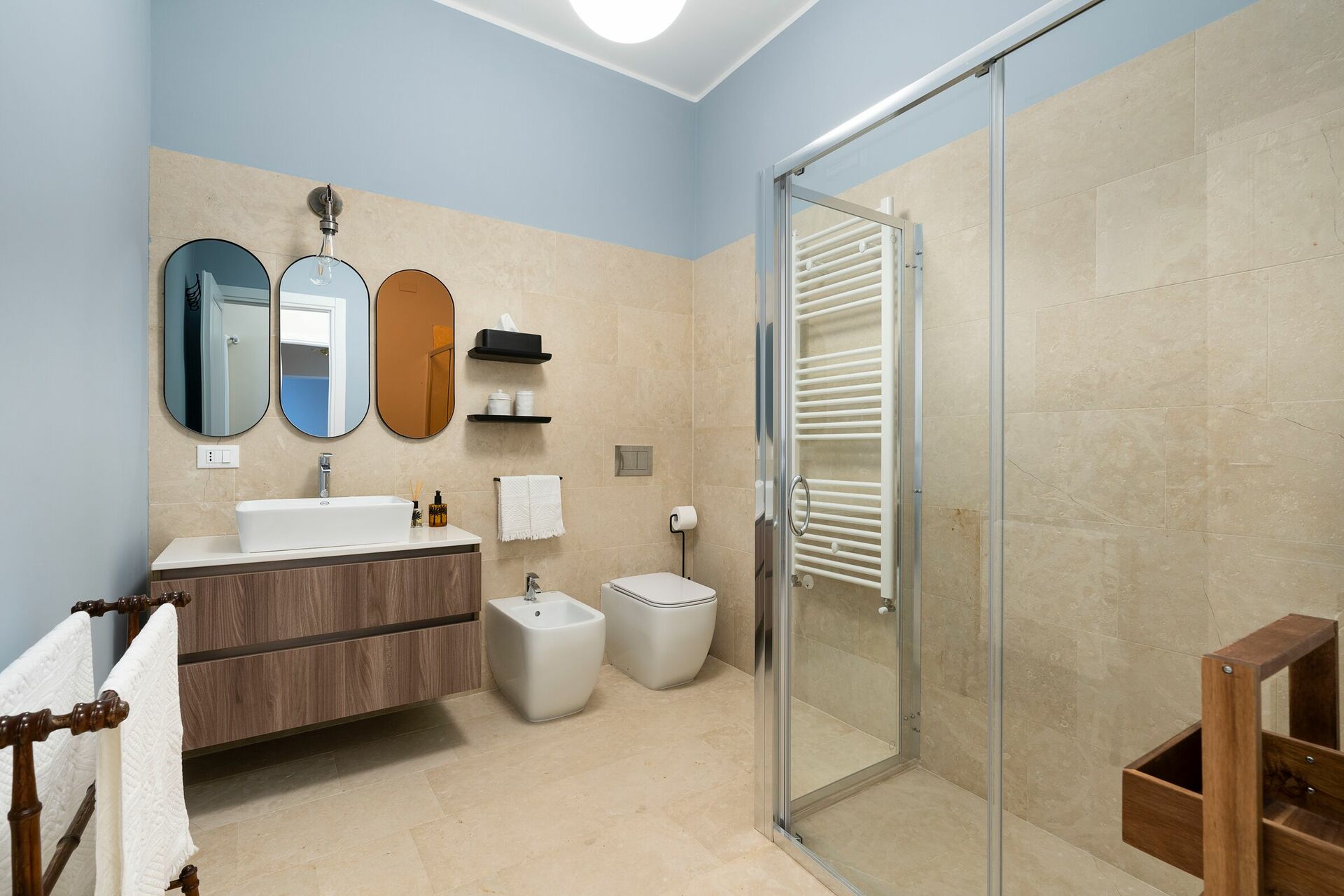 Andra våningen: (tillgänglig med hiss) stort vardagsrum; 1 badrum (toalett och handfat); 1 dubbelrum (king size-säng) med privat badrum med badkar; 1 dubbelrum med eget badrum med dusch; 1 sovrum med 2 enkelsängar och eget badrum med dusch.