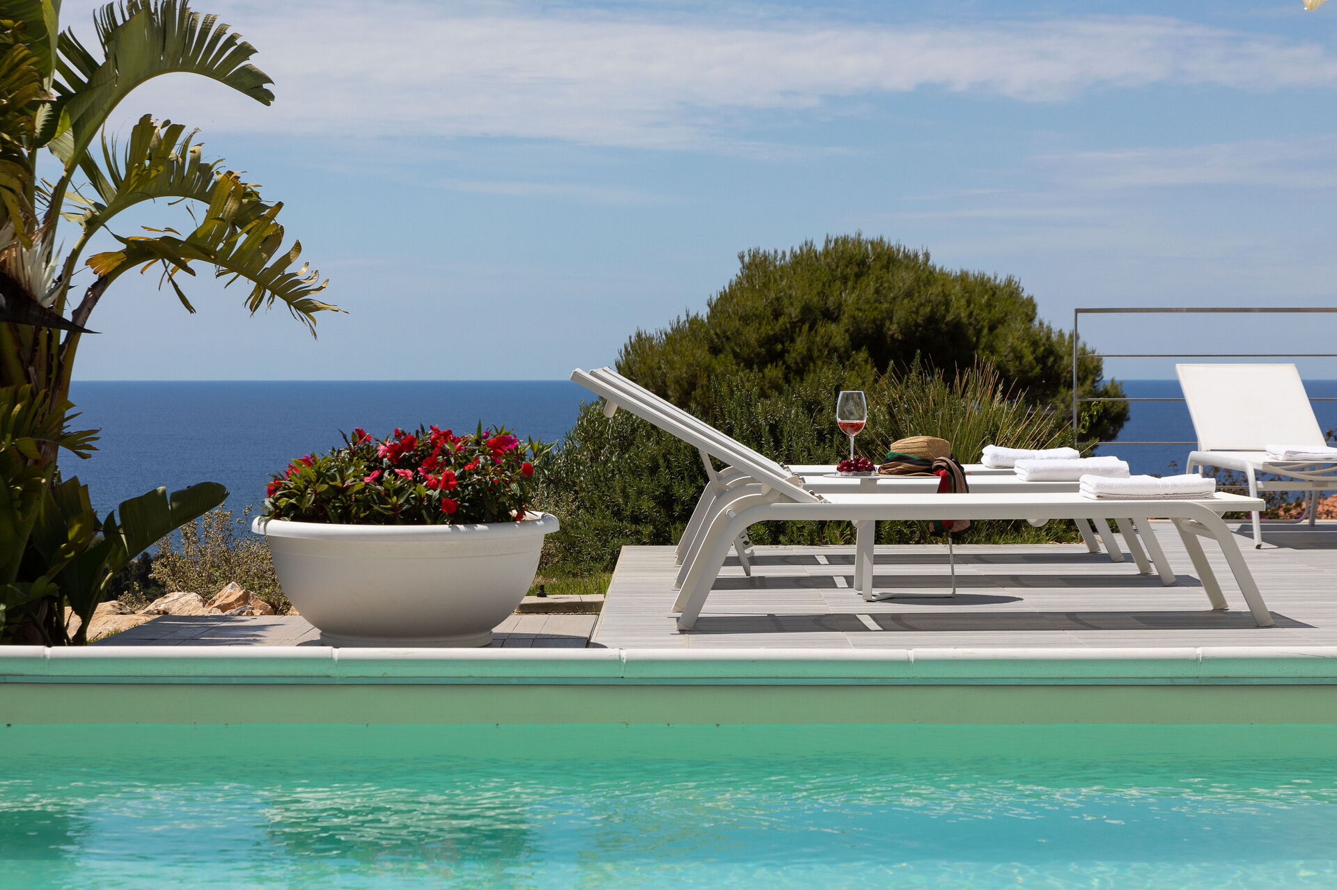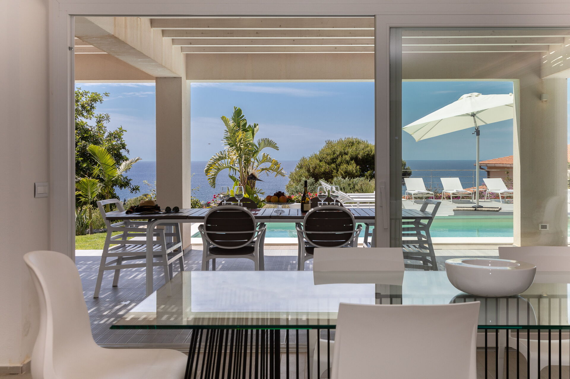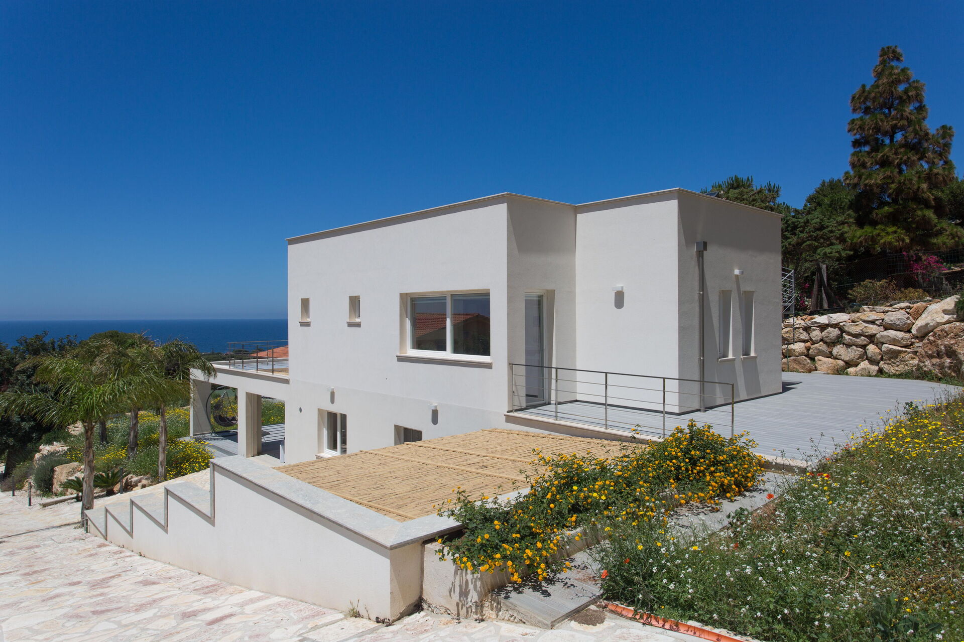 Fastigheten har en stor veranda som leder till trädgården, där du hittar en privat pool. Från de stora fönstren i huset har du en vacker utsikt hela vägen till Egadiöarna.
