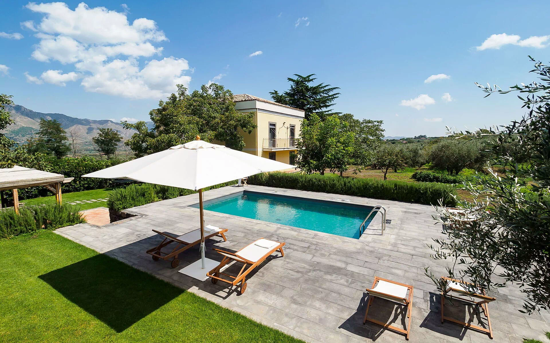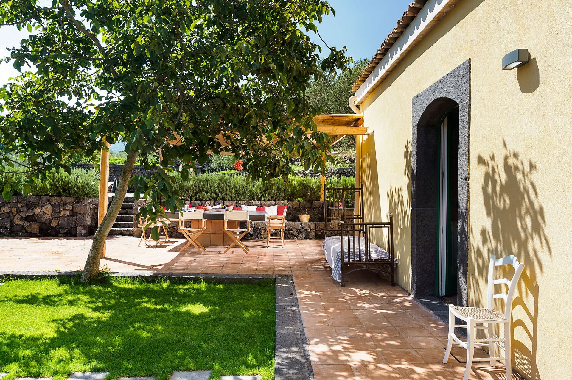 Semesterhuset ligger på de pittoreska kullarna runt Etna, och är omgivet av en lummig välskött trädgård inramad av karakteristiska stenmurar. Det finns även stora terrasser och en liten uppvärmd pool med solterrass för att kunna koppla av eller svalka varma sommardagar.