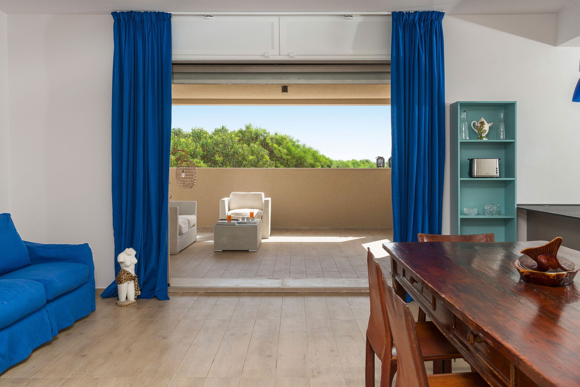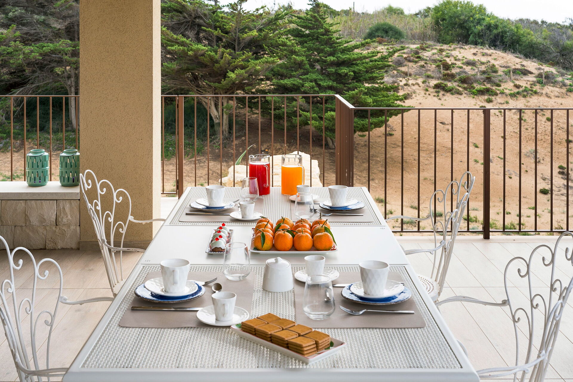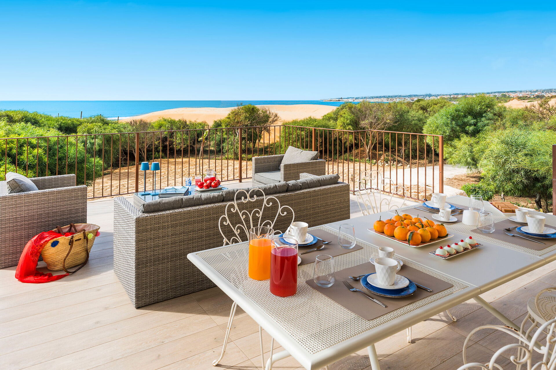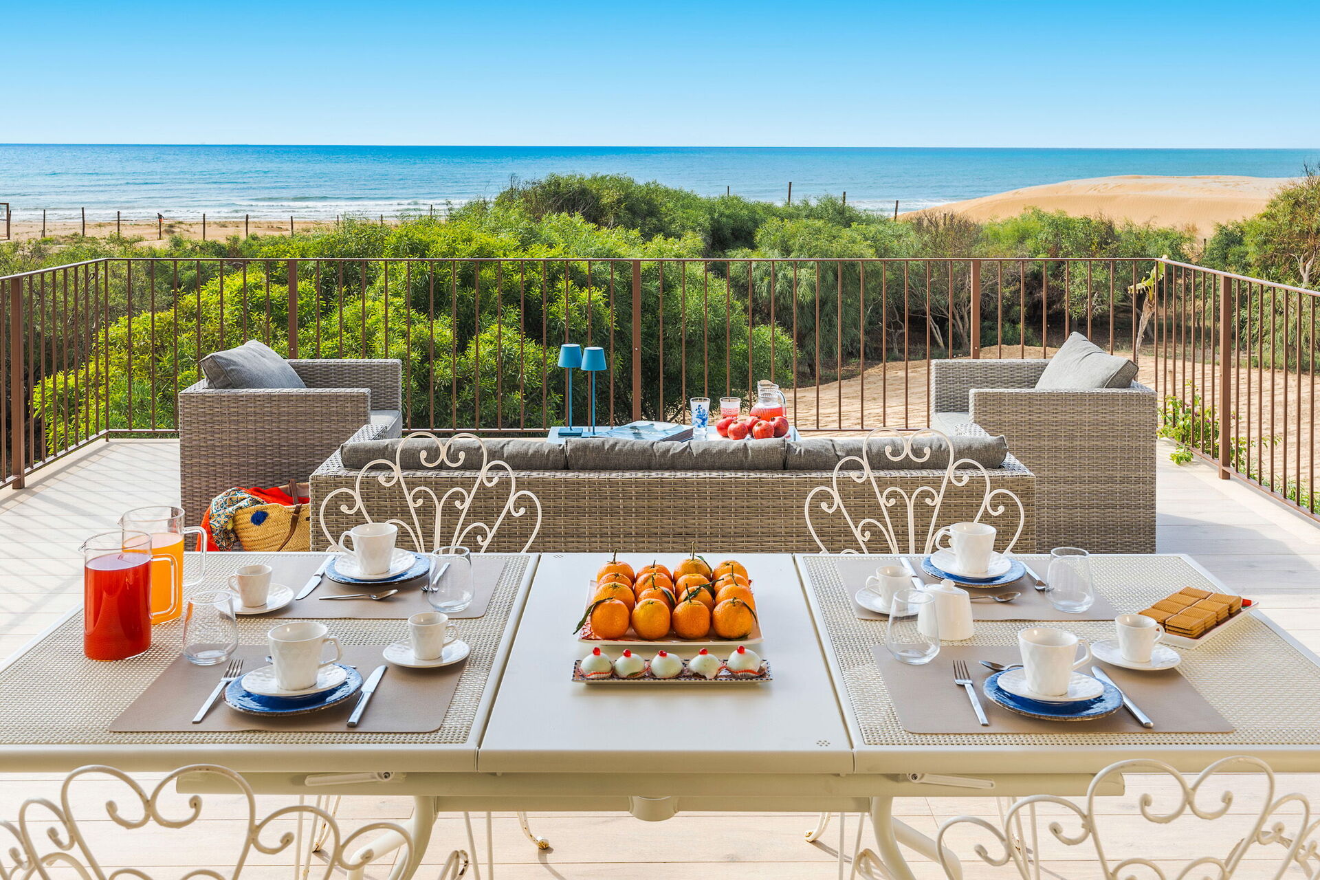 Den stora terrassen med utsikt över havet är möblerad för att kunna äta ute; här kan du koppla av och njuta av en fantastisk panoramautsikt över byn Sampieri och havet.