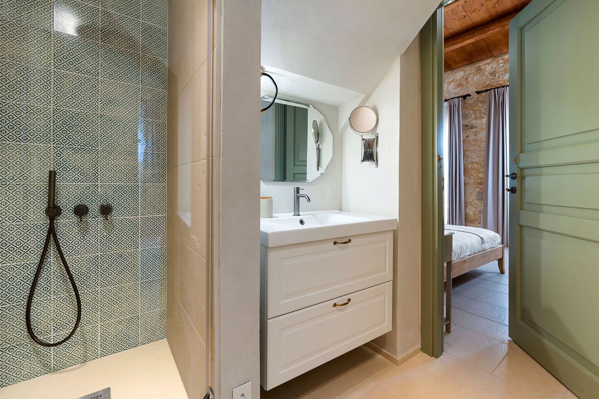 Bottenvåning (endast tillgänglig från utsidan, och inte ansluten till resten av villan inomhus): 2 dubbelrum (sängmått: 180 x 200 cm) med eget badrum med dusch; sovrum med dubbelsäng (sängmått: 160 x 200 cm), enkelsäng och eget badrum med dusch; tvättstuga.