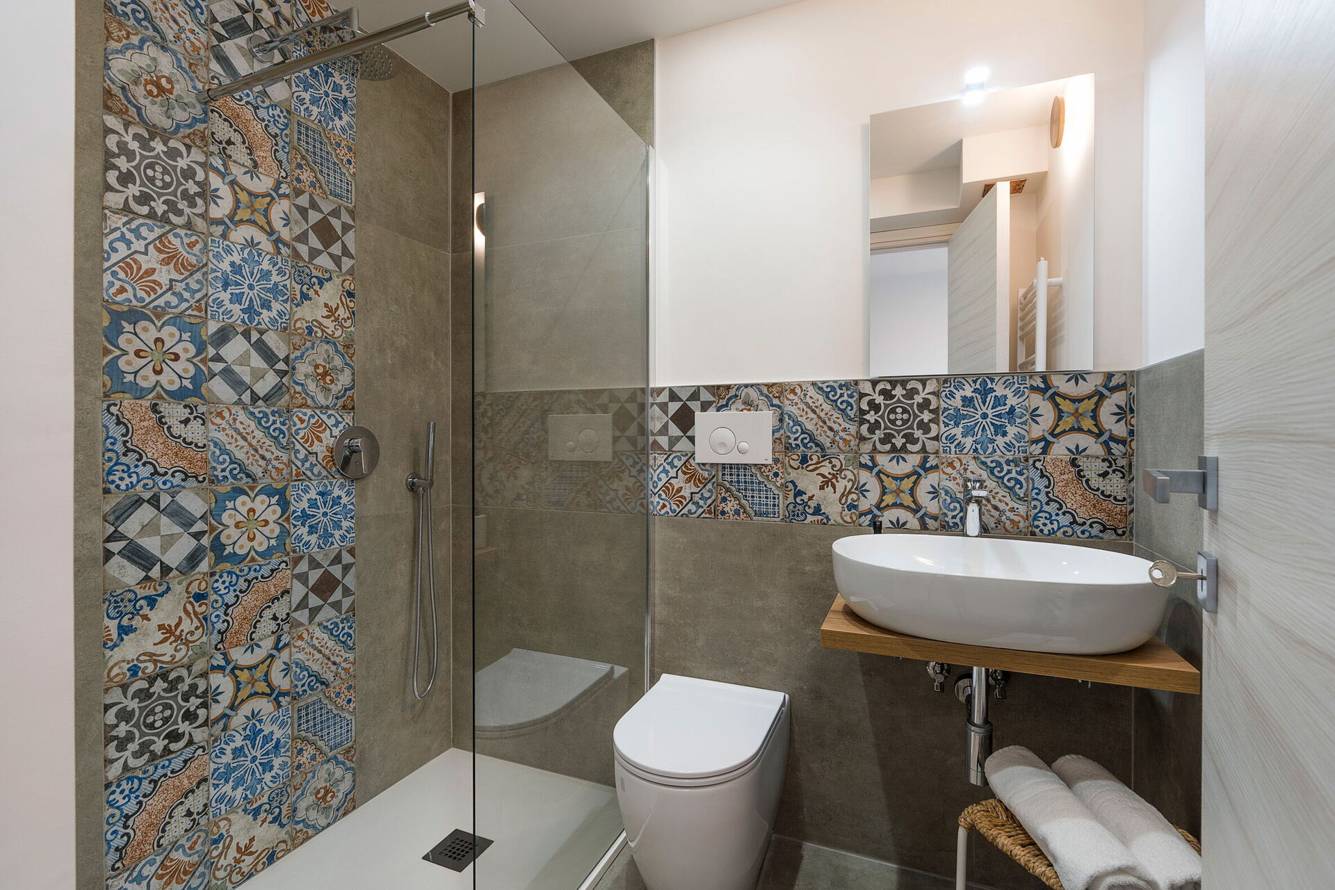 Första våningen: kök (spishäll, frys, kylskåp, air fryer, espressomaskin) med matplats och tillgång till terrass, dubbelrum (160 x 200 cm) med privat badrum med dusch, dubbelrum (160/80 x 200 cm; kan delas till 2 enkelsängar på begäran), badrum med dusch.