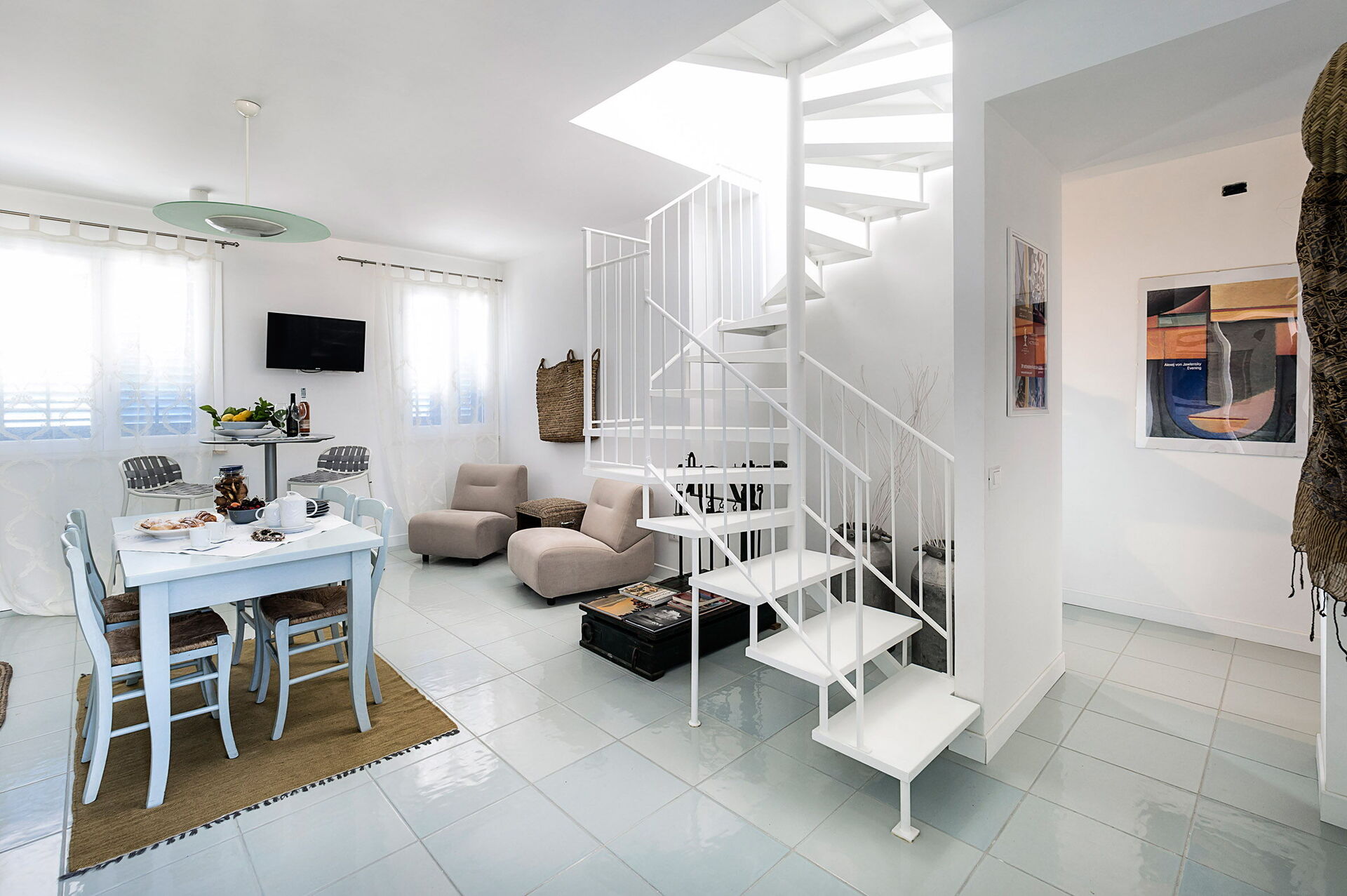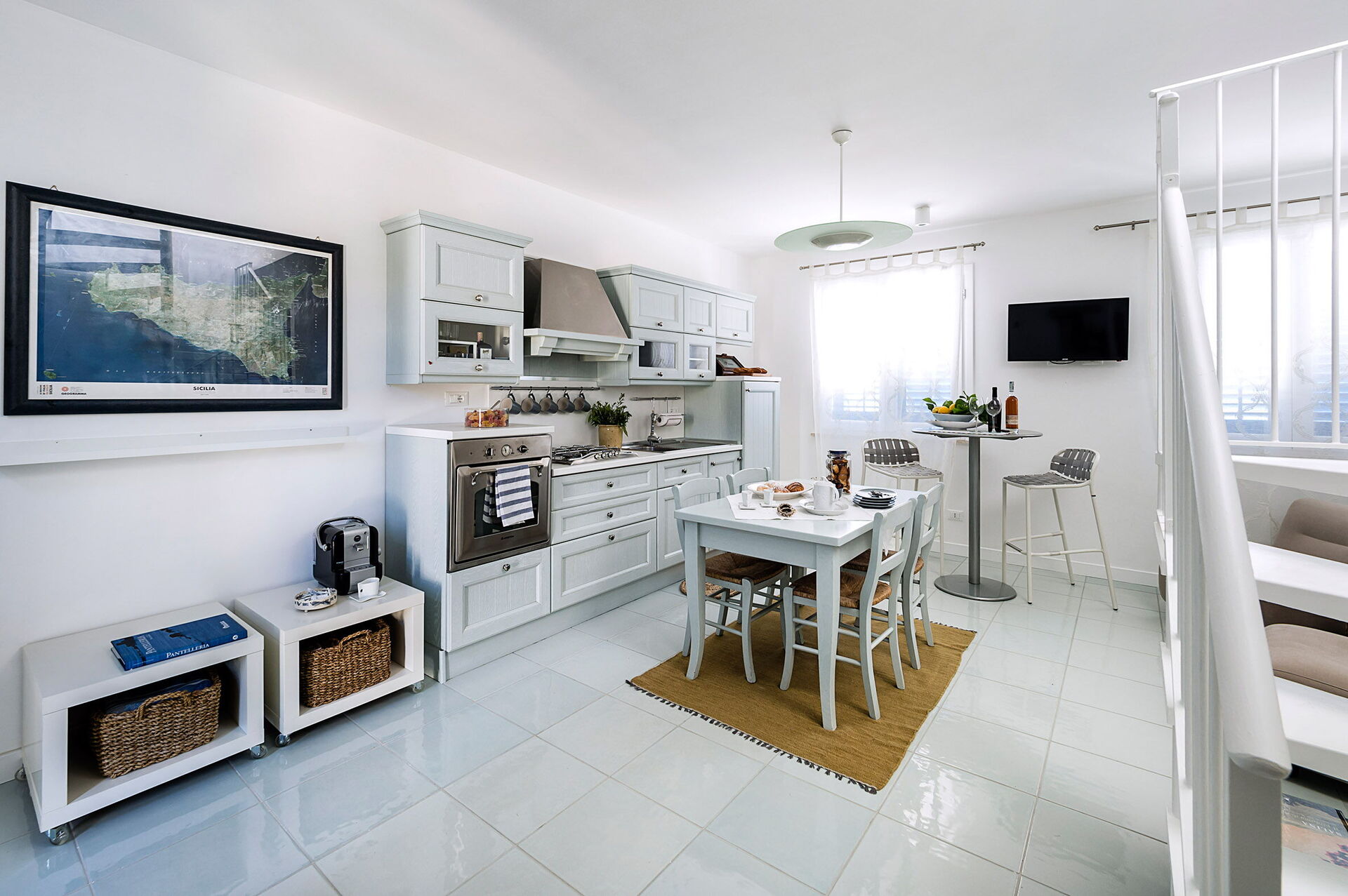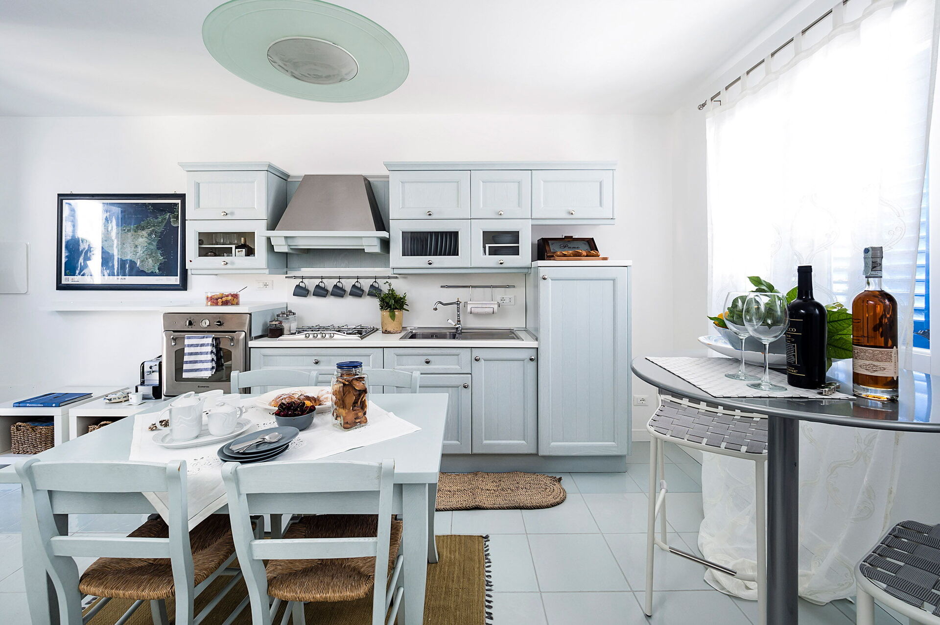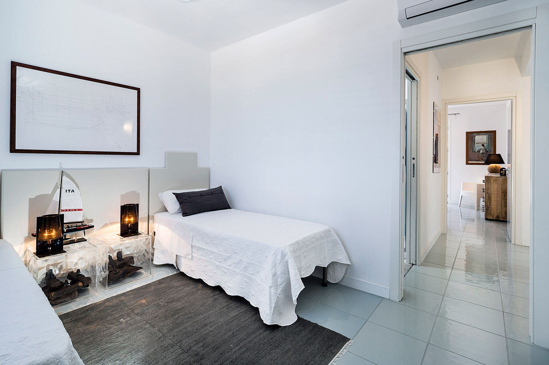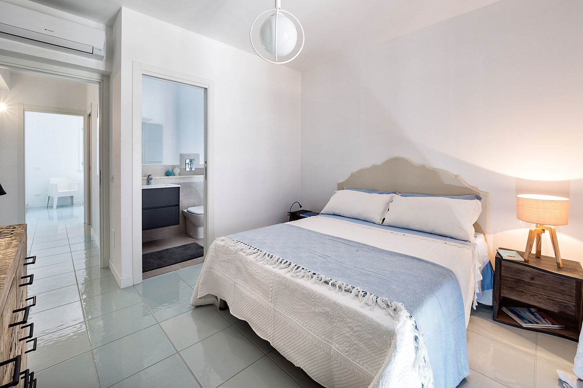 Vardagsrum (luftkonditionering, TV) med pentry (spishäll, ugn, frys, kyl, diskmaskin, kaffebryggare, brödrost) och matsal, 1 dubbelrum (luftkonditionering, myggnät) med eget badrum med dusch, 1 tvåbäddsrum (luftkonditionering, myggnät), badrum med dusch