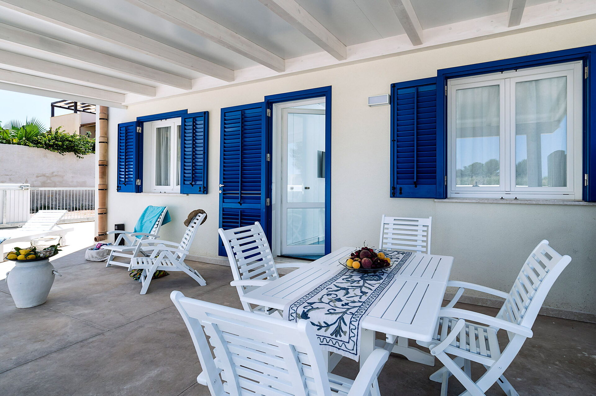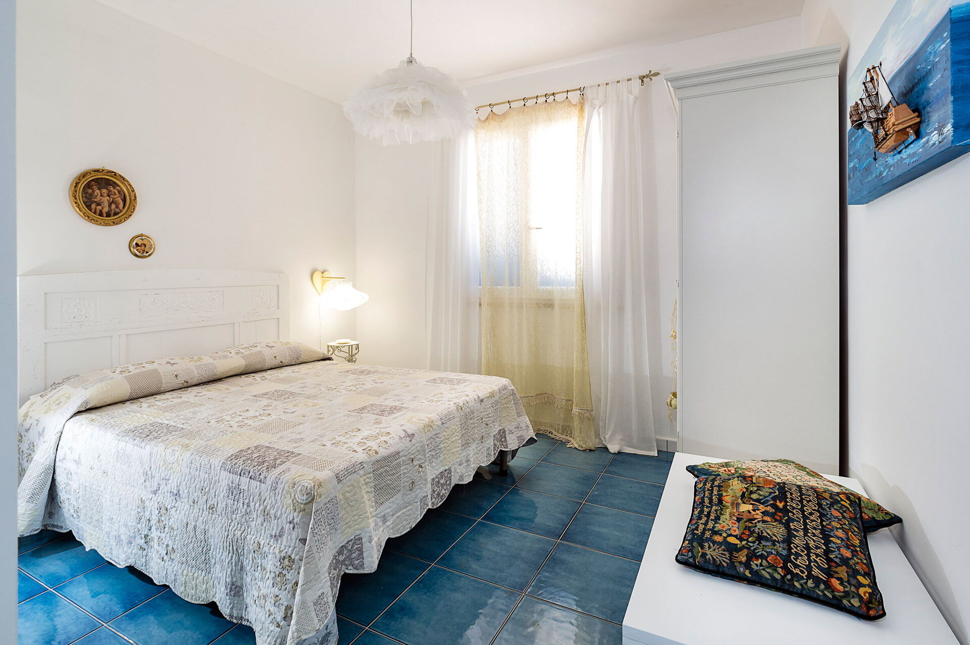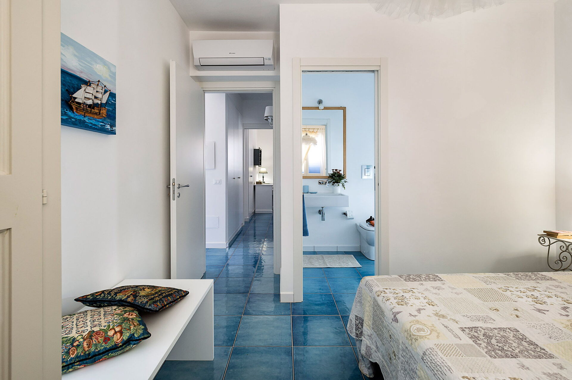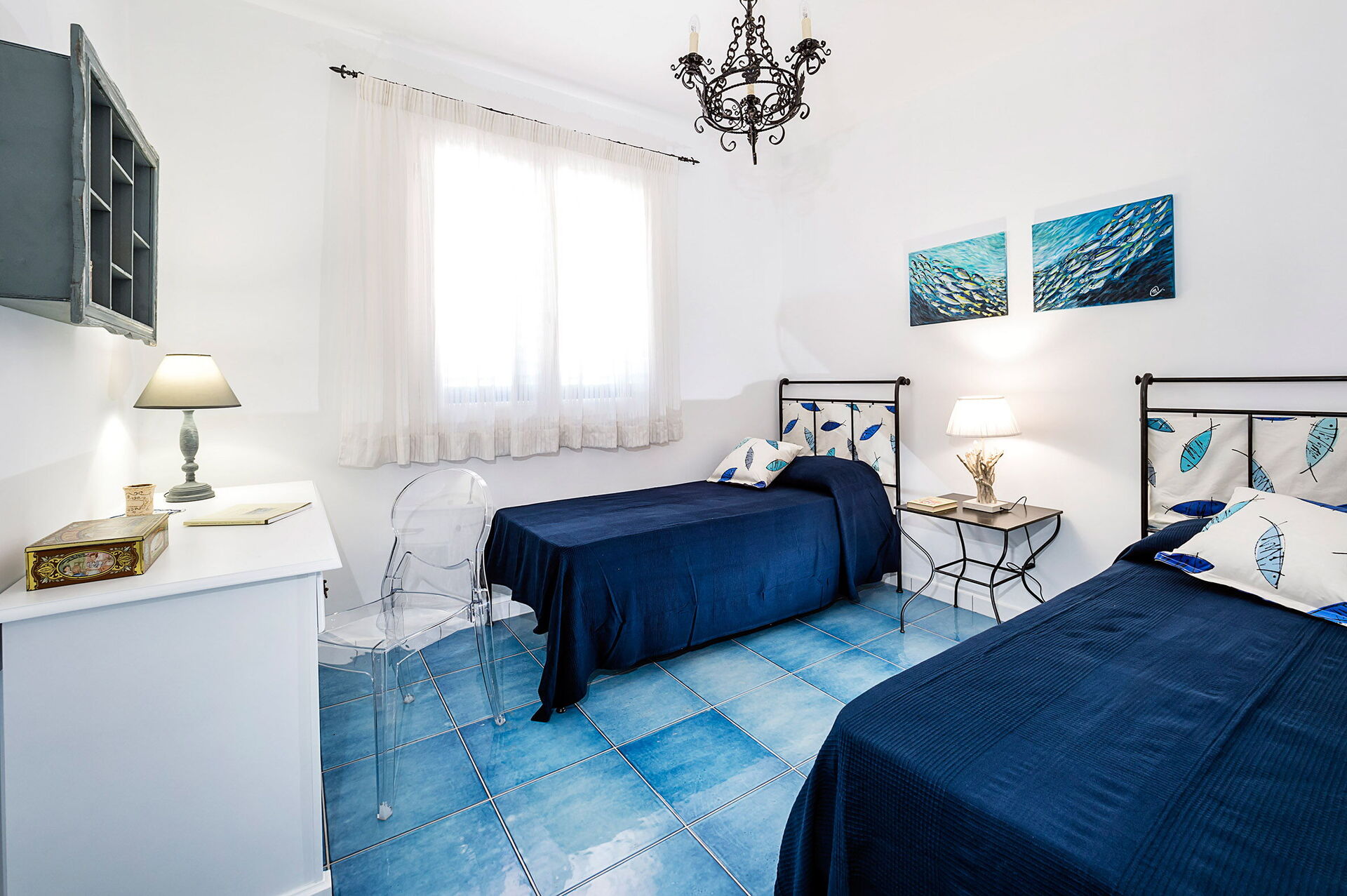 Vardagsrum med enkel bäddsoffa (luftkonditionering, TV) och kök (spishäll, ugn, kyl, frys, diskmaskin, mikrovågsugn, brödrost, espressomaskin) med matplats, 1 dubbelrum (luftkonditionering, myggnät) med privat badrum med dusch, 1 tvåbäddsrum, (luftkonditionering, myggnät), badrum med dusch.