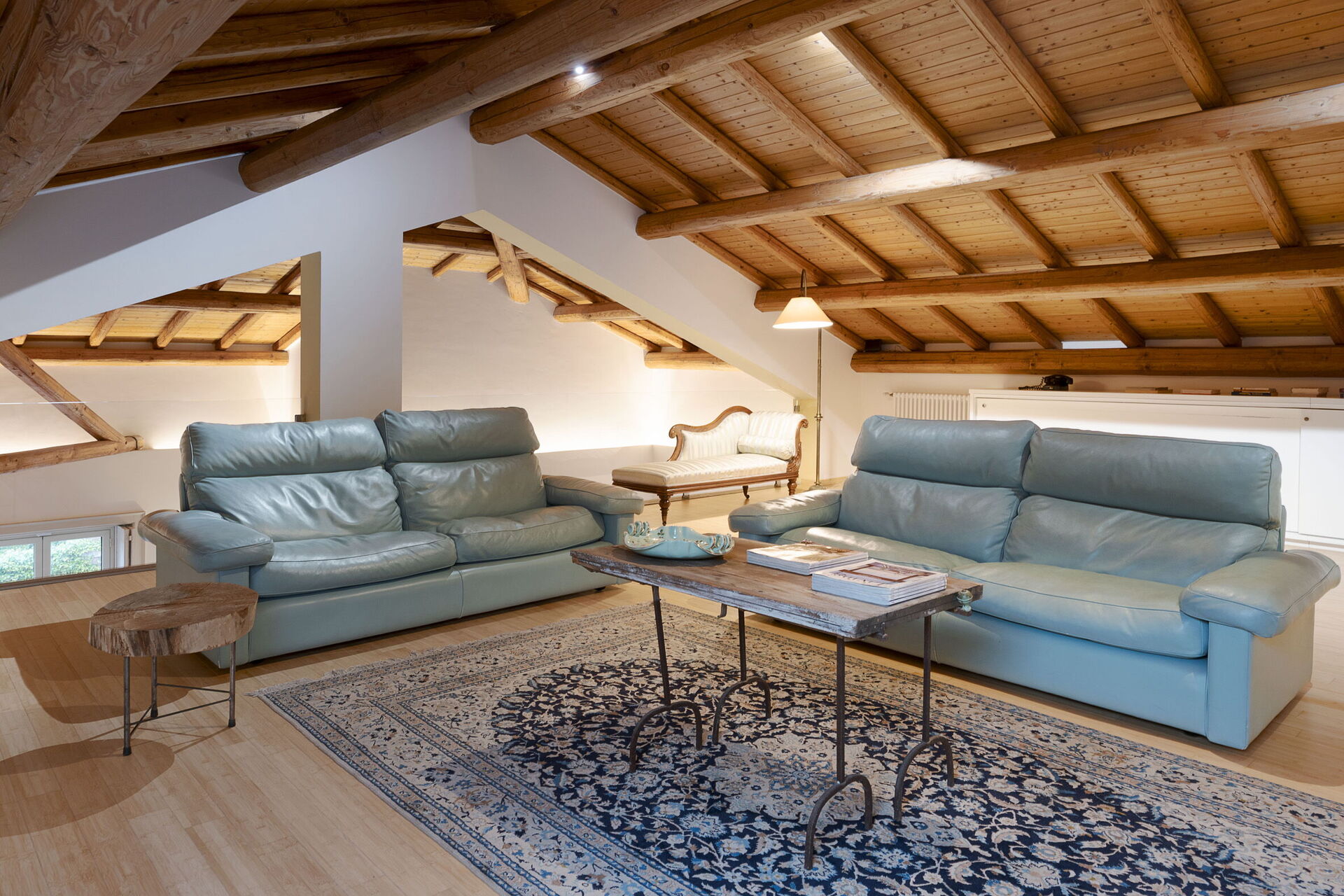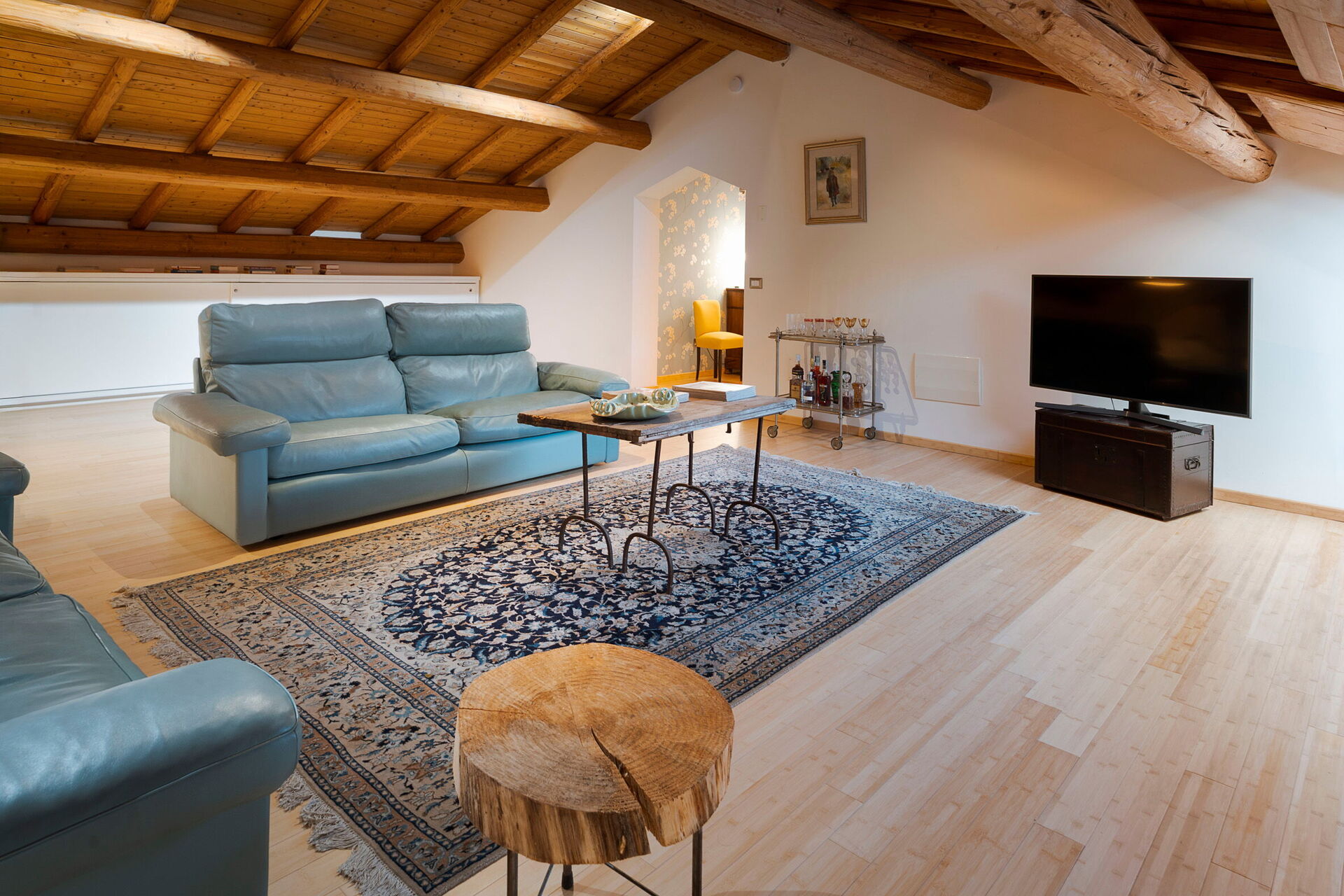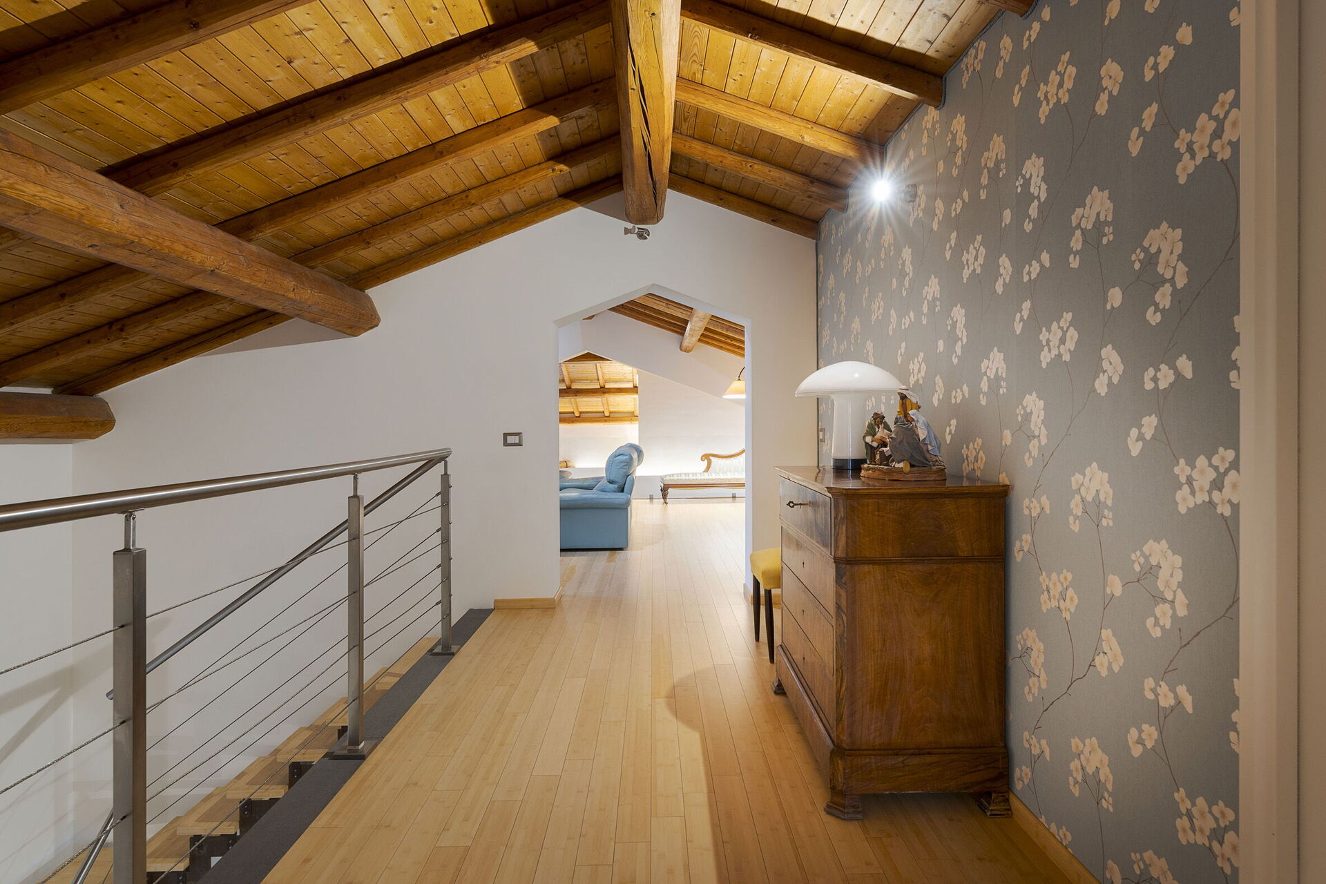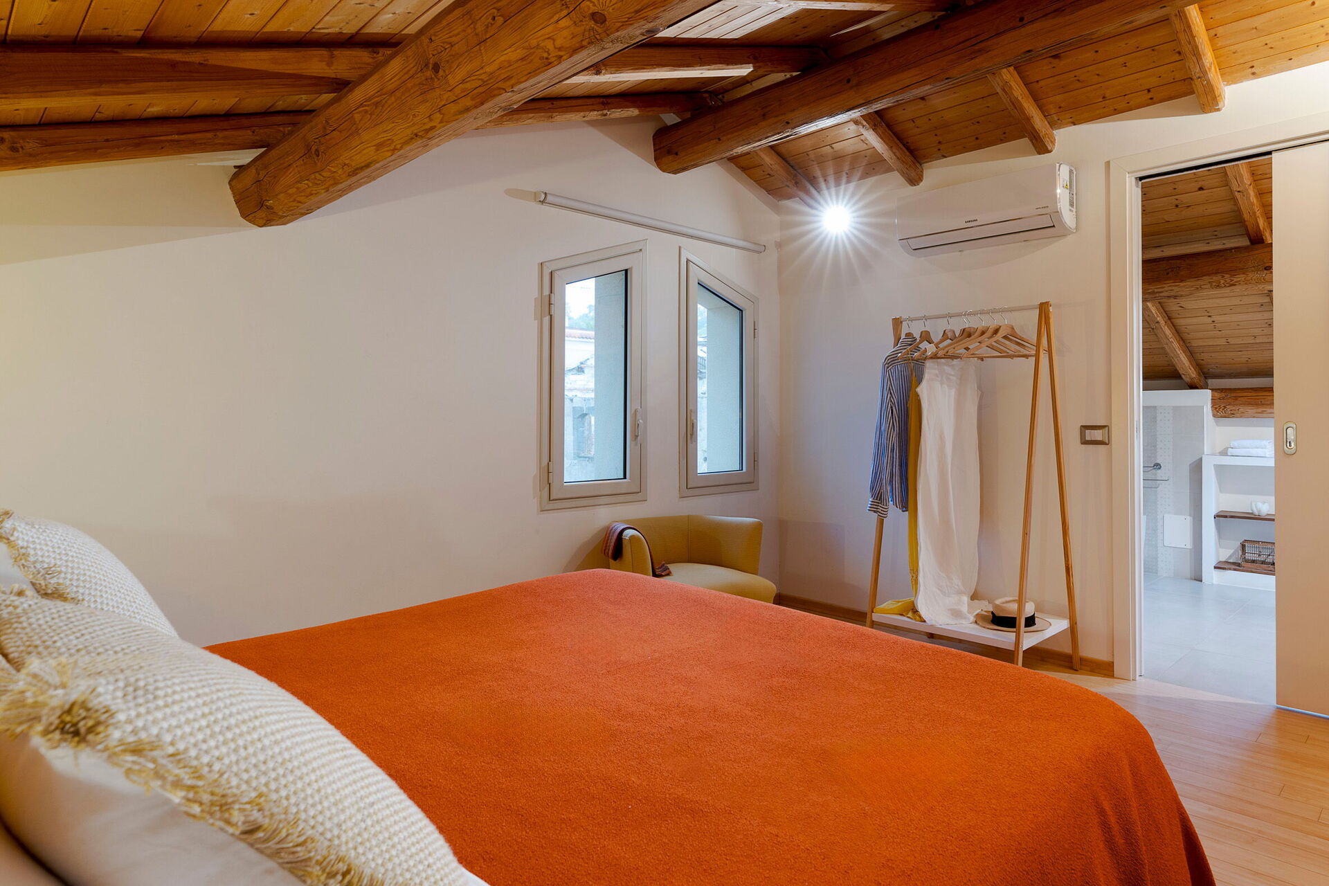 Första våningen (loft): stort vardagsrum, dubbelrum (luftkonditionering, myggnät) med privat badrum med bubbelbadkar.