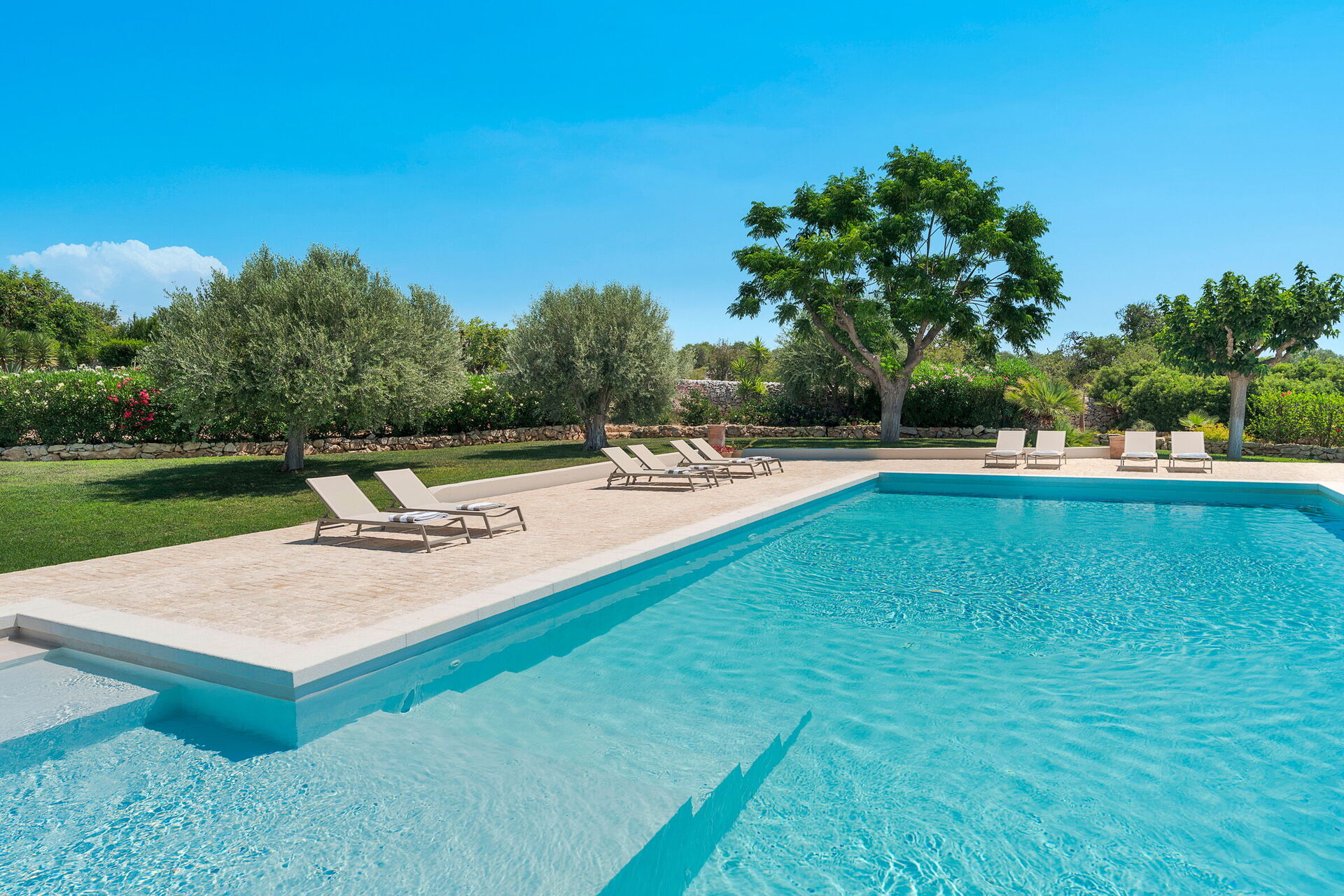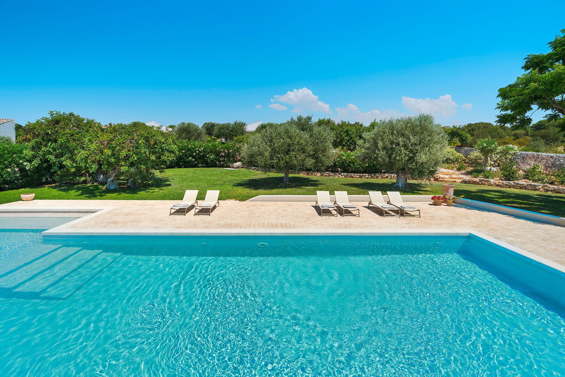 I utkanten av trädgården, med sin gräsmatta och gamla johannesbröd- och olivträd, ligger poolen där du kan svalka dig under de varmaste tiderna på dagen.
