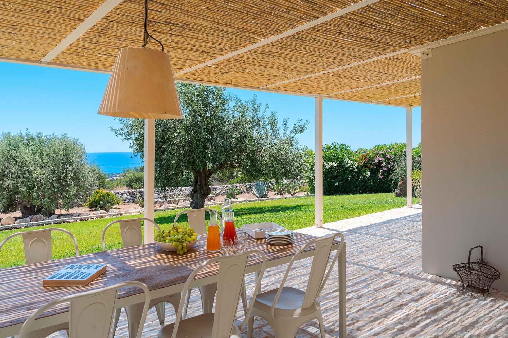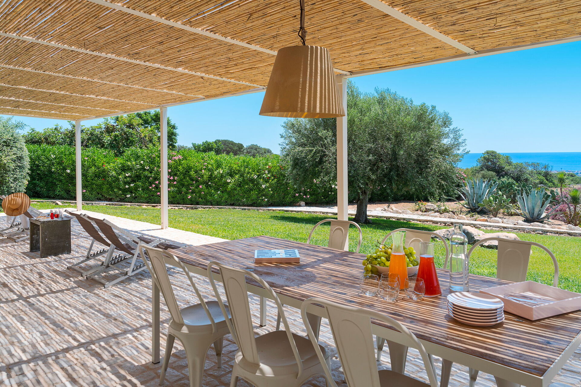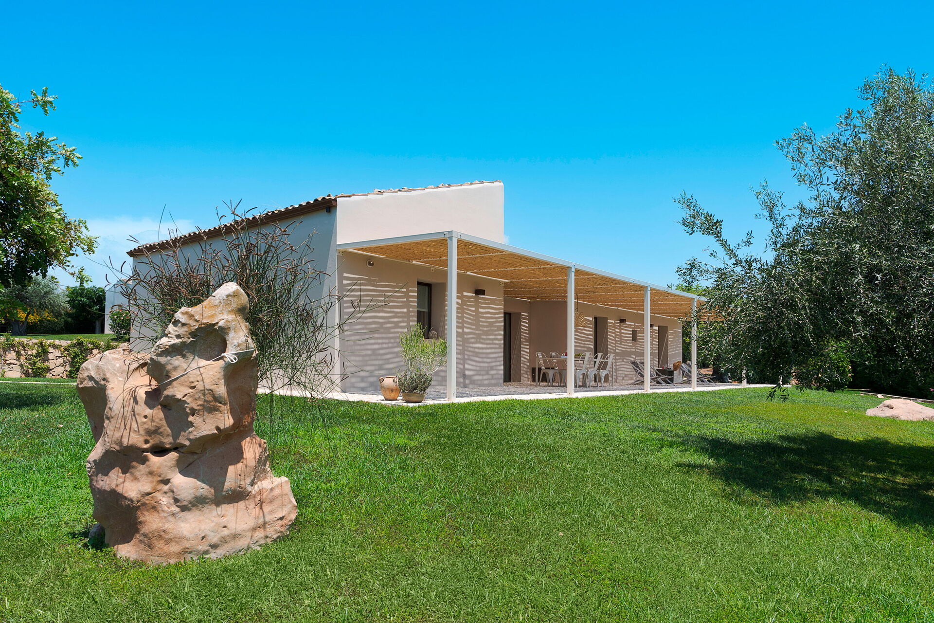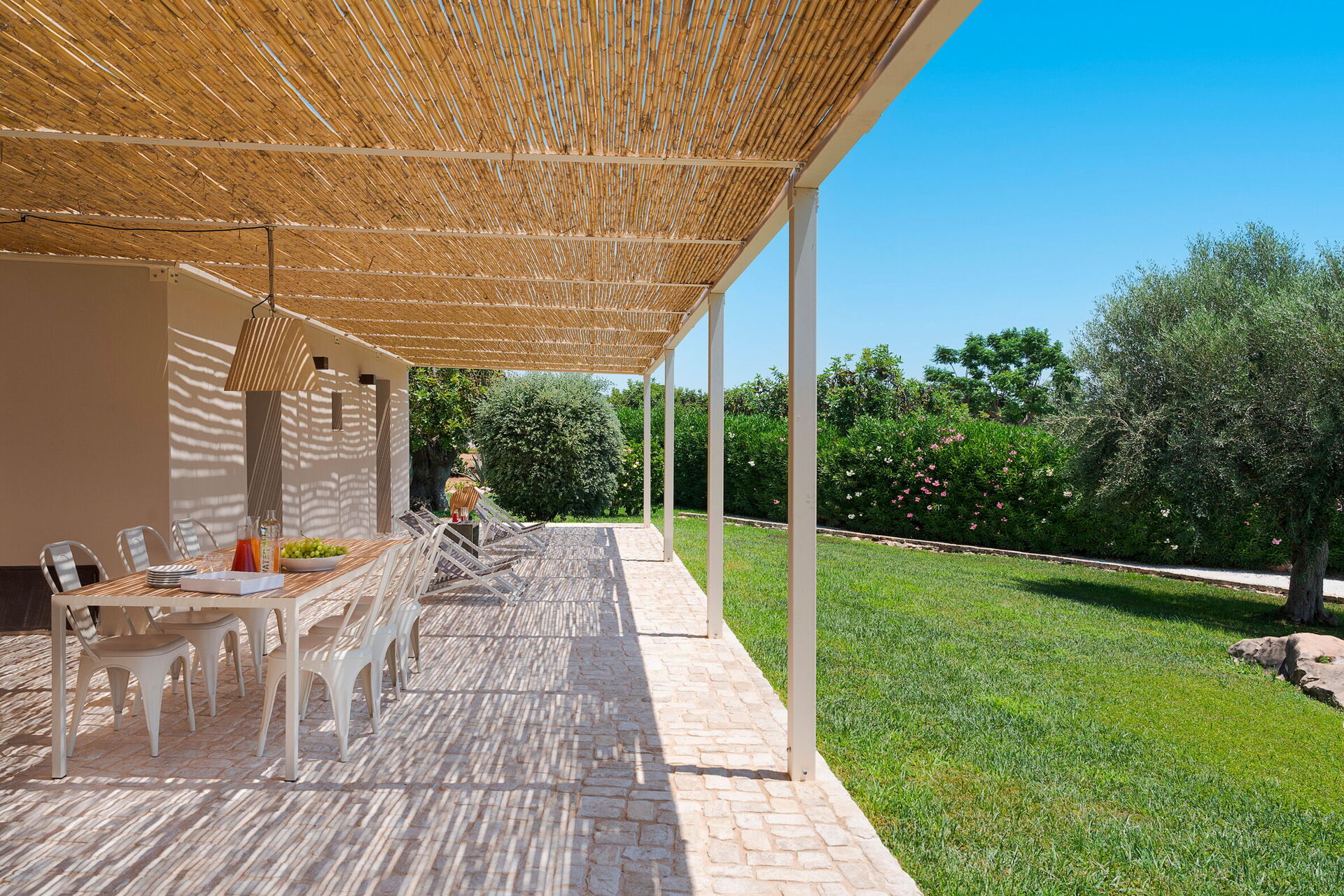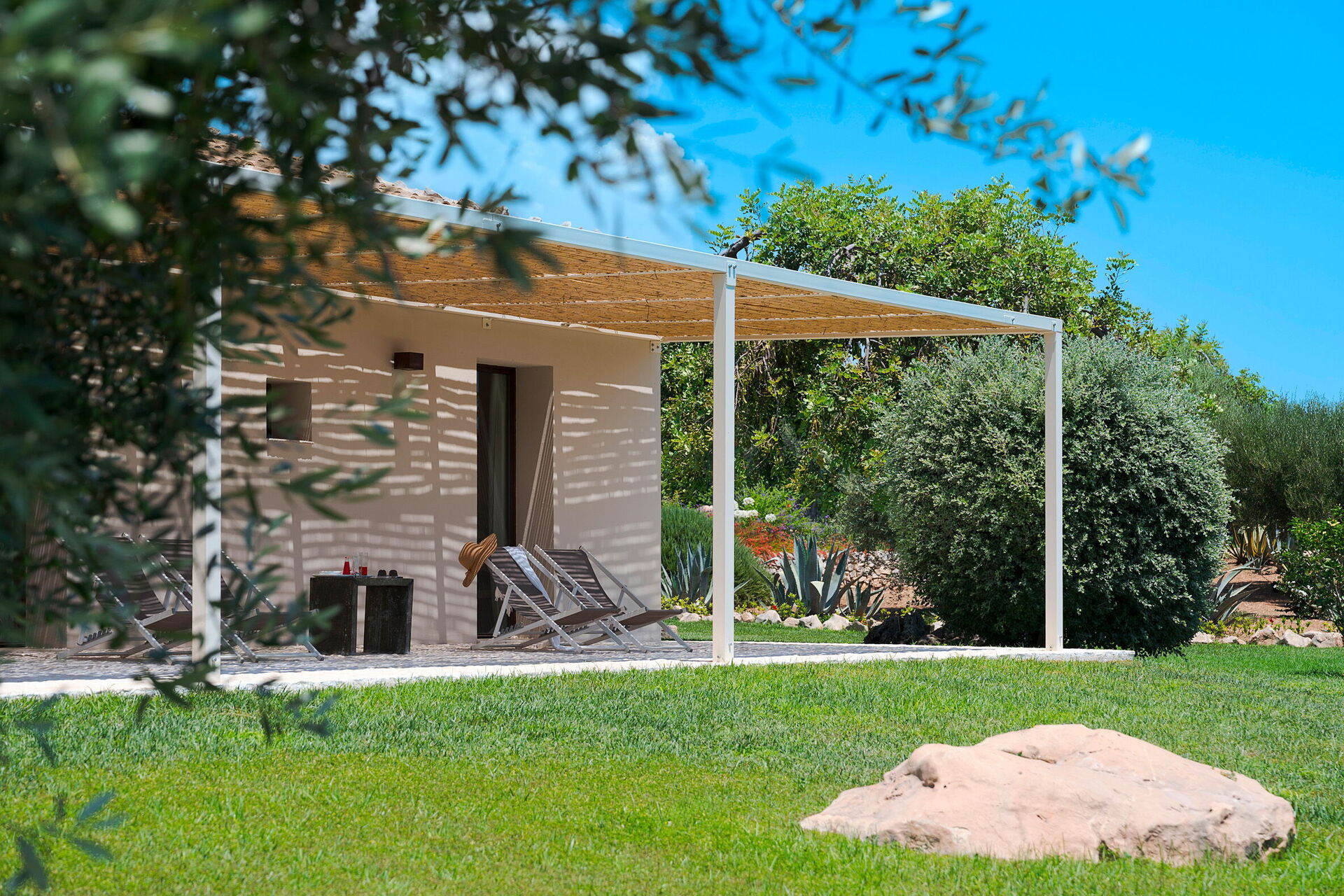 Terrass med pergola, trädgård, gemensam pool