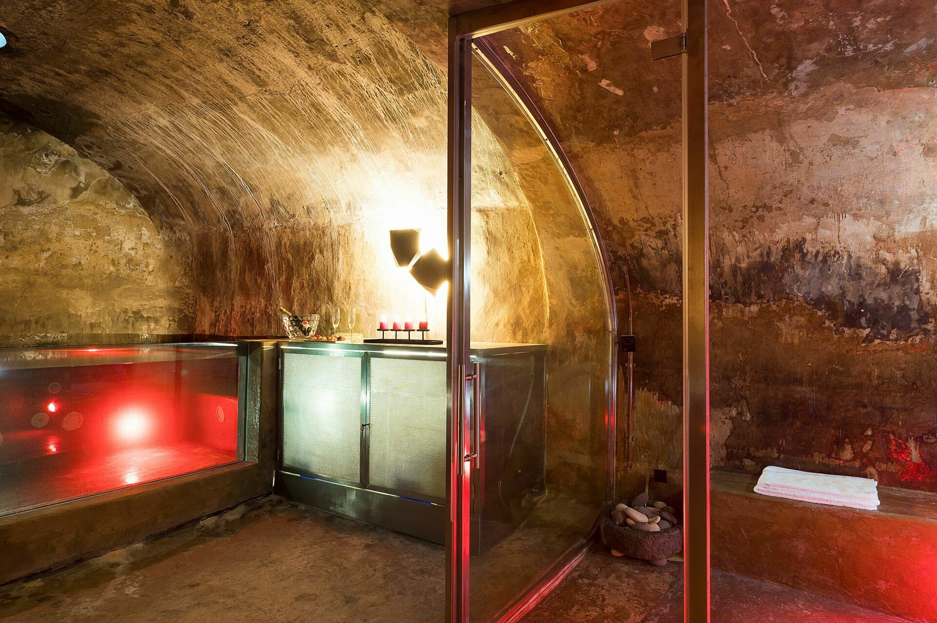 Nedra våningen: hälsocenter med bubbelpool, saltgrotta, bastu, turkiskt bad, flersensisk dusch, avkopplande område