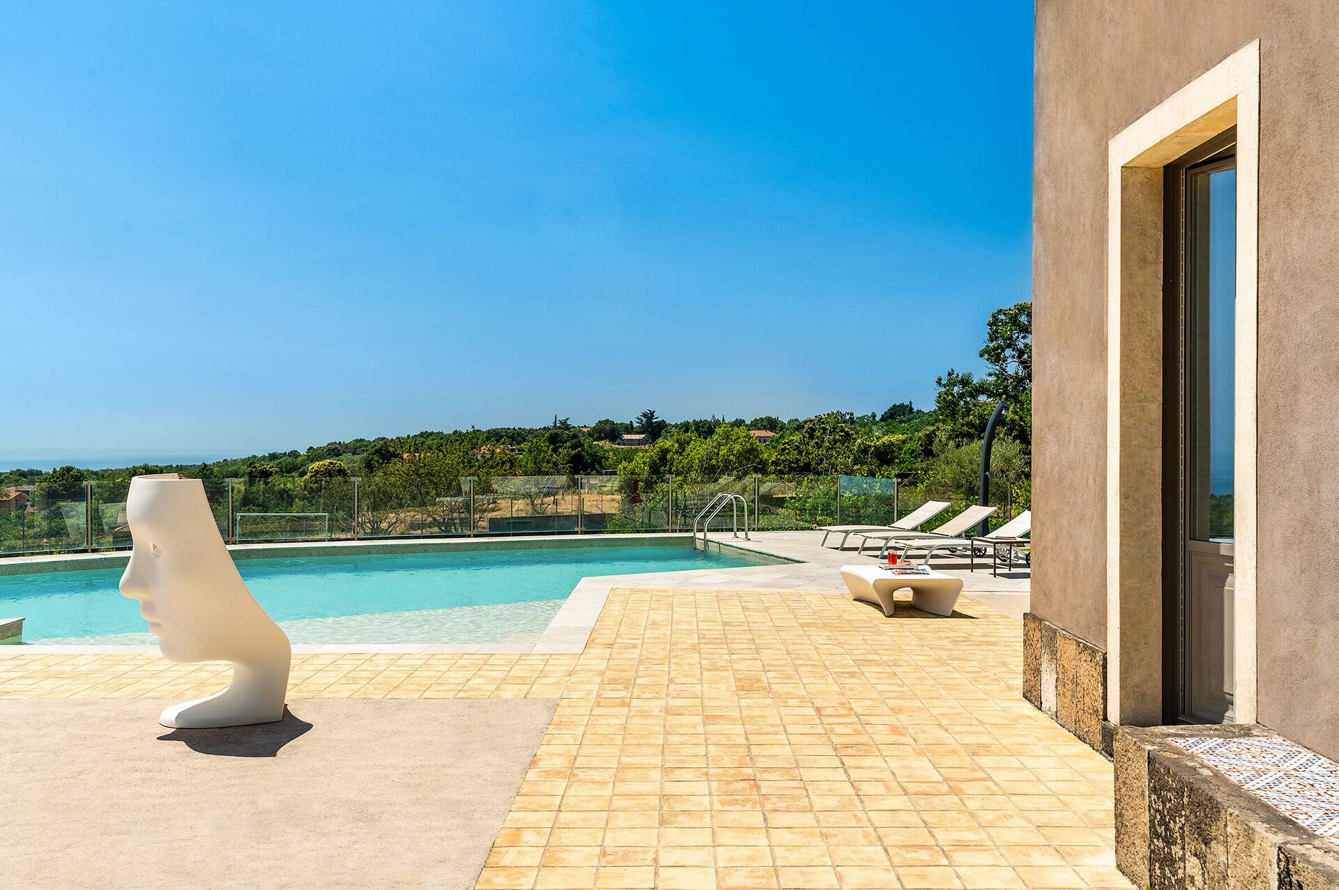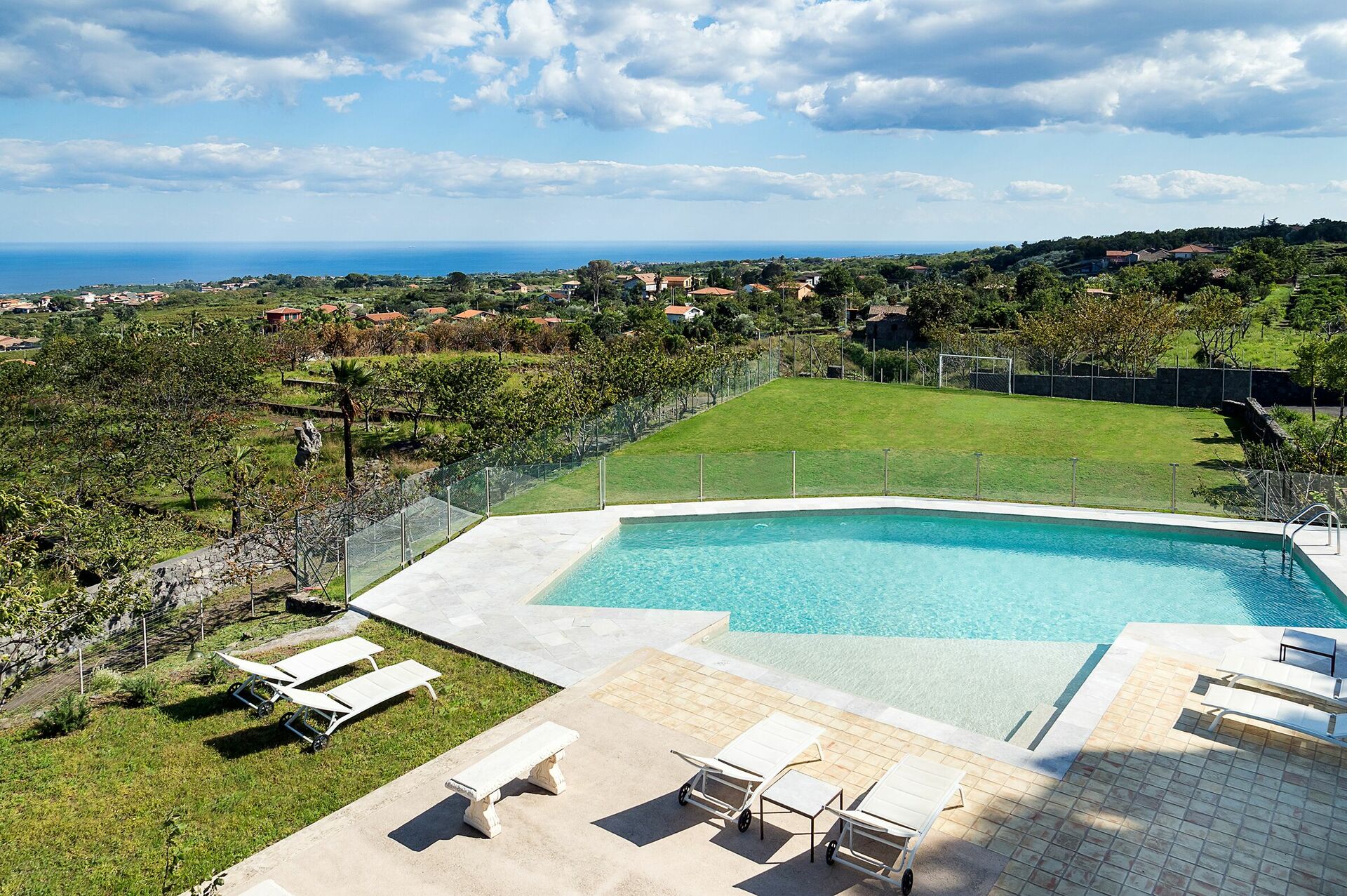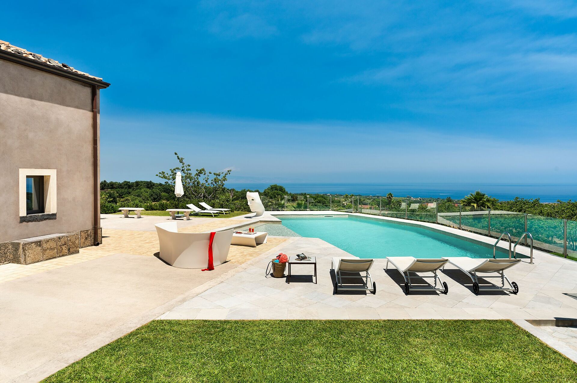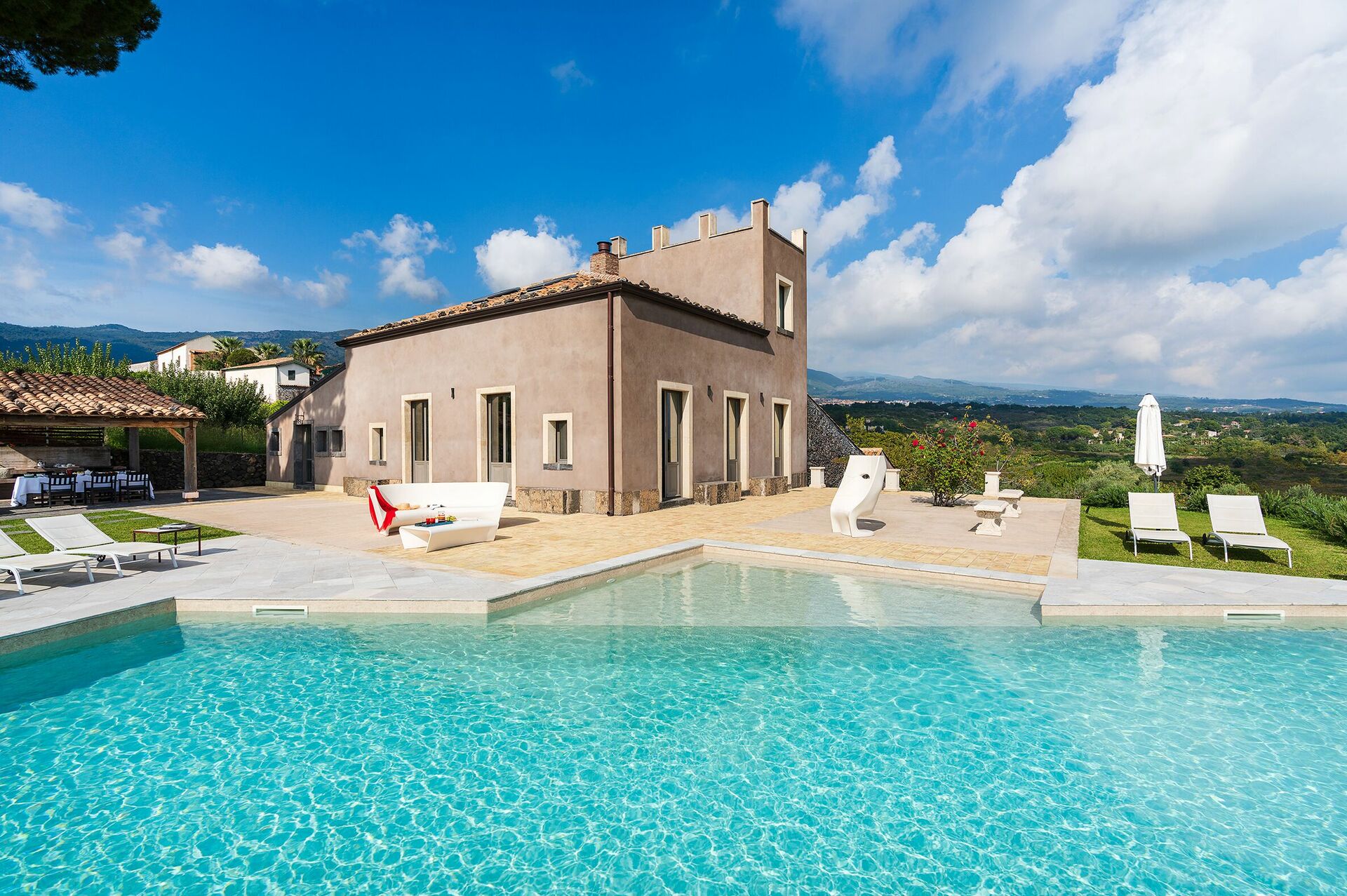 Fastigheten har en underbar saltvattenpool med panoramautsikt över Mount Etna unika naturområde och stora och välutrustade terrasser. Den vackra trädgården har aromatiska växter och ett vackert spa-område med bubbelpool, turkiskt bad, bastu, multi-sensorisk dusch och saltgrotta.