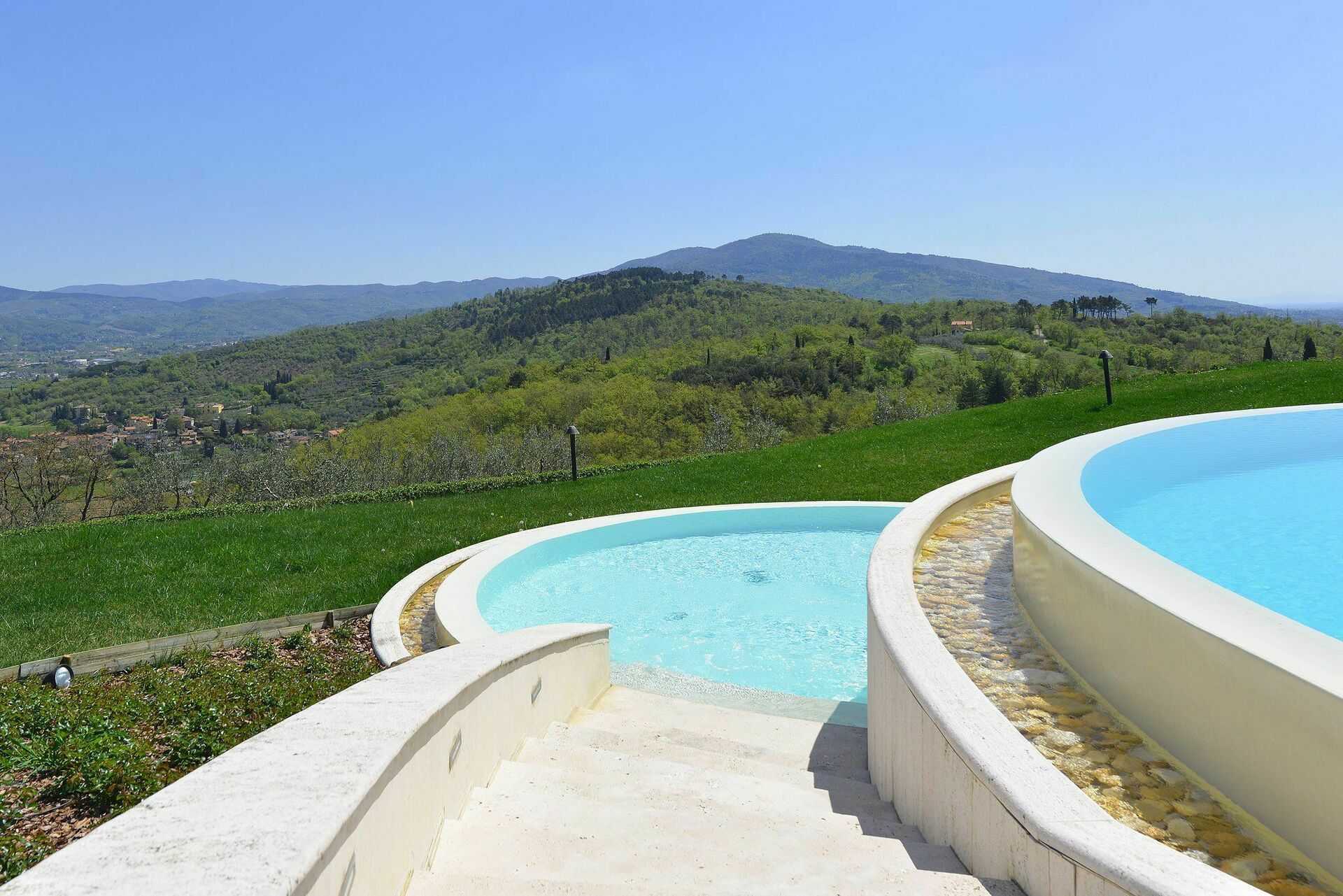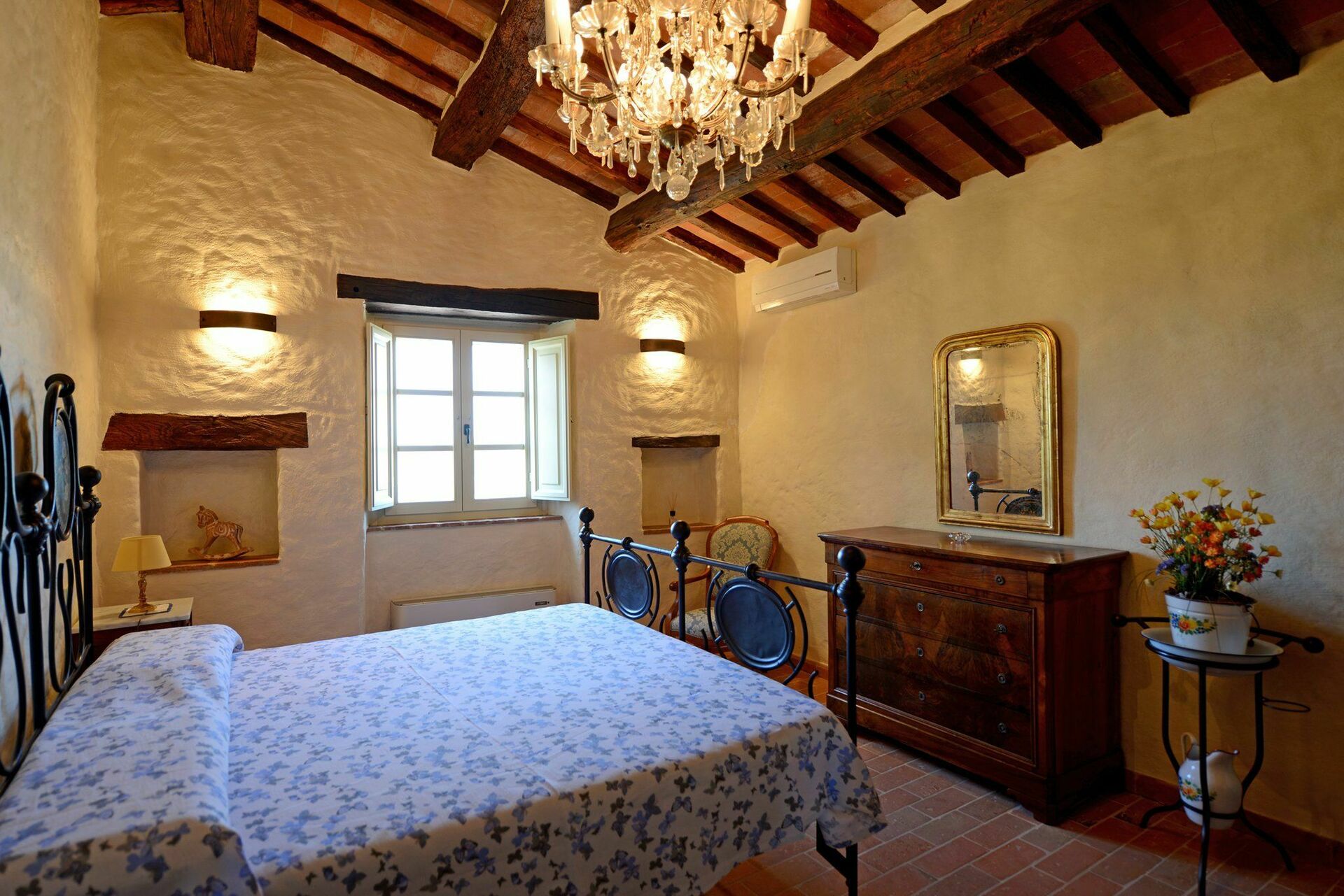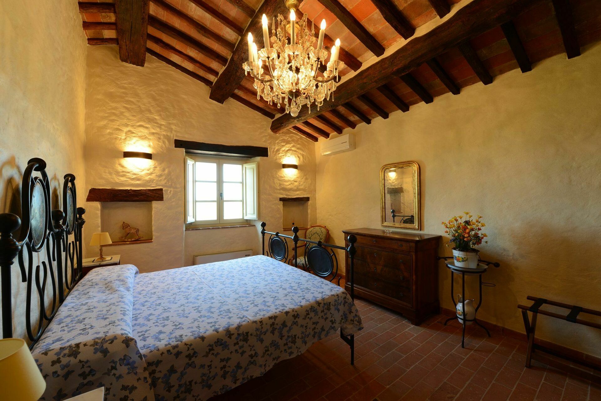 Vacker nyligen renoverad villa belägen på en kulle med utsikt över staden Arezzo och Chiana dalen i Toscana. Fastigheten är helt inhägnad och omfattar ägarnas hus och en charmig liten kyrka med anor från 600-talet. Utanför kan gästerna njuta användning av en stor, välpreparerade trädgård med privat pool som ligger i panoramaläge. Villan delades in i 4 lägenheter som är anslutna internt och uthyrningsbar bara tillsammans som ett privat boende. Interiören är välkomnande och smakfullt inredda. På bottenvåningen finns en stor möblerad veranda perfekt för al-fresco dining.