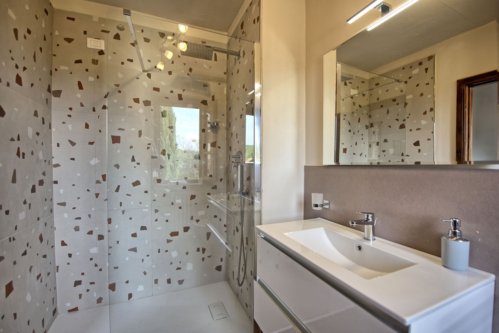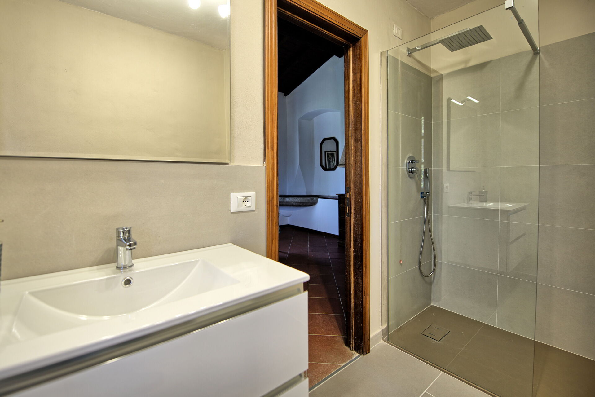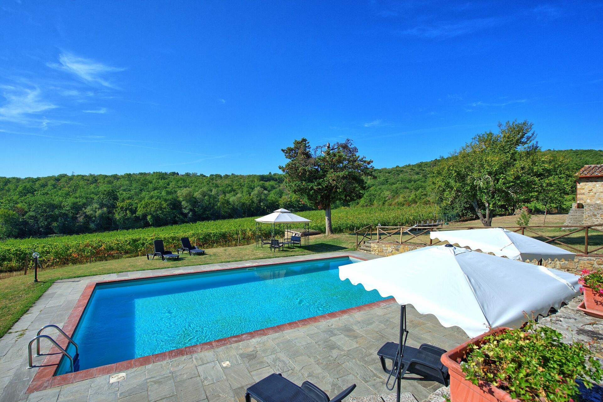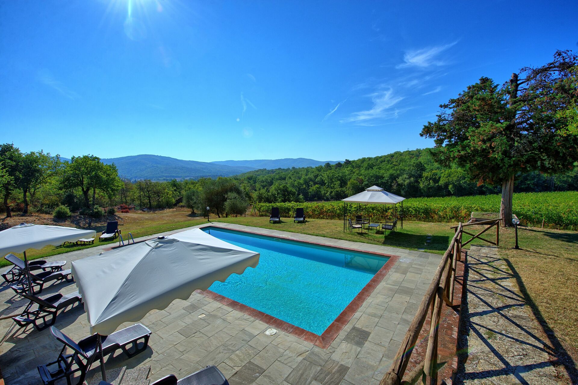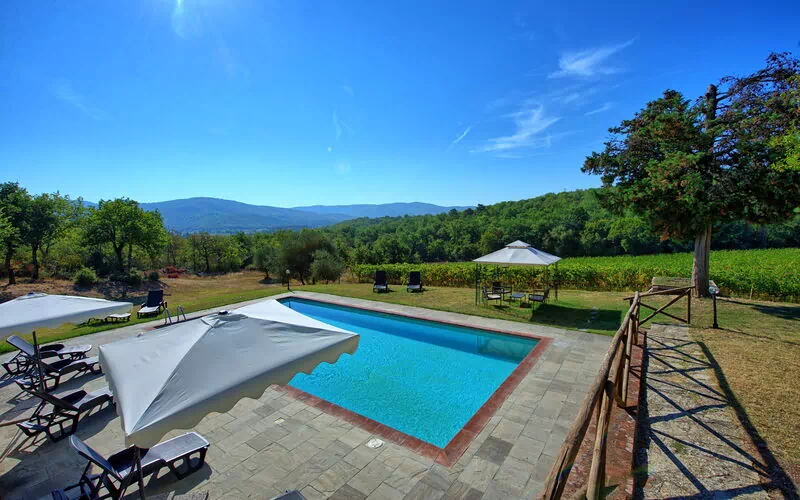 The property is in a beautiful but quiet location surrounded by vineyards and spectacular Tuscan scenery. The apartment was spacious and generally cool inside despite the high temperatures outside. The pool area is superb with extensive paving and plenty of sun-loungers