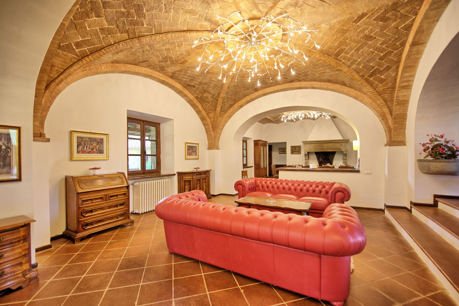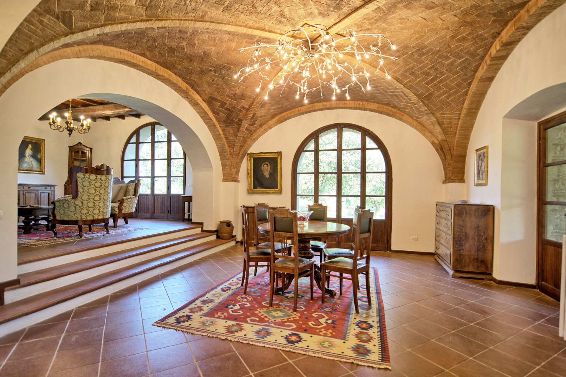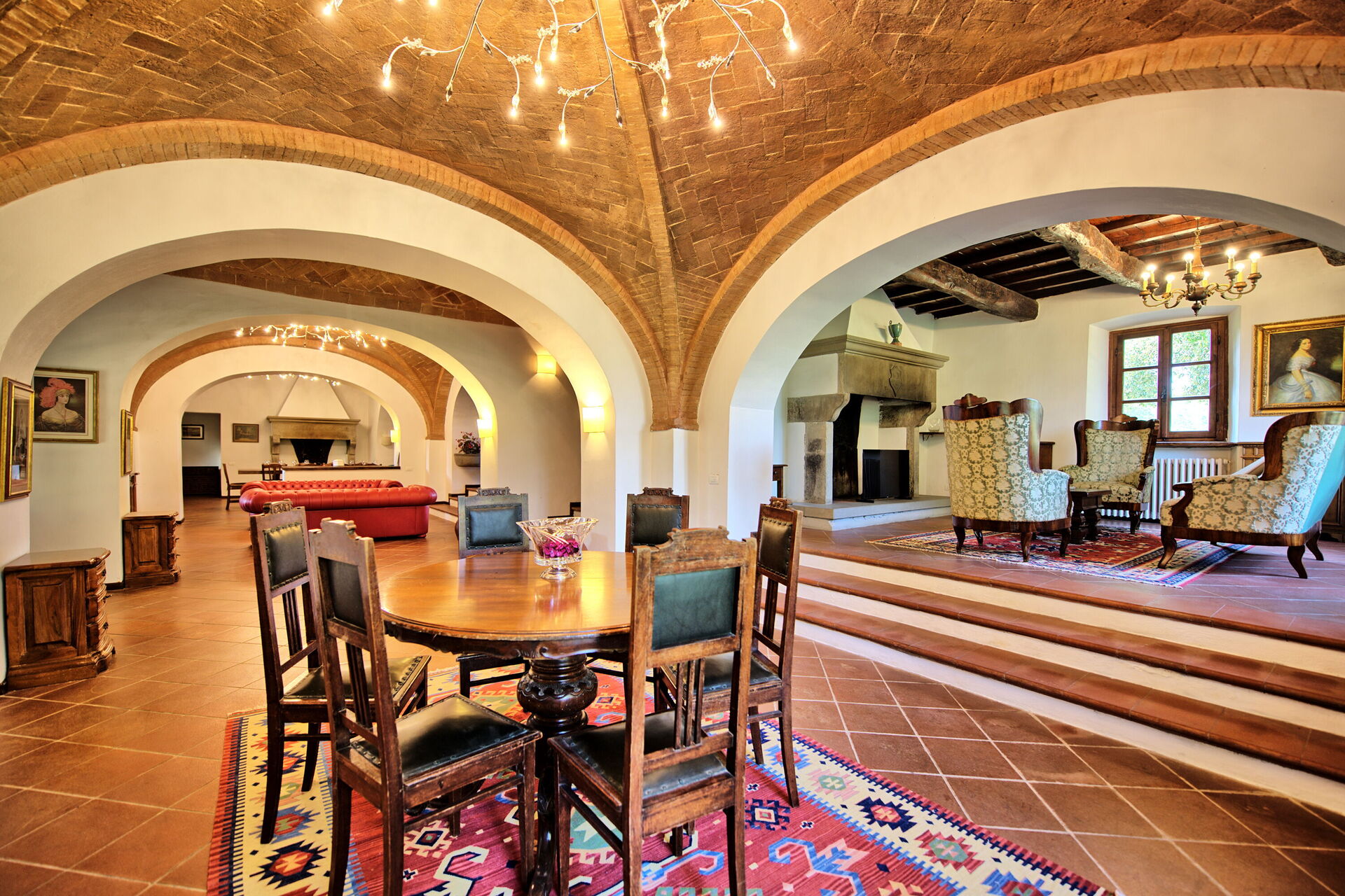 Stort vardagsrum fördelat på tre olika vardagsrum, två av dem med öppen spis och en stor matsal med plats för alla att sitta tillsammans.