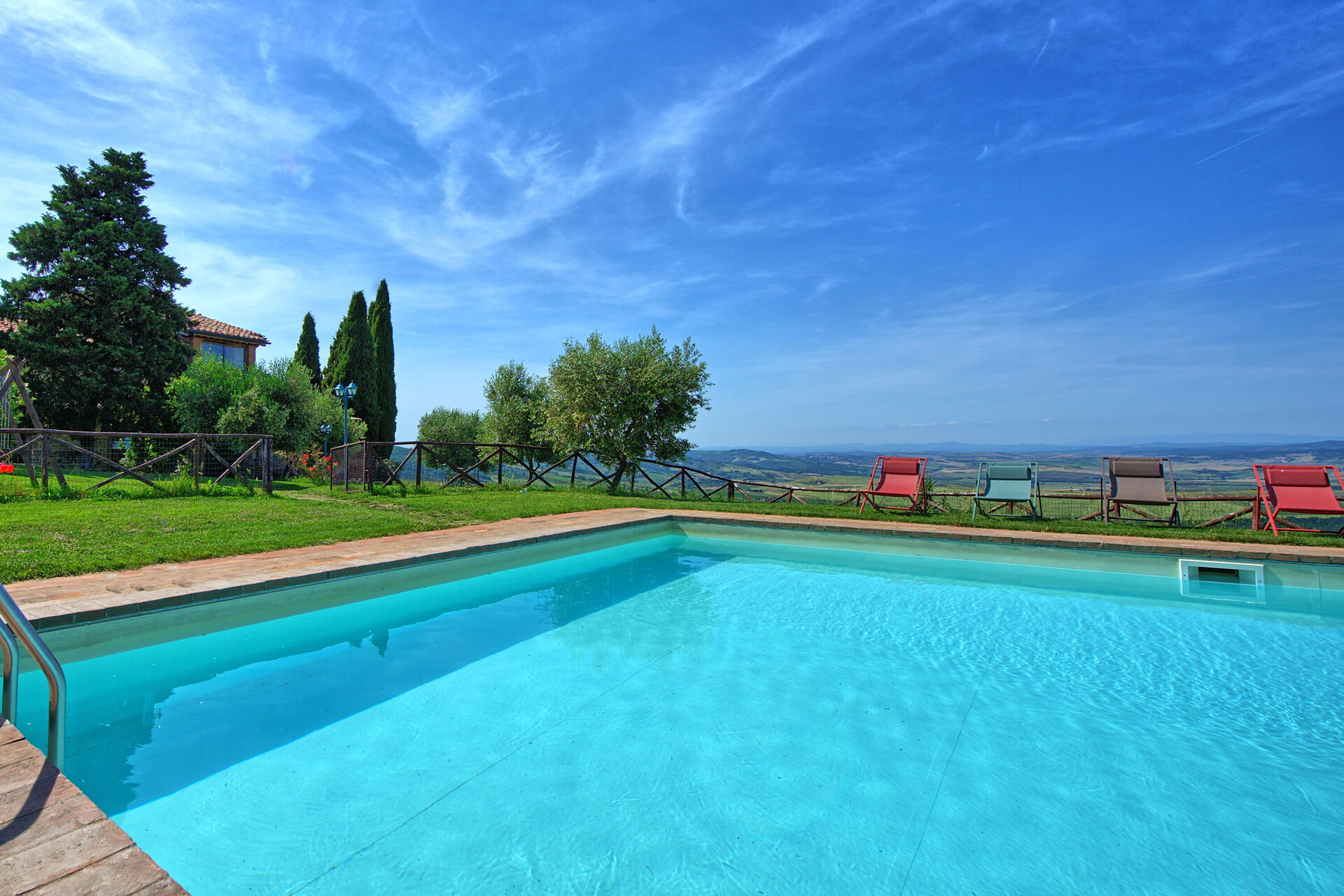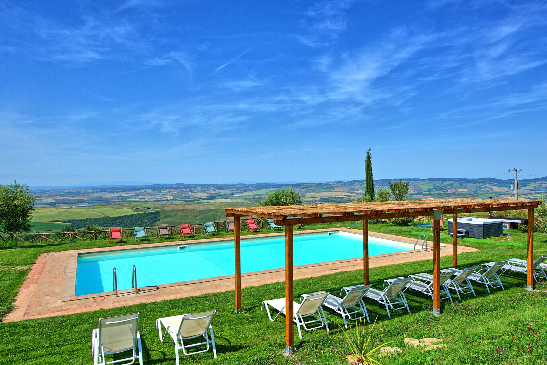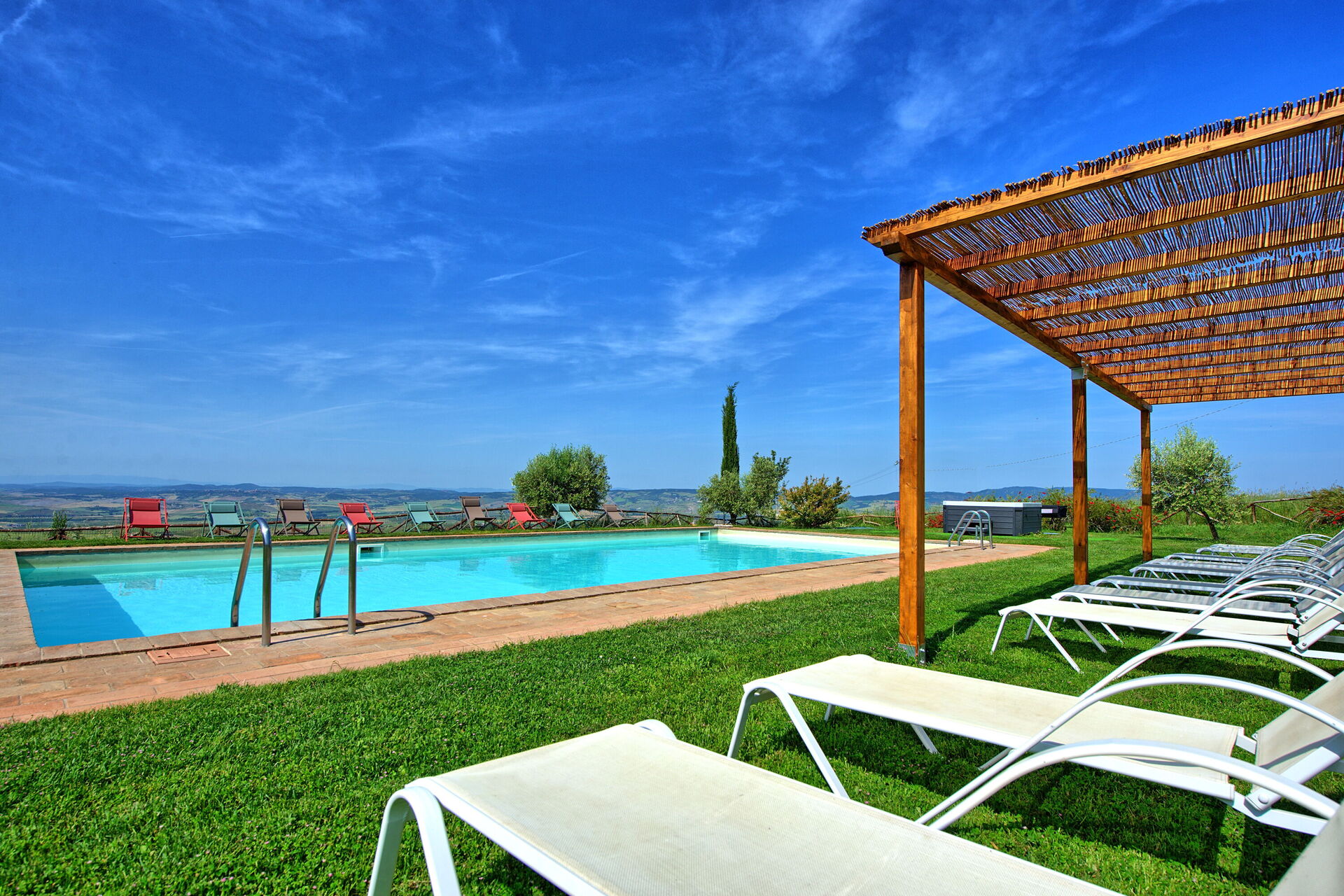 Villa med privat pool och jacuzzi att hyra i Val d'Orcia söder i Toscana. Semesterhuset är omgiven av en stor trädgård och erbjuder panoramautsikt över dalen nedanför.